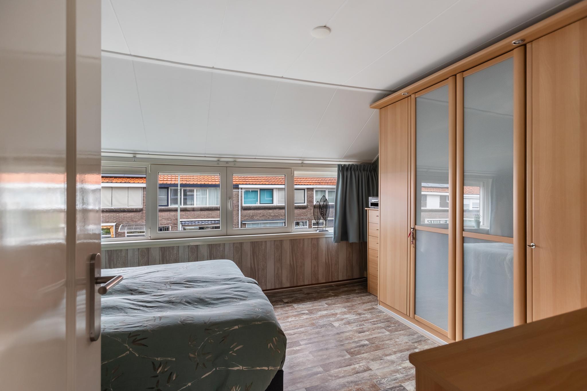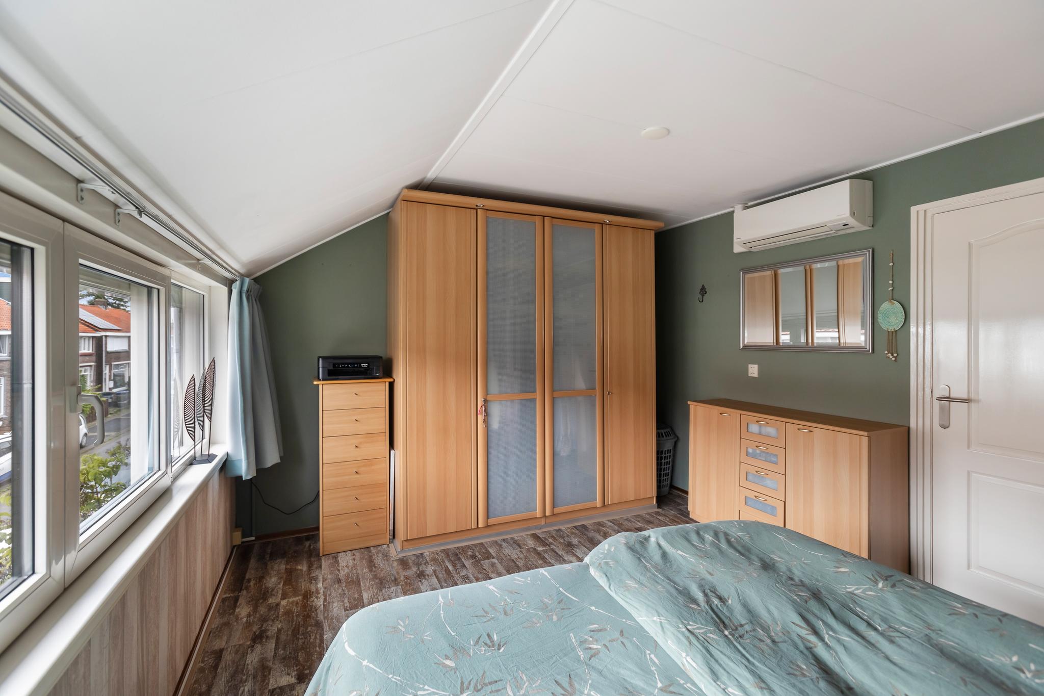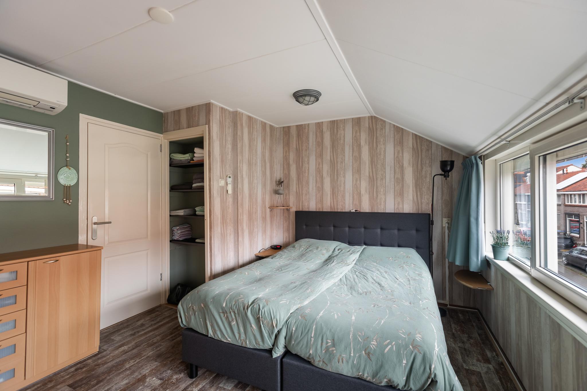 Ruime slaapkamer aan voorzijde, deze kamer beschikt over airconditioning (2020), elektrische rolluiken (2022), behang wandafwerking, een laminaatvloer en vaste kast.