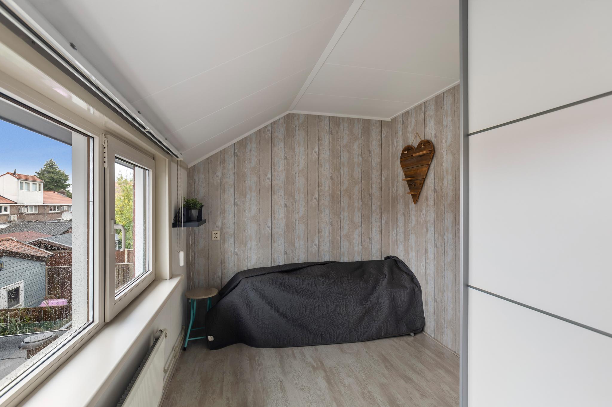 Slaapkamer aan achterzijde, eveneens voorzien van een laminaatvloer en behang wandafwerking.