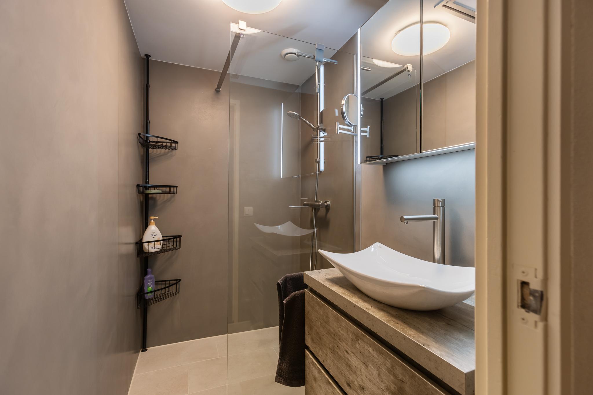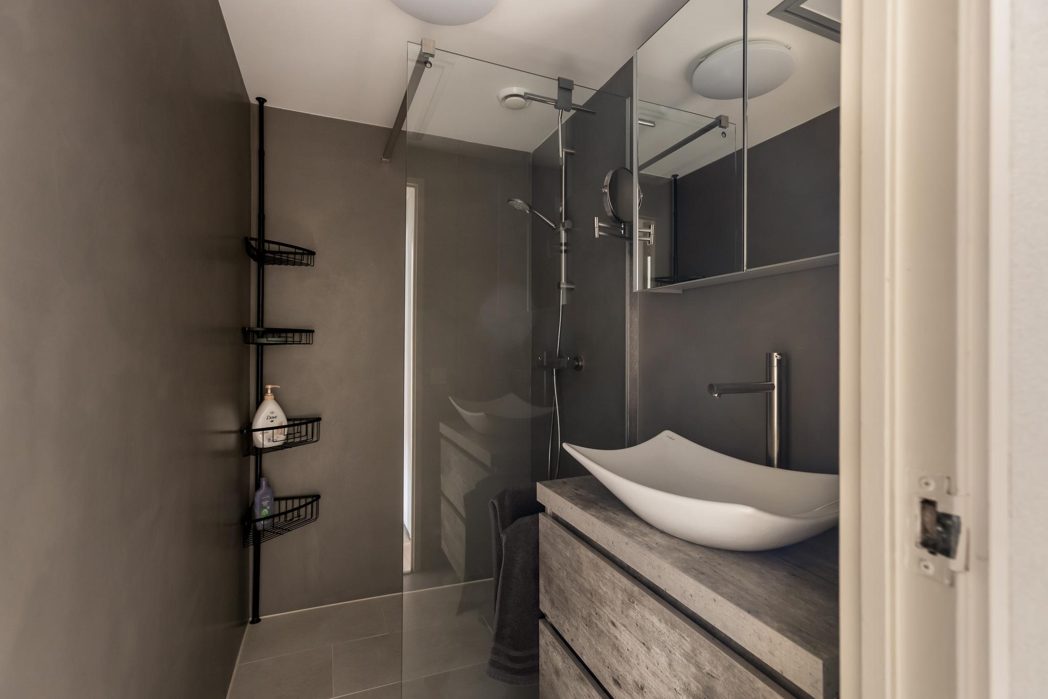 De badkamer (inpandig) is in 2021 vernieuwd, deze beschikt over een wastafelmeubel met waskom en spiegelkast, een ruime douche met thermostaatkraan en mechanische ventilatie. De wanden zijn met beton cire afgewerkt, wat de badkamer een moderne en strakke uitstraling geeft.