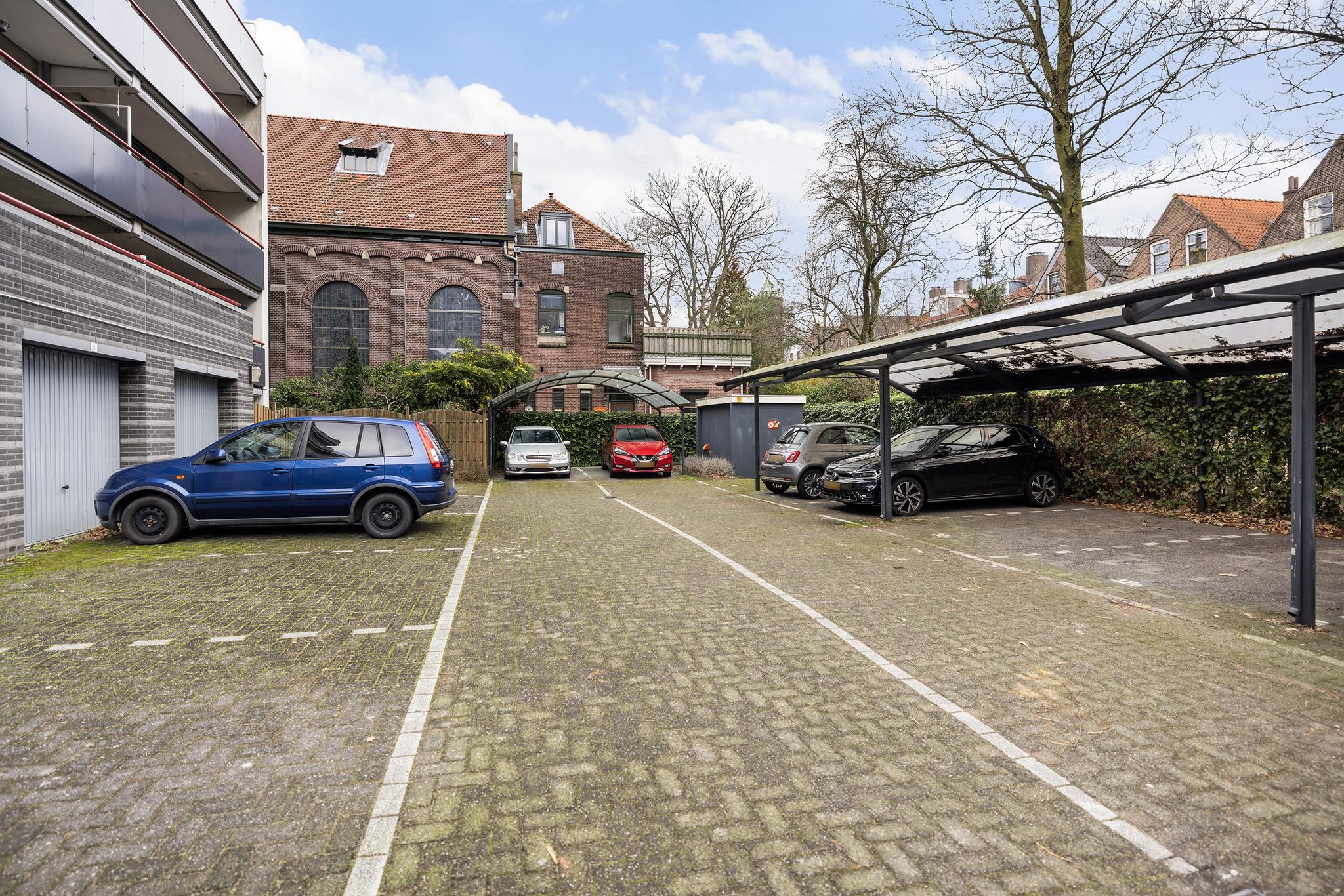 Op het achtergelegen en afgesloten parkeerterrein beschikt het appartement over een eigen parkeerplaats onder een carport.