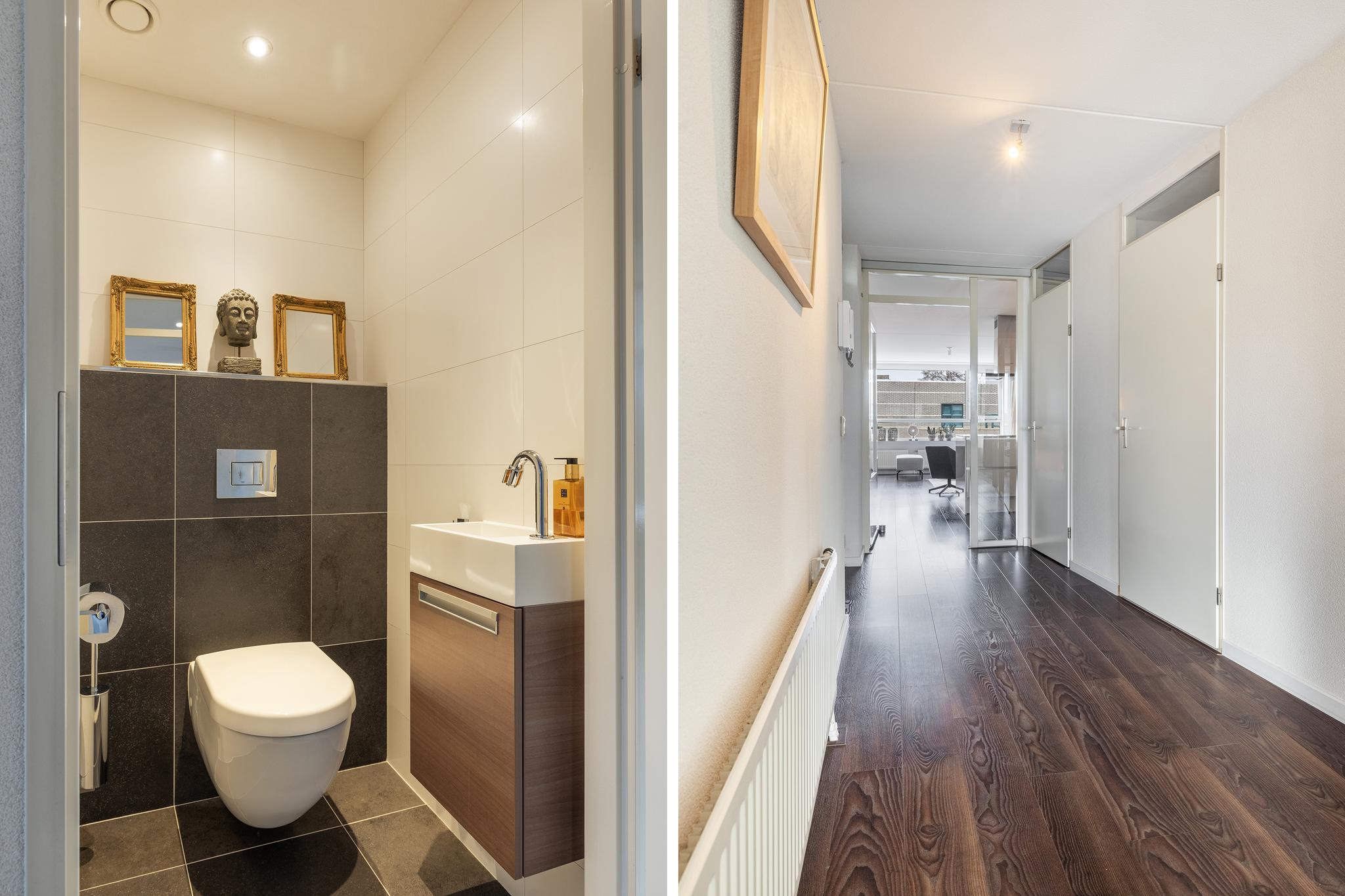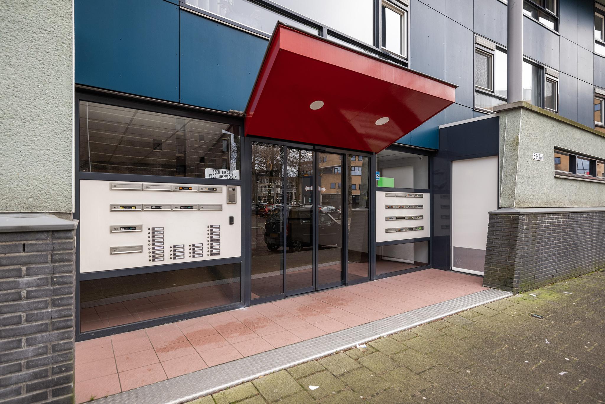 Beveiligde entree met bellentableau en brievenbussen, toegang tot de portiek middels trap en lift. In de onderbouw beschikt het appartement over een eigen berging.