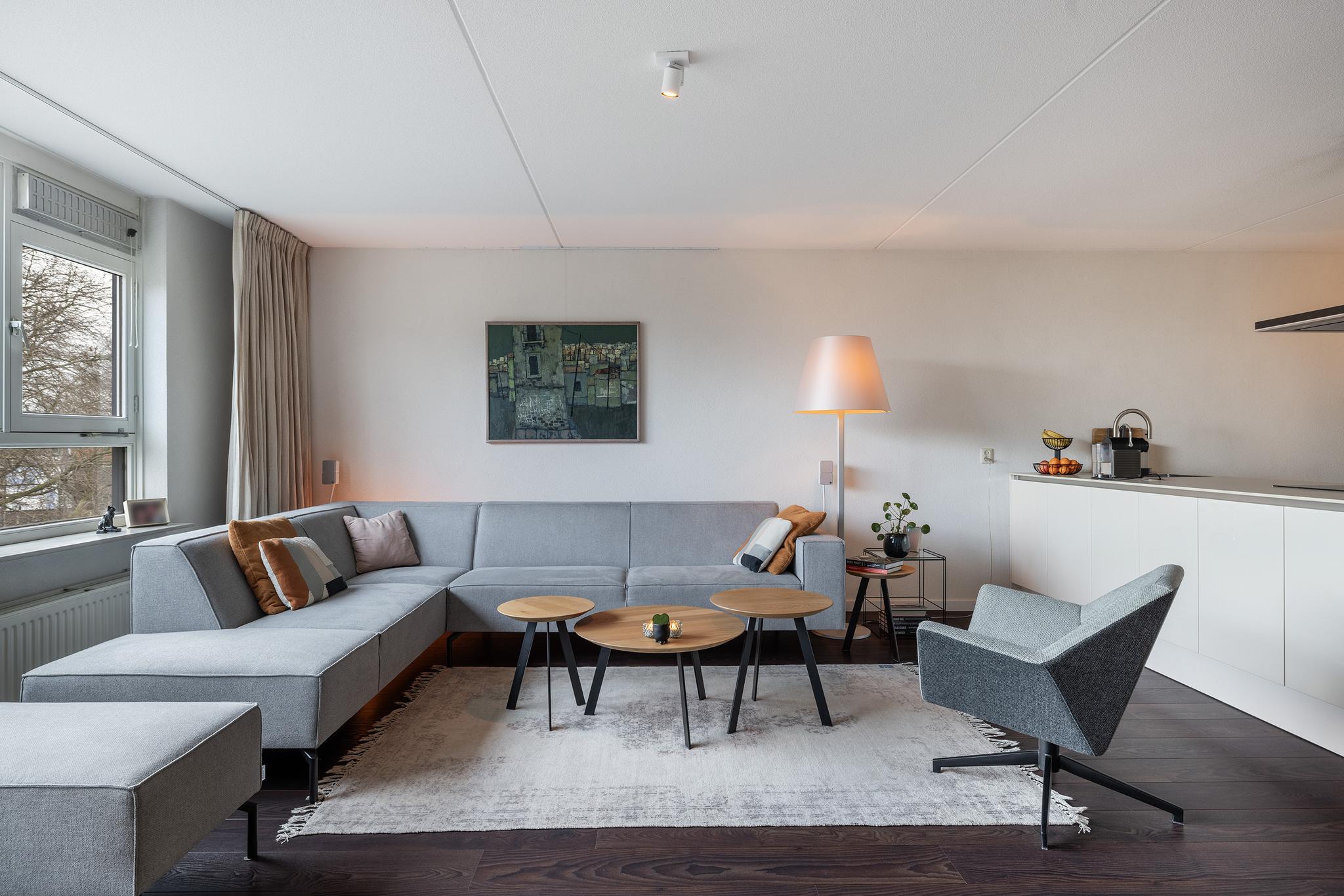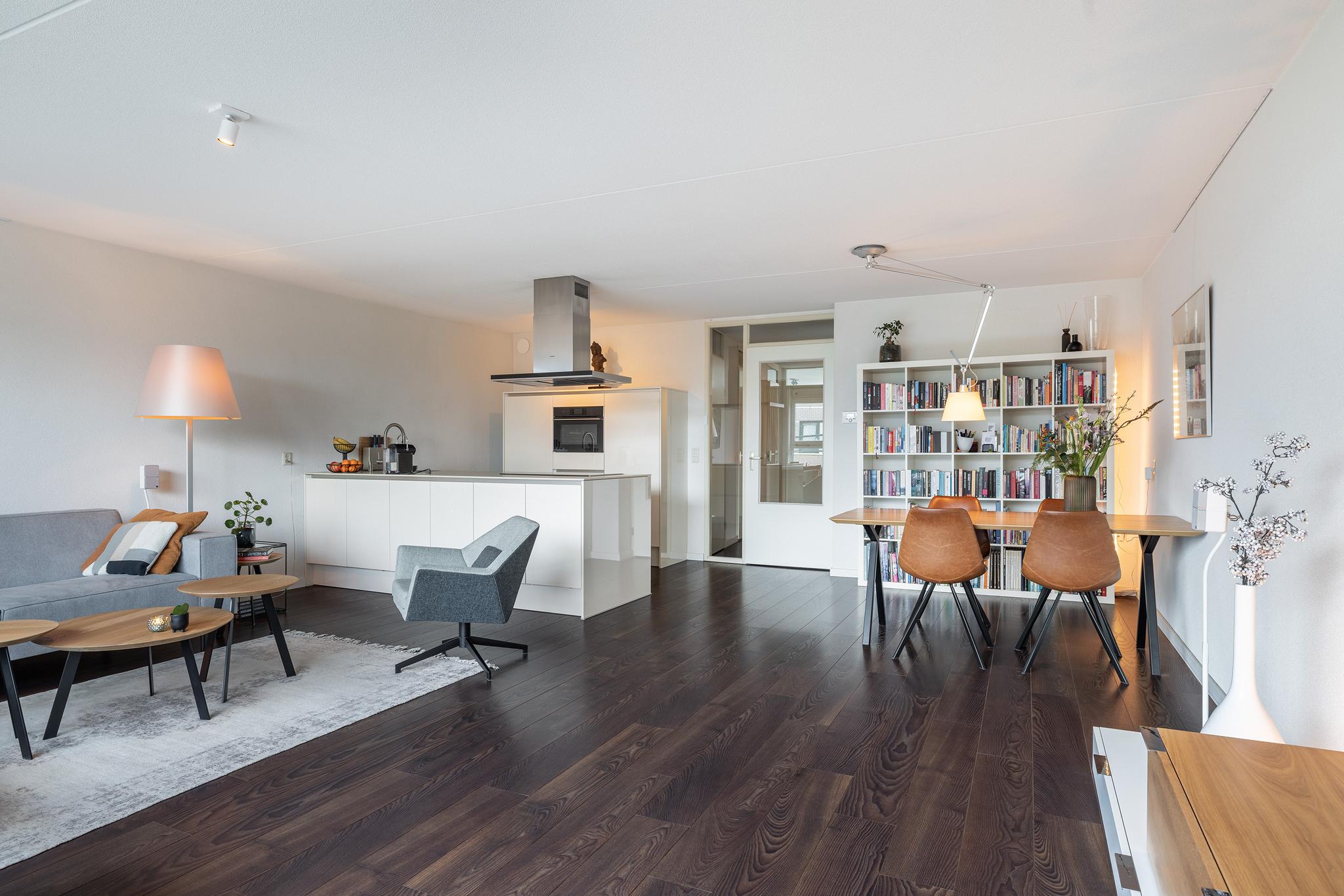 Aan de voorzijde van het appartement bevindt zich de lichte en ruime woonkamer met open keuken. De woonkamer is voorzien van een mooie laminaatvloer, spagtelputz wandafwerking en grote raampartijen. In 2008 is de keuken vervangen door een wandopstelling met schiereiland, waardoor de woonkamer nog ruimtelijker aanvoelt.