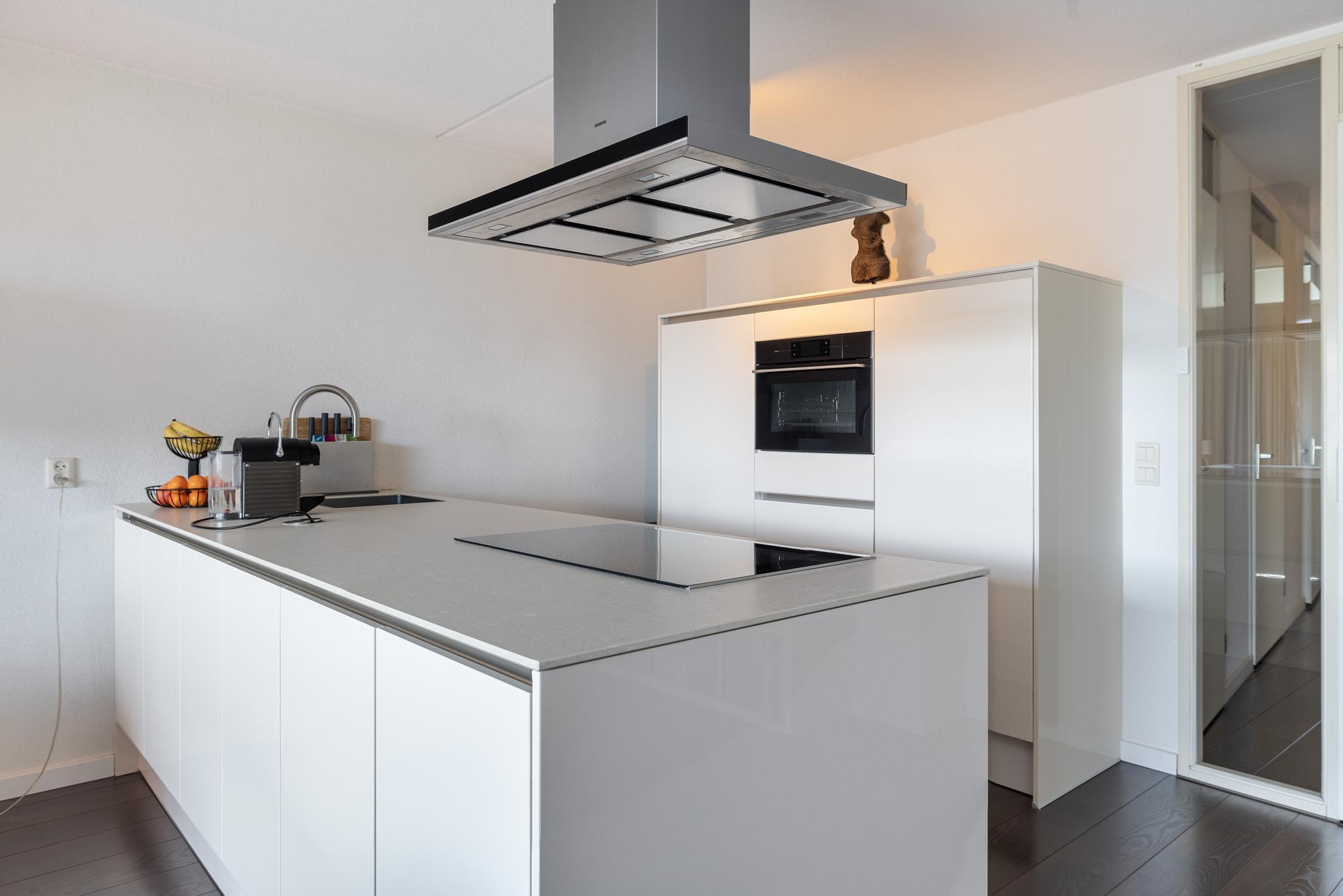 De moderne open keuken bestaat uit een wandopstelling en schiereiland en is voorzien van een inductie kookplaat met afzuigkap met plasma filter, combi stoomoven (Atag), koelkast met vriesvak, vaatwasser, Quooker kraan en zeeppomp en een composiet werkblad.