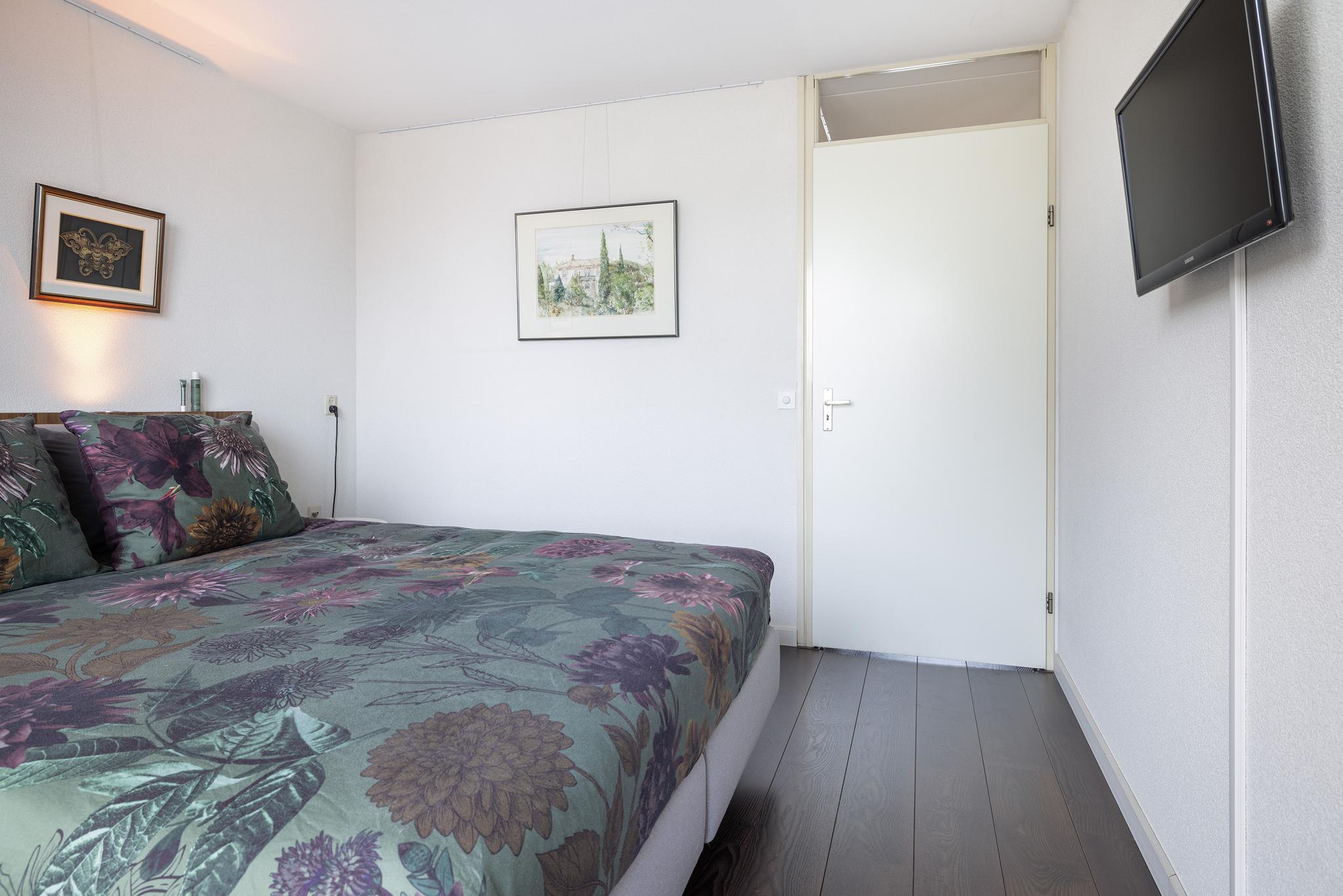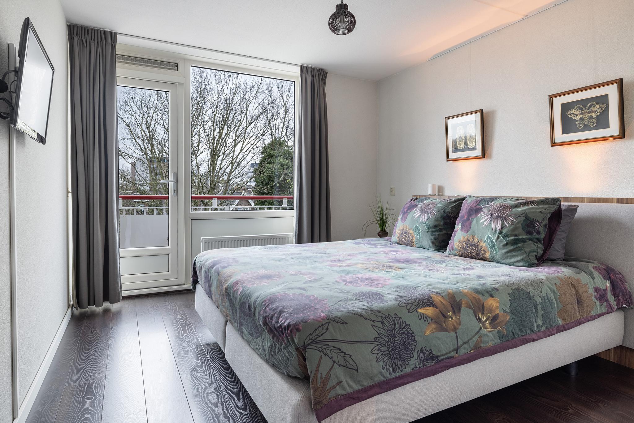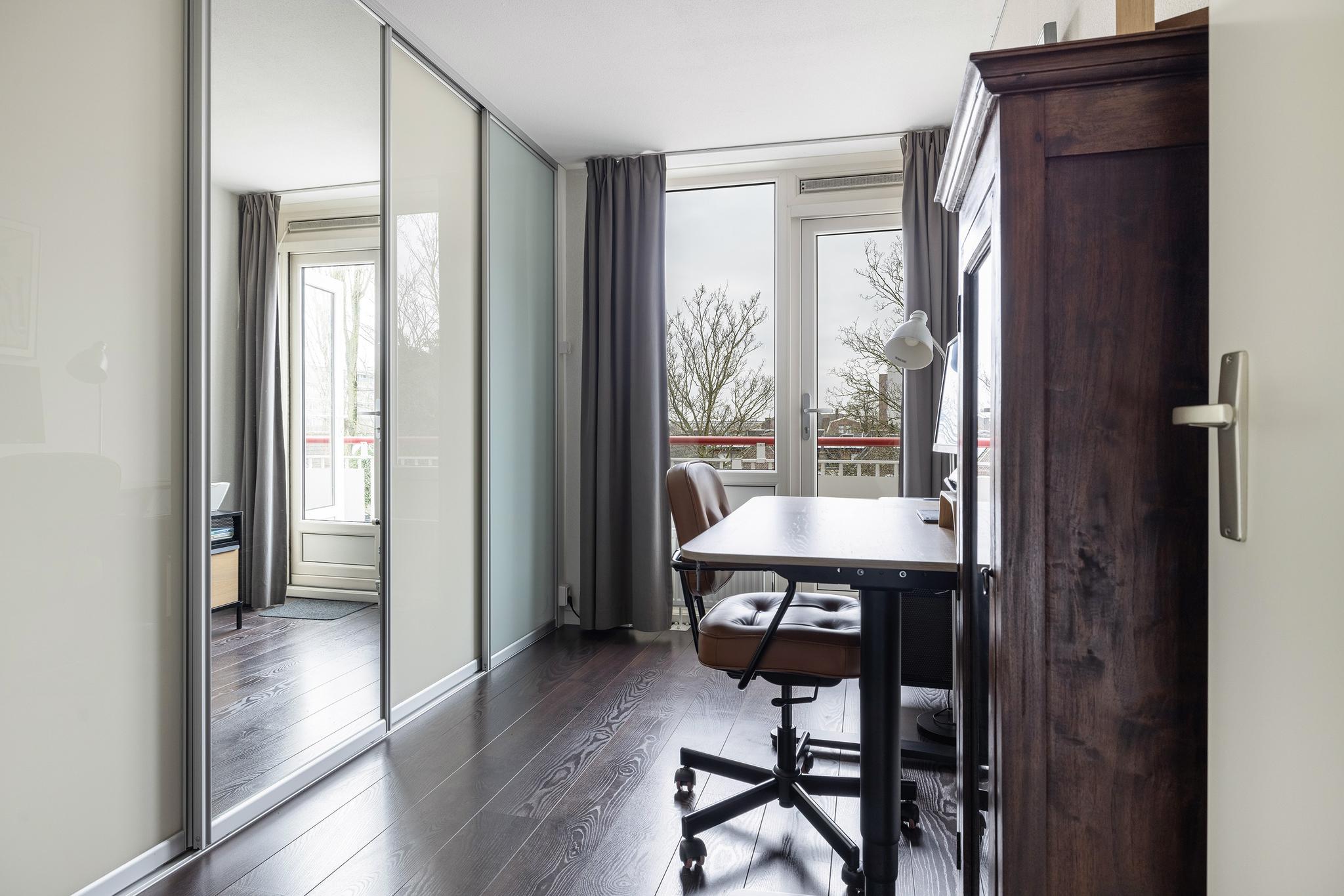 Aan de achterzijde bevindt zich een ruime slaapkamer met toegang tot het balkon. Daarnaast gelegen is de tweede slaapkamer, voorzien van een vaste schuifkastenwand en eveneens toegang tot het balkon. Beide slaapkamers zijn voorzien van kunststof kozijnen met horren.