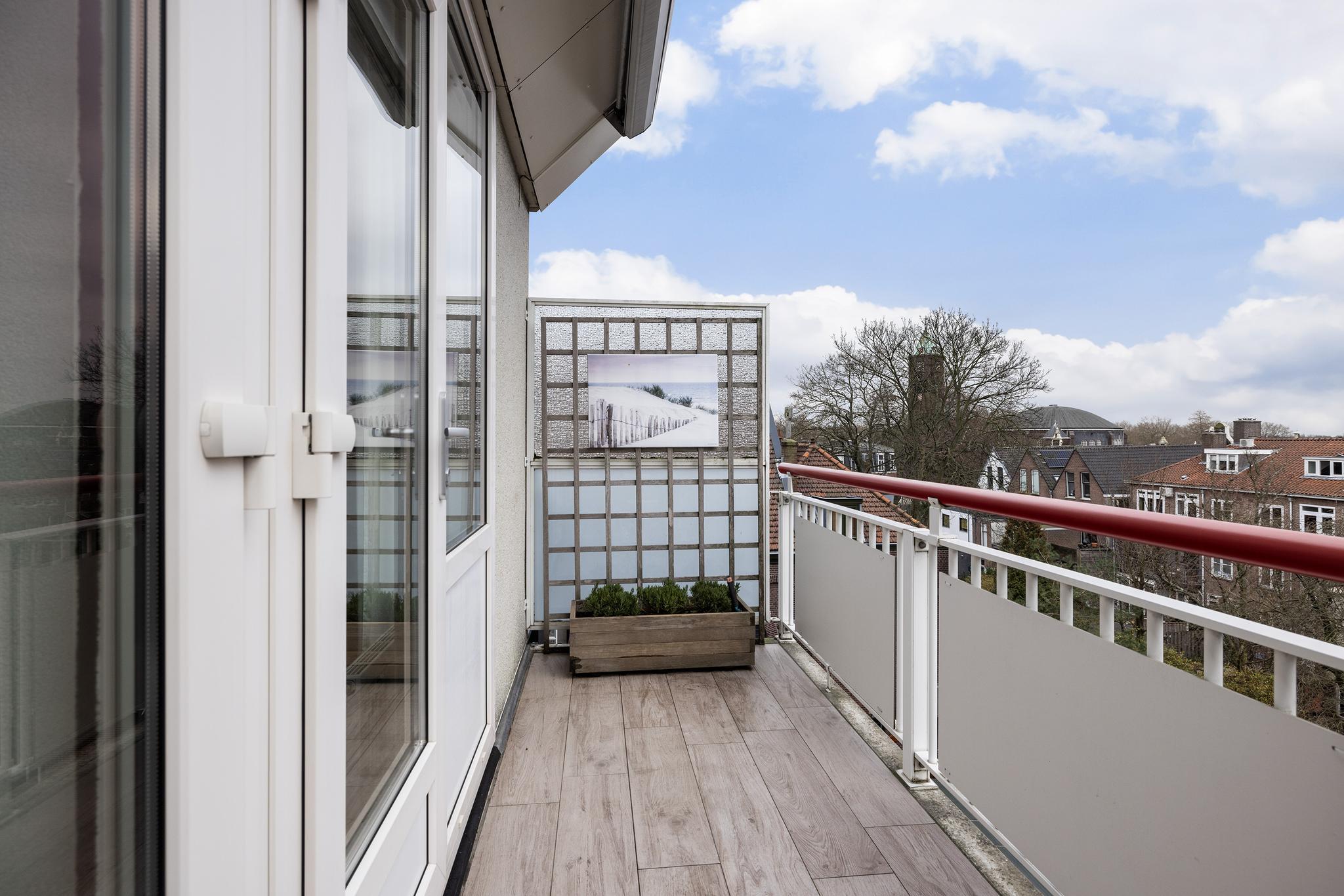 Het balkon is gelegen op het zuiden en is voorzien van keramische tegels. Je zit hier heerlijk rustig en met een mooi uitzicht over de 19e-eeuwse schil.