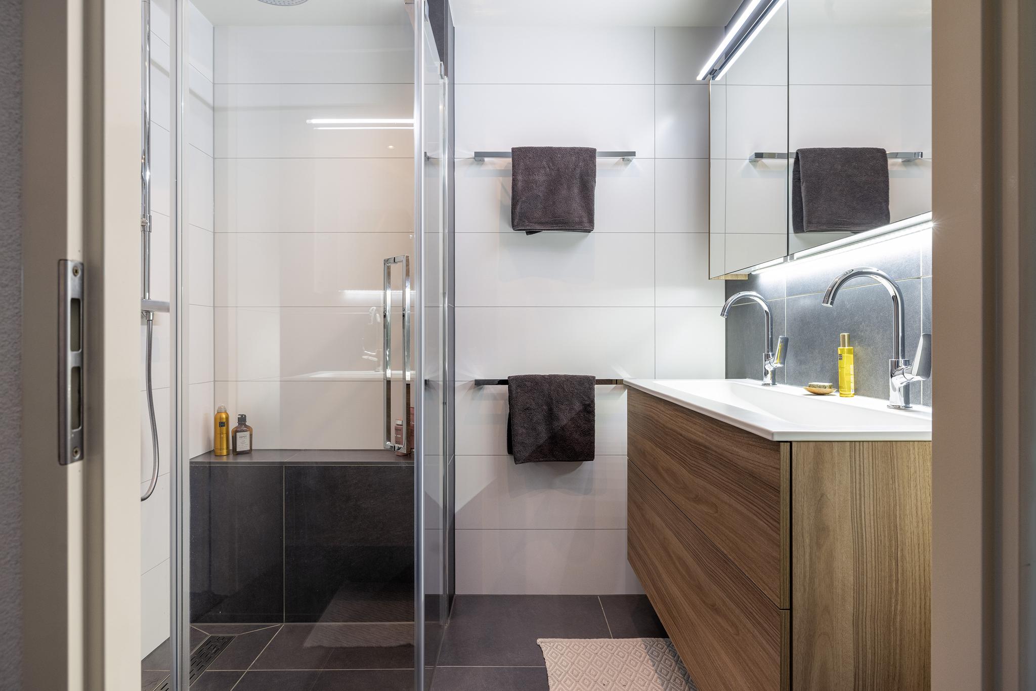 De badkamer is in 2021 vernieuwd en beschikt over een douche met thermostaatkraan, regendouche en handdouche, een wastafelmeubel met brede wastafel en dubbele kraan, een spiegelkast, een bergkast, gestukt plafond met inbouwspots en, om het helemaal af te maken, elektrische vloerverwarming.