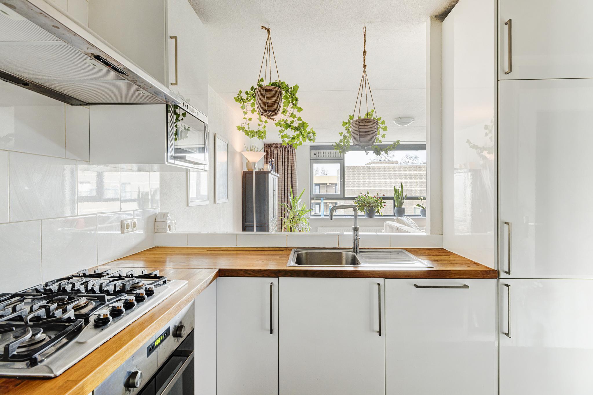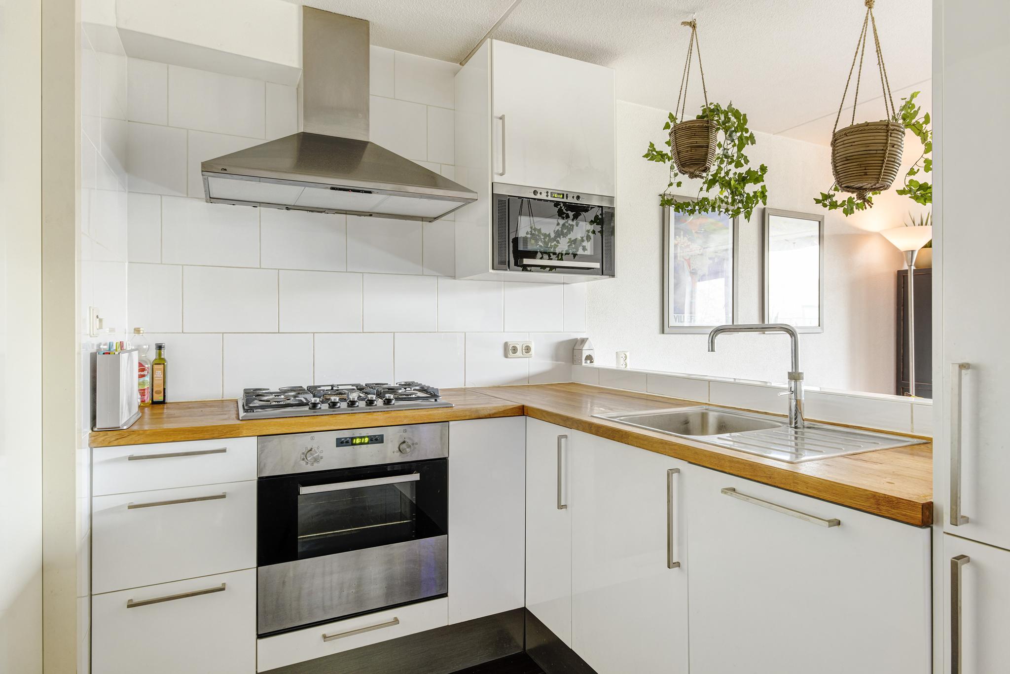 De keuken in hoekopstelling beschikt over een 5 pit gaskookplaat met afzuigkap, heteluchtoven, magnetron, vaatwasser, koelkast, vriezer, Quooker kraan en een houten werkblad.