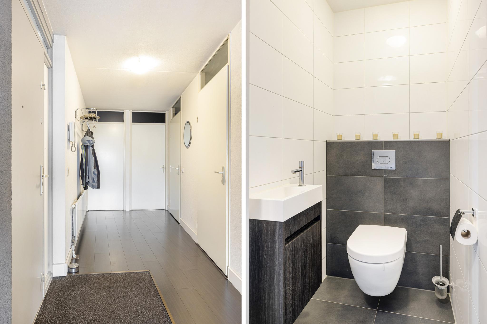 Entree, toilet (volledig betegeld) met fontein, toegang tot alle vertrekken.