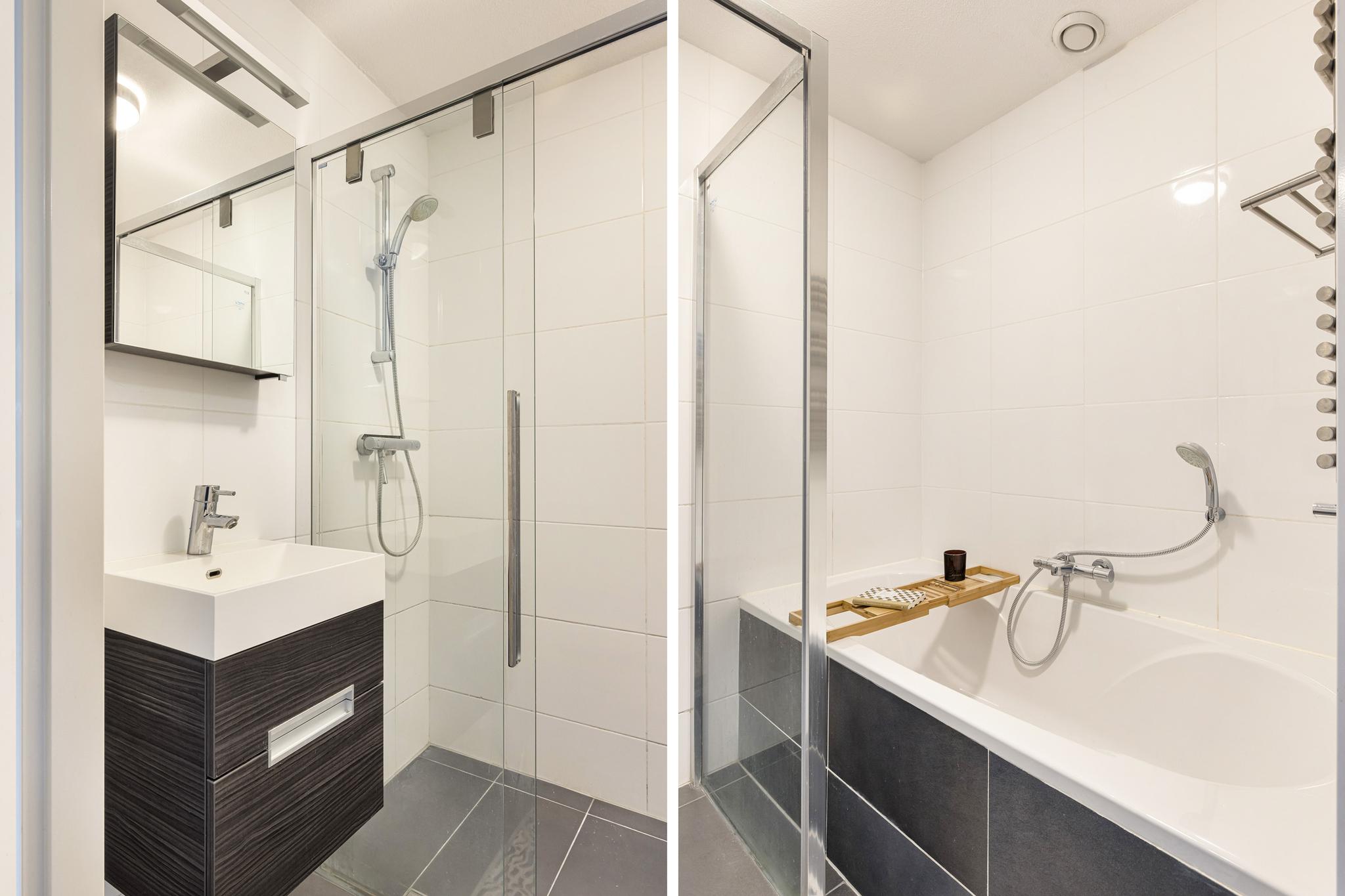 Badkamer (volledig betegeld) met ligbad met thermostaatkraan, inloopdouche met thermostaatkraan, wastafel met spiegelkast en designradiator.