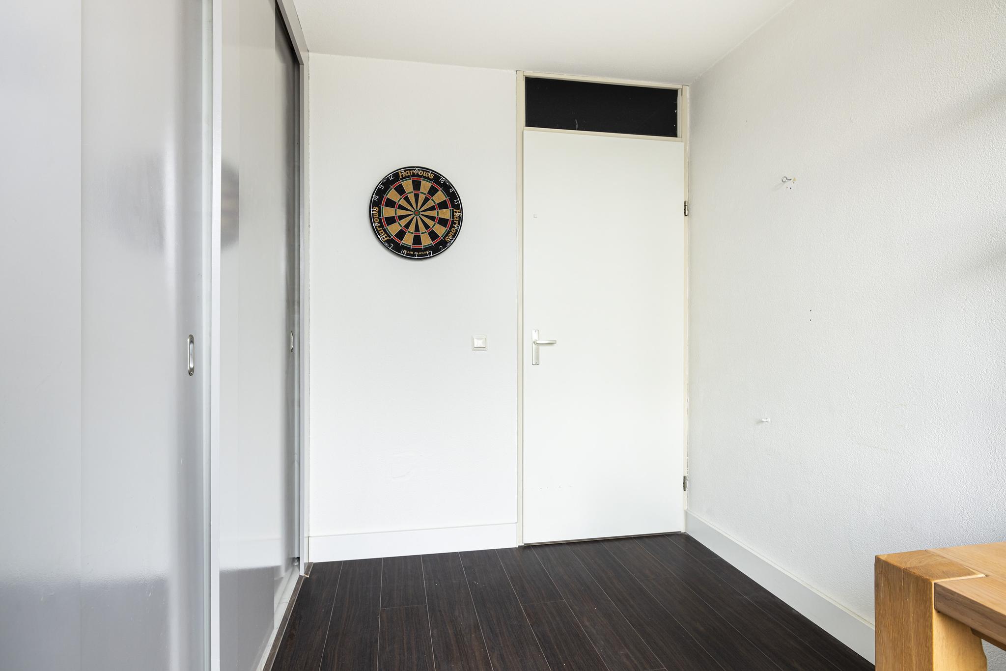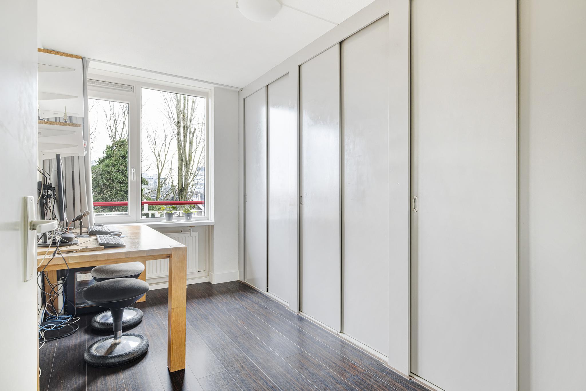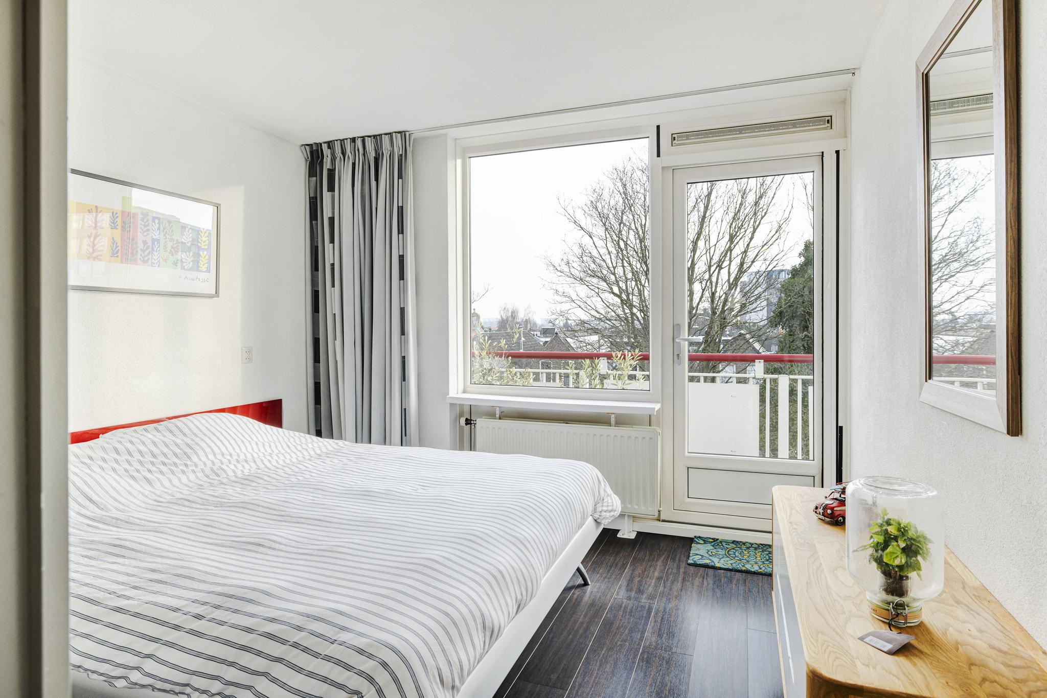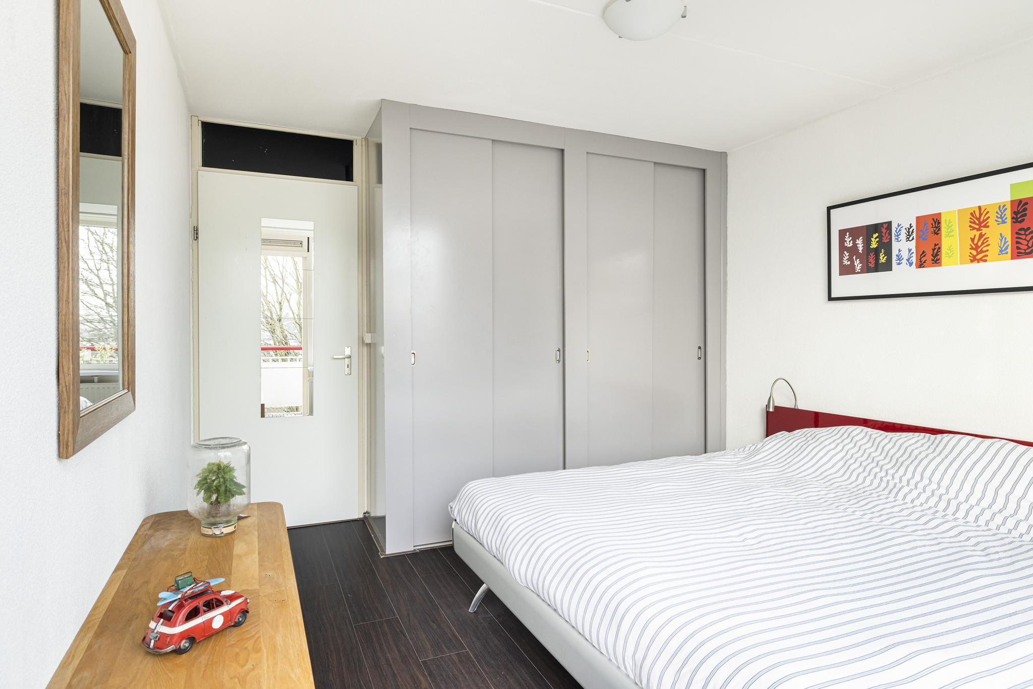 De 2 slaapkamers in het appartement zijn beide gelegen aan de achterzijde en zijn van een goed formaat. Slaapkamer 1 beschikt over vaste schuifkastenwand, kunststof kozijnen en toegang tot het balkon. De deur naar het balkon is voorzien van een hordeur.
