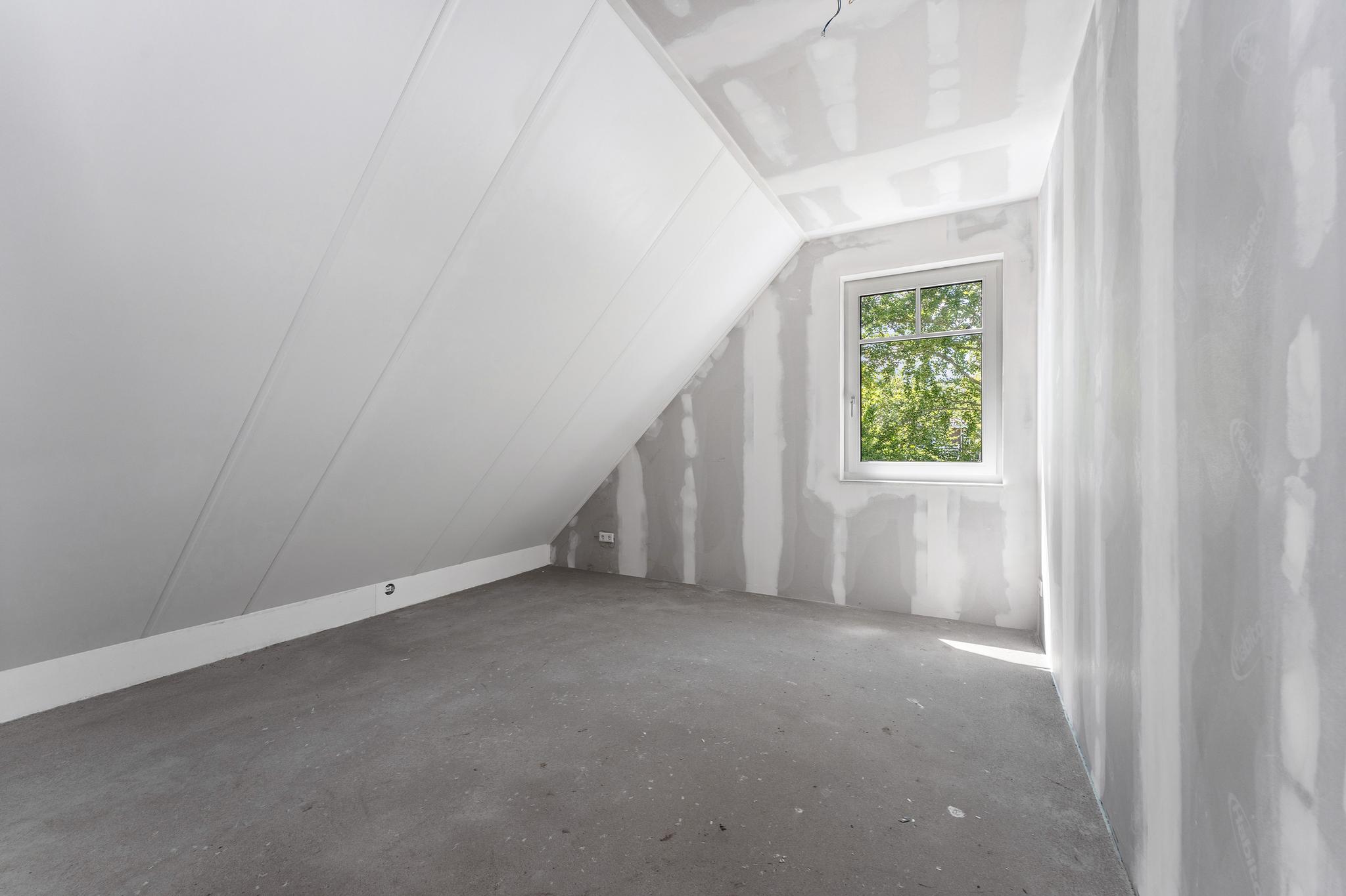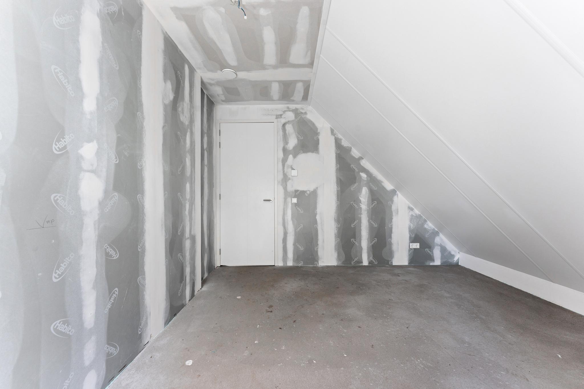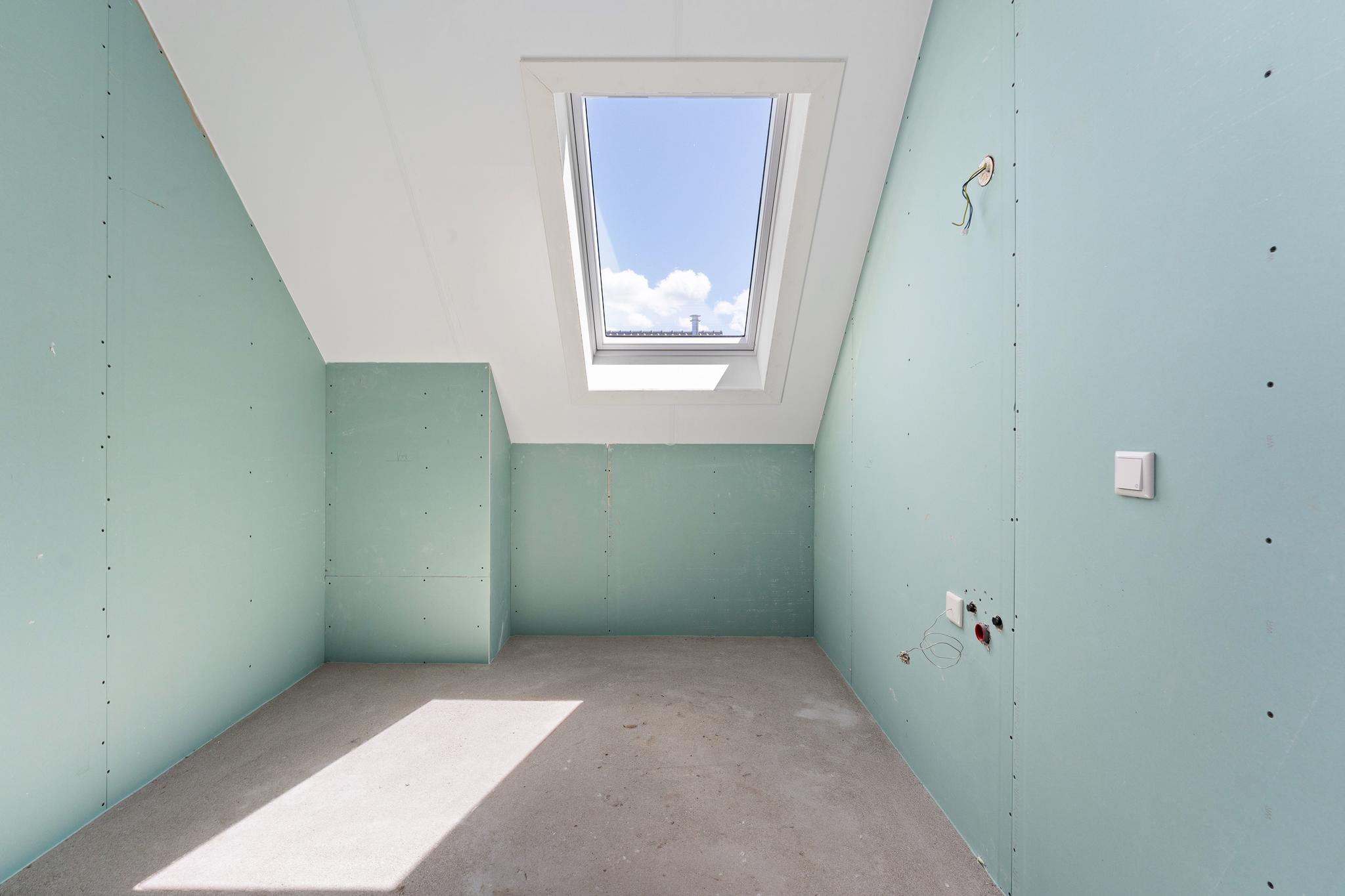Slaapkamer 3: Royale slaapkamer gelegen over de hele breedte van de woning. De slaapkamer heeft een dakkapel, leuke ramen met t-roedeverdeling en echt veel ruimte. Een groot tweepersoonsbed en wat andere meubels plaats je hier met gemak. Achter het luik zit de verdeler van de zonnepanelen netjes weggewerkt.