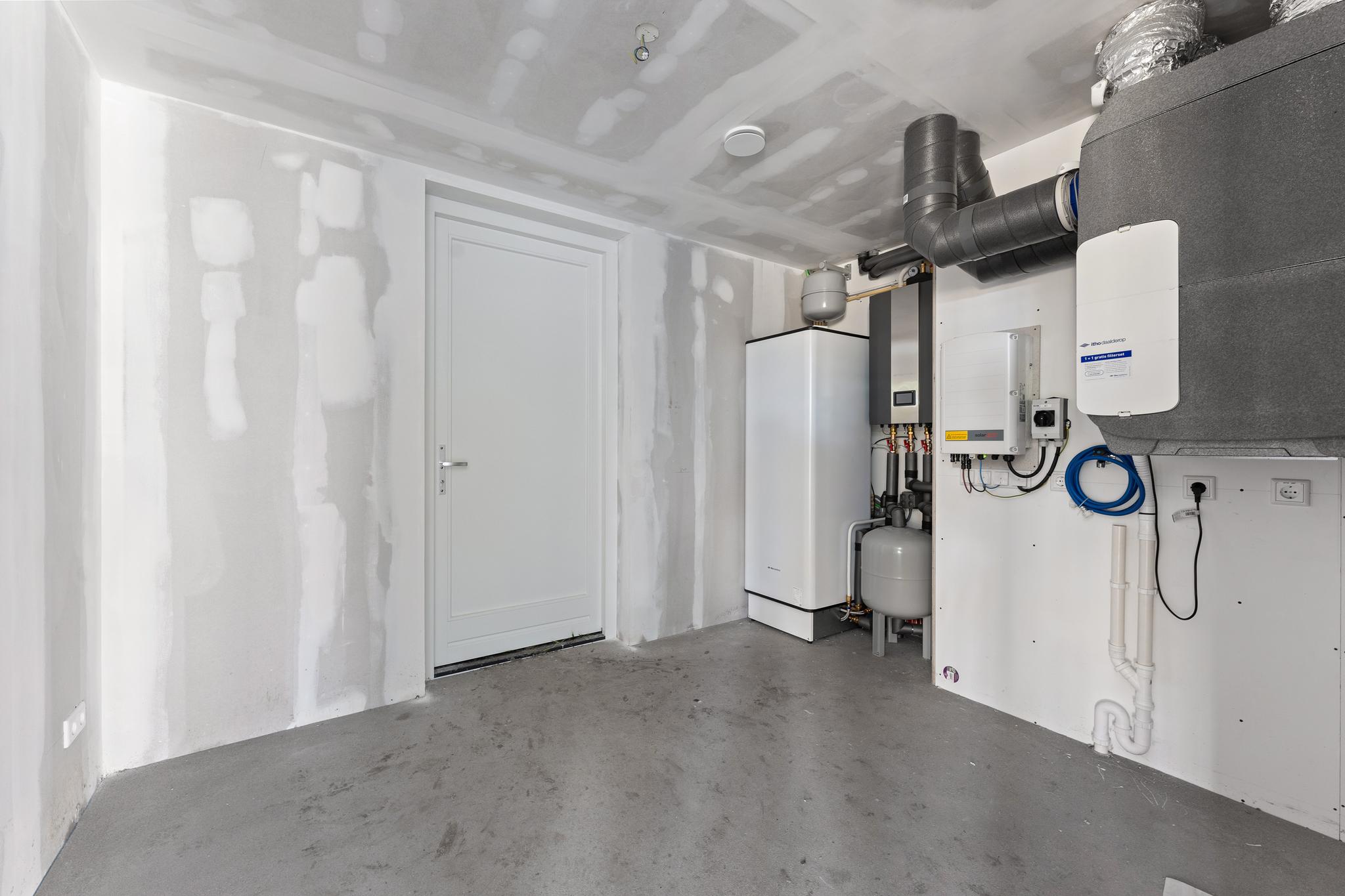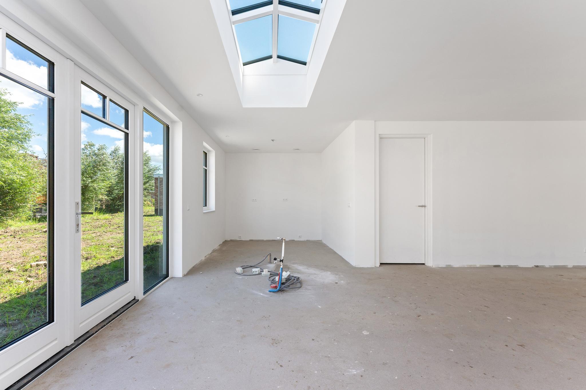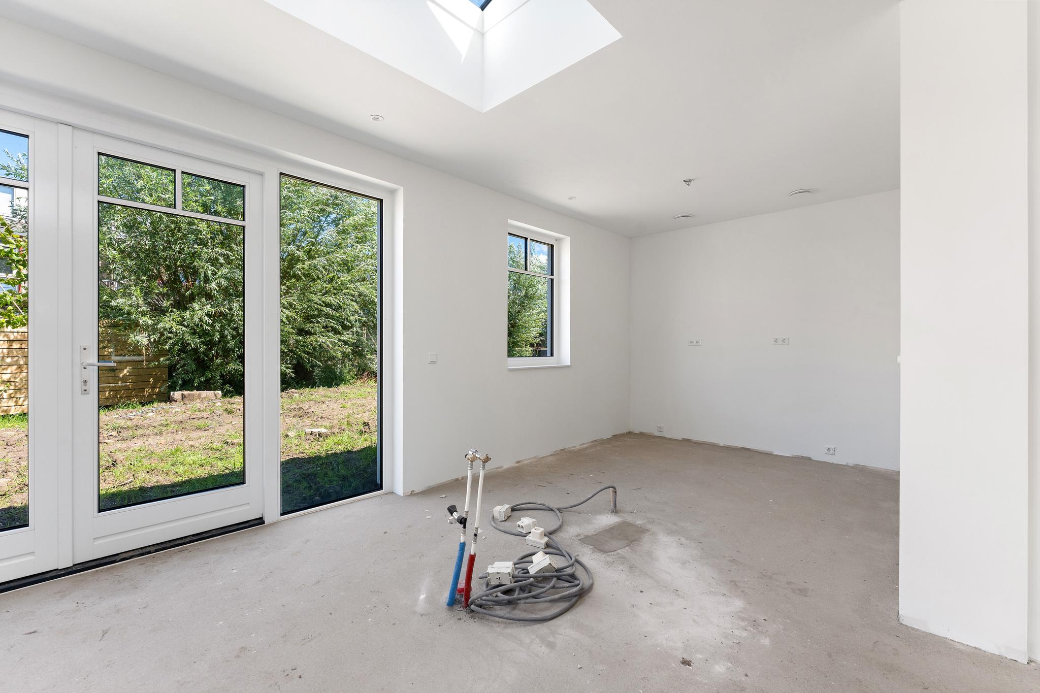 Binnen tref je een grote woonkamer aan met inbouwspots, voldoende ruimte voor een gezellige zithoek en openslaande deuren naar de tuin die voor een naadloze overgang tussen binnen en buiten zorgen. De keuken, die nog volledig naar eigen smaak geplaatst moet worden, bevindt zich in een prachtige 3-meter aanbouw met een lichtstraat. Deze ruimte is ideaal voor het creëren van een moderne keuken met een kookeiland en biedt tevens toegang tot de bijkeuken. De bijkeuken is perfect voor extra opslag en herbergt alle technische installaties, zoals de warmtepomp, mechanische ventilatie en de omvormer van de zonnepanelen.