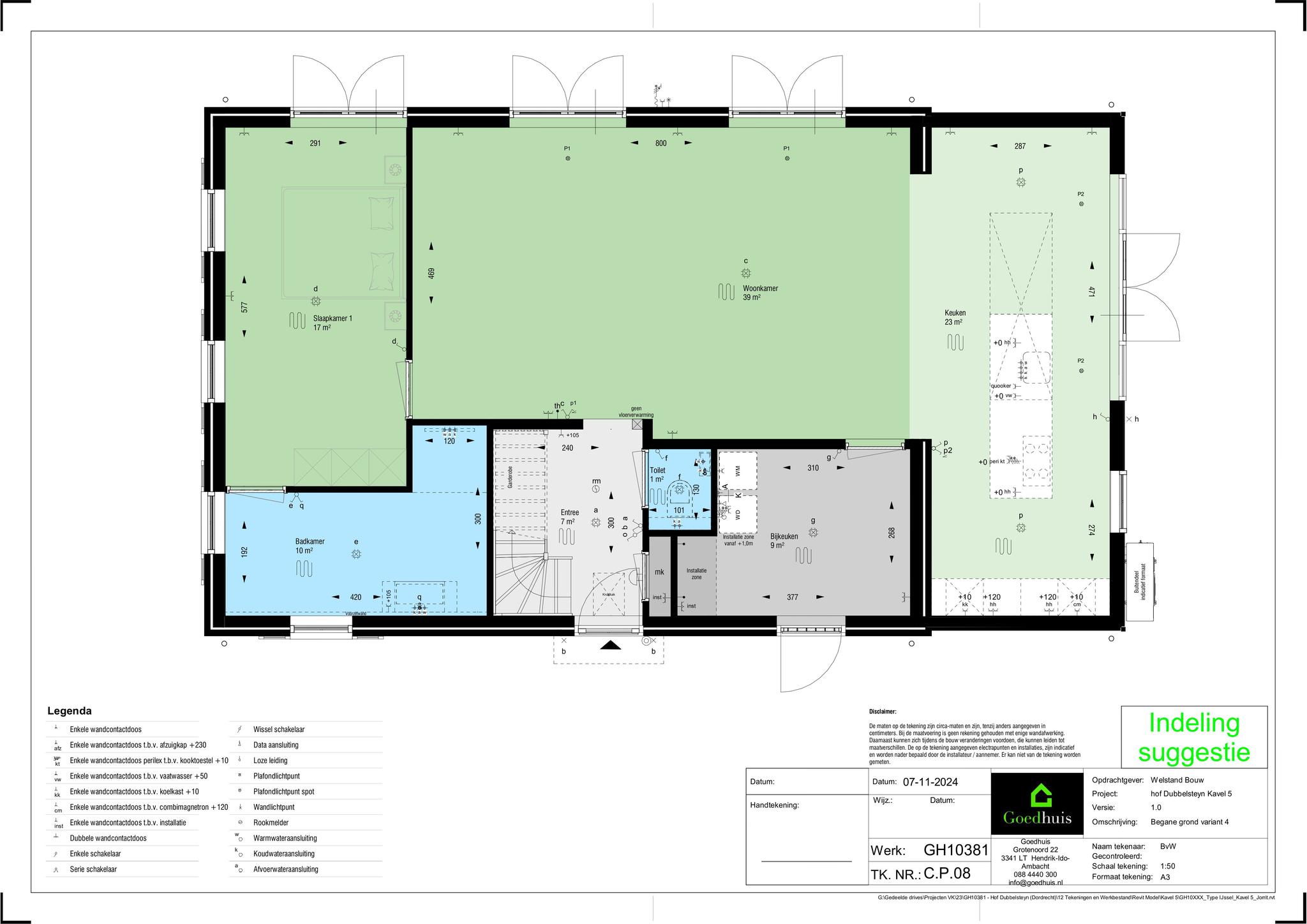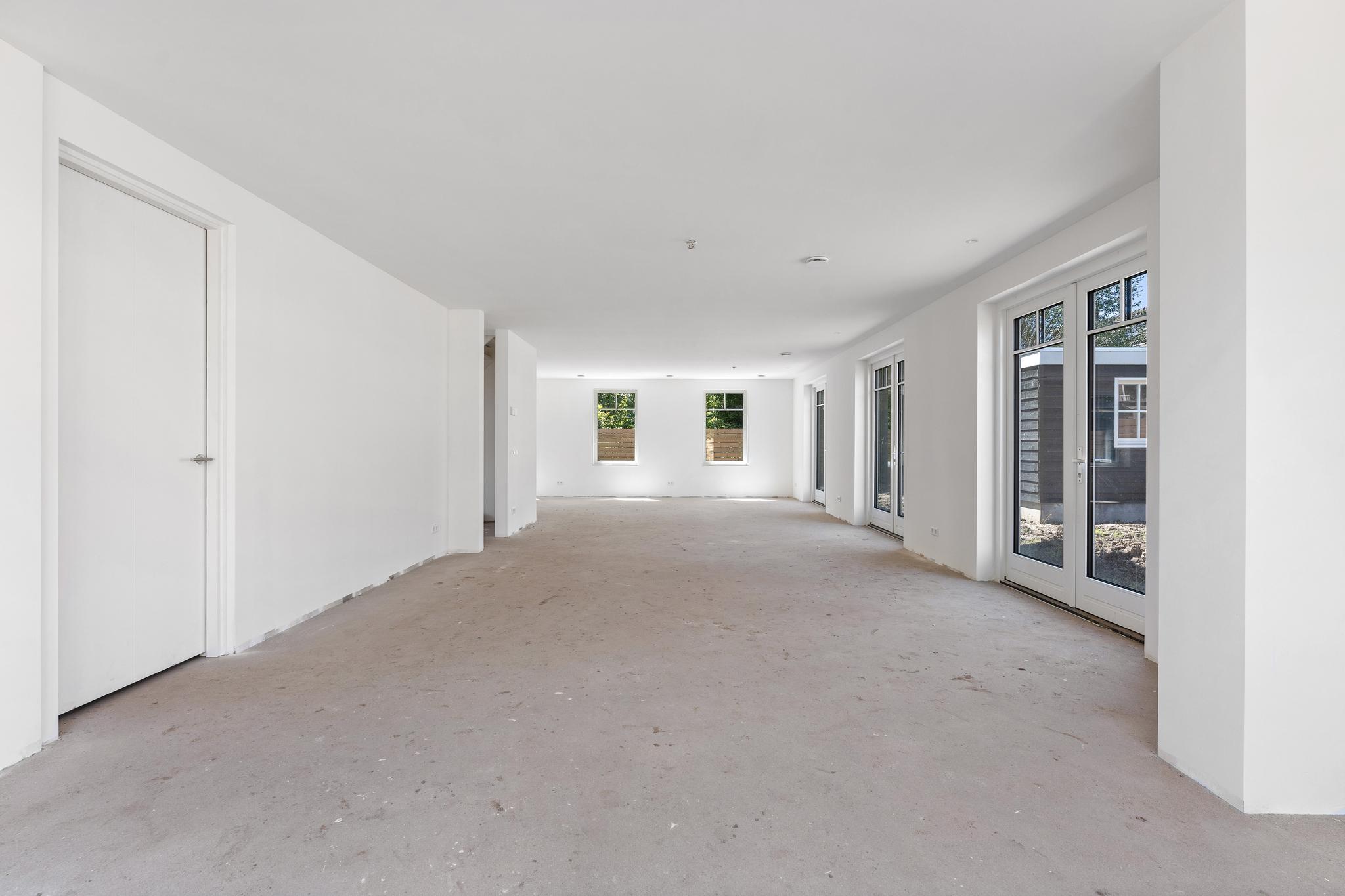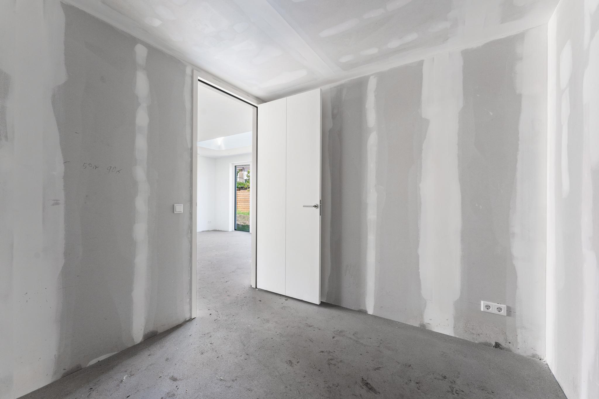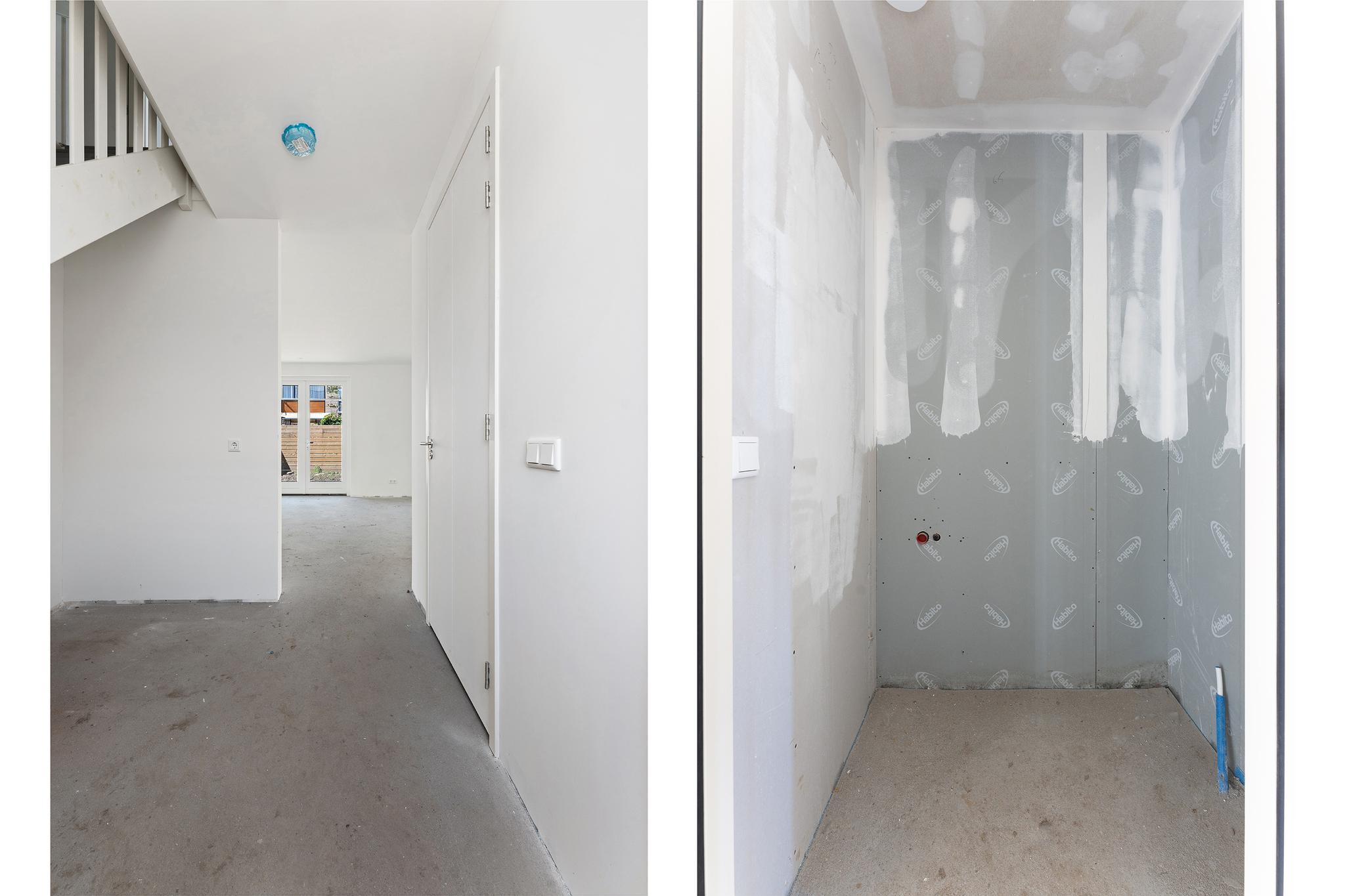 Binnen tref je een grote woonkamer aan met inbouwspots, voldoende ruimte voor een gezellige zithoek en openslaande deuren naar de tuin die voor een naadloze overgang tussen binnen en buiten zorgen. De keuken, die nog volledig naar eigen smaak geplaatst moet worden, bevindt zich in een prachtige 3-meter aanbouw met een lichtstraat. Deze ruimte is ideaal voor het creëren van een moderne keuken met een kookeiland en biedt tevens toegang tot de bijkeuken. De bijkeuken is perfect voor extra opslag en herbergt alle technische installaties, zoals de warmtepomp, mechanische ventilatie en de omvormer van de zonnepanelen.