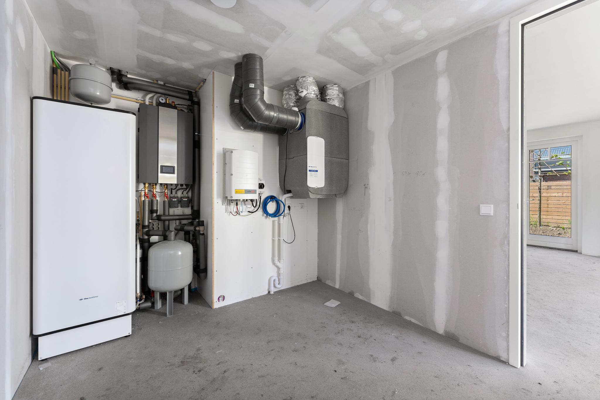 Bijkeuken: Praktische ruimte met technische voorzieningen, zoals een warmtepomp, mechanische ventilatie en omvormer van de zonnepanelen. Er is voldoende ruimte over voor het creëren van een wasruimte of het plaatsen van stellingkasten. De ruimte is afgewerkt met een zandcement dekvloer, gegipste wanden en een gegipst plafond.
