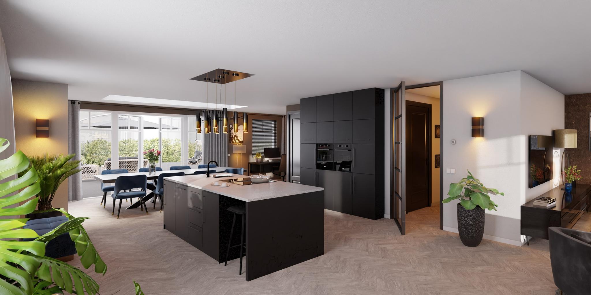 • De keuken kan worden gerealiseerd in de aanbouw, waarbij een moderne uitstraling met een kookeiland en lichtstraat mogelijk is.