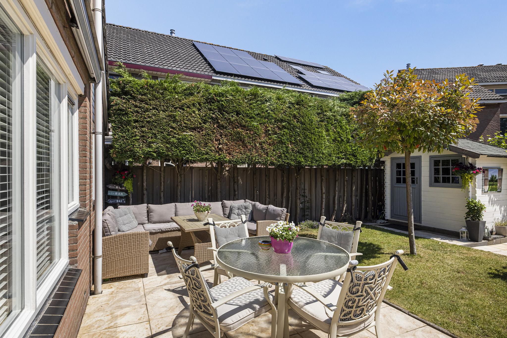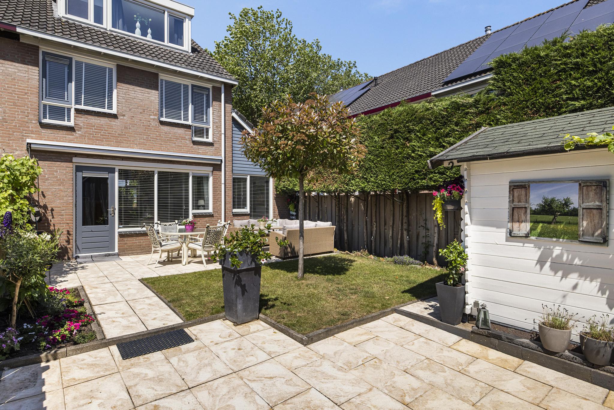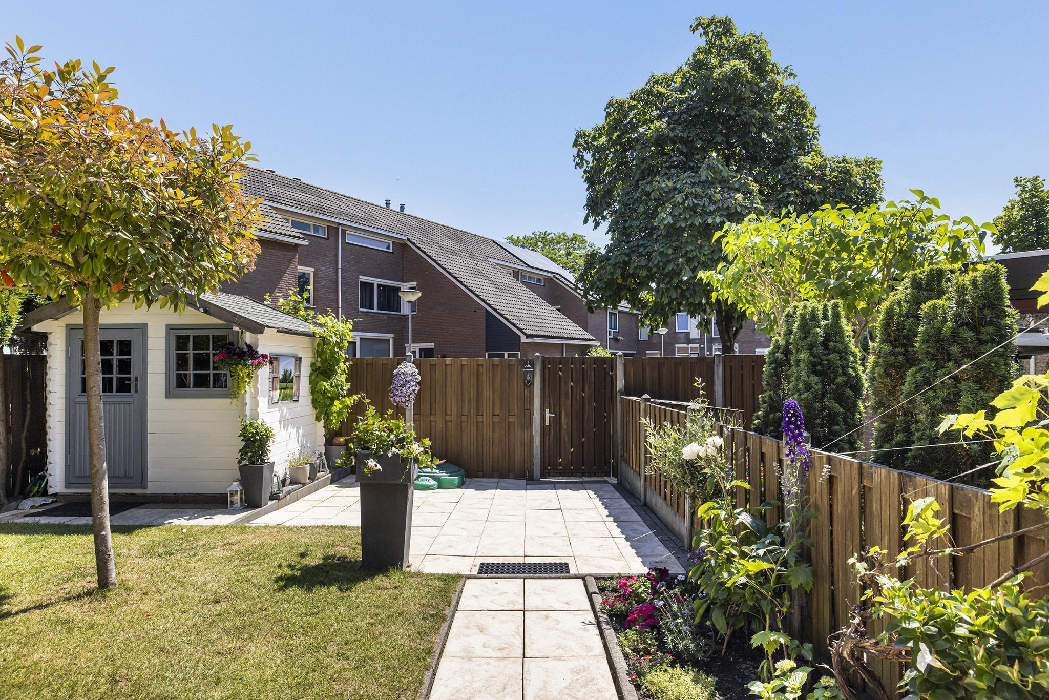 De zonnige tuin is gelegen op het zuidoosten en is deels betegeld en voorzien van gras. De tuin beschikt over een zonnescherm, een houten berging met elektra, mooie coniferenhaag en een achterom.