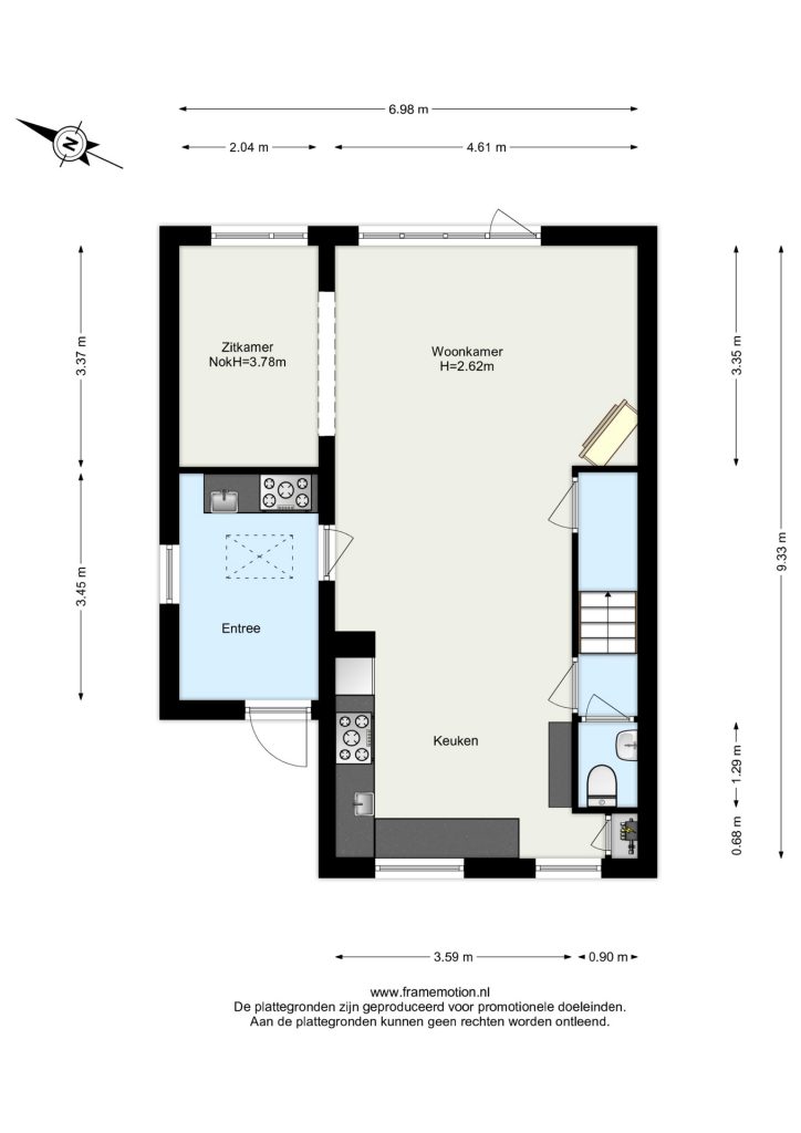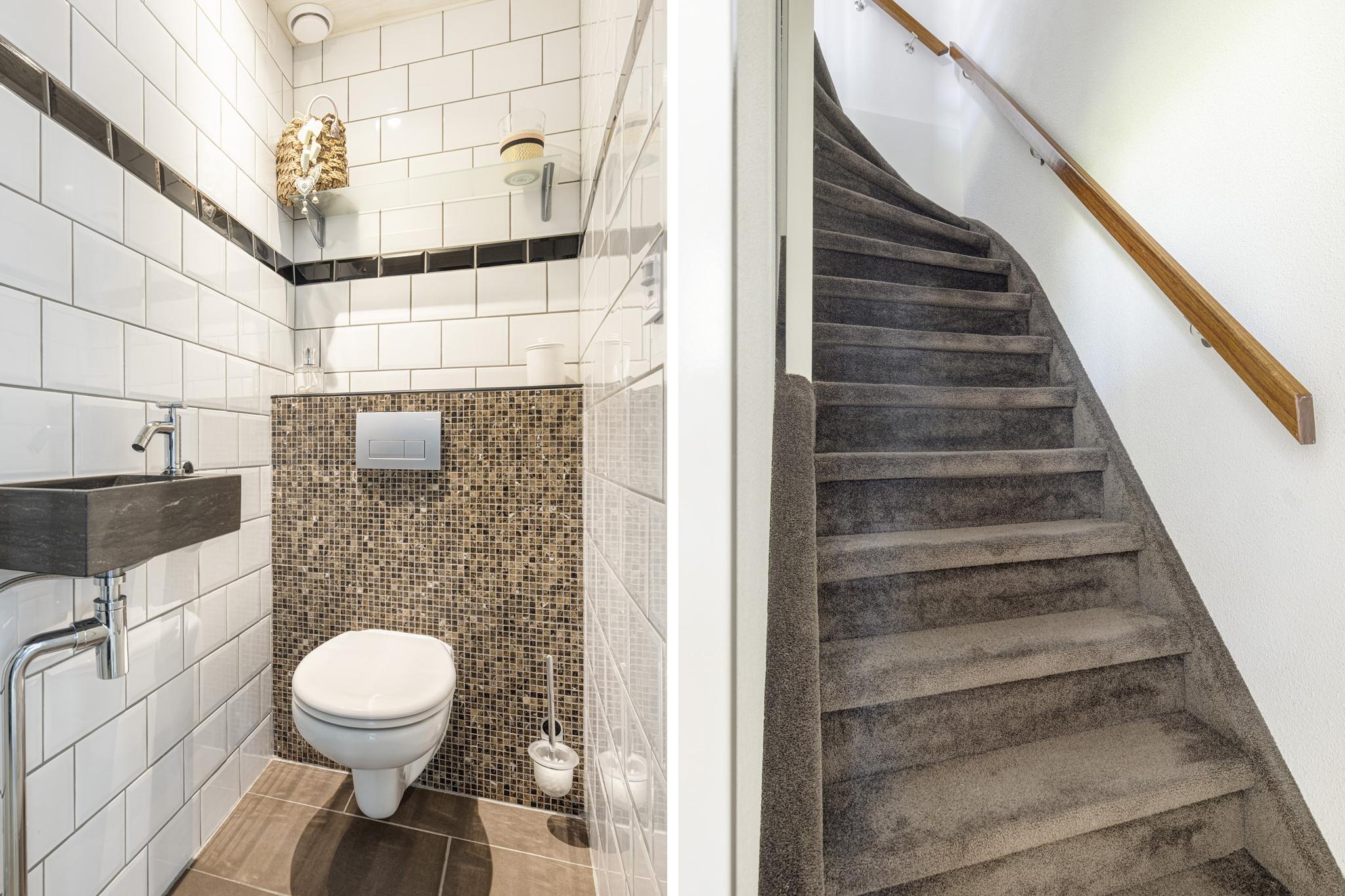 Vanuit de keuken is de hal bereikbaar met toilet (hangend, met fontein) en trap naar 1e verdieping.