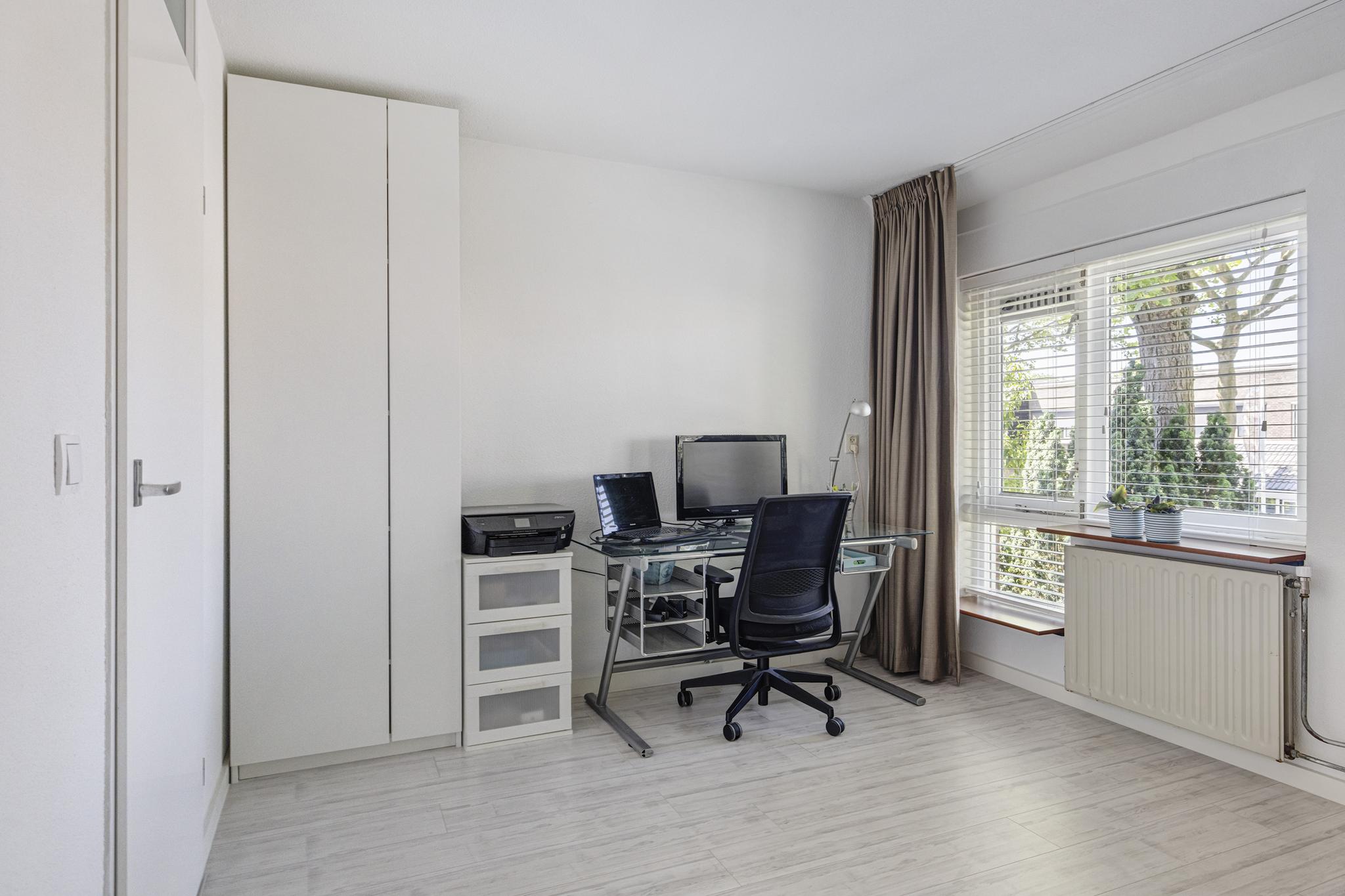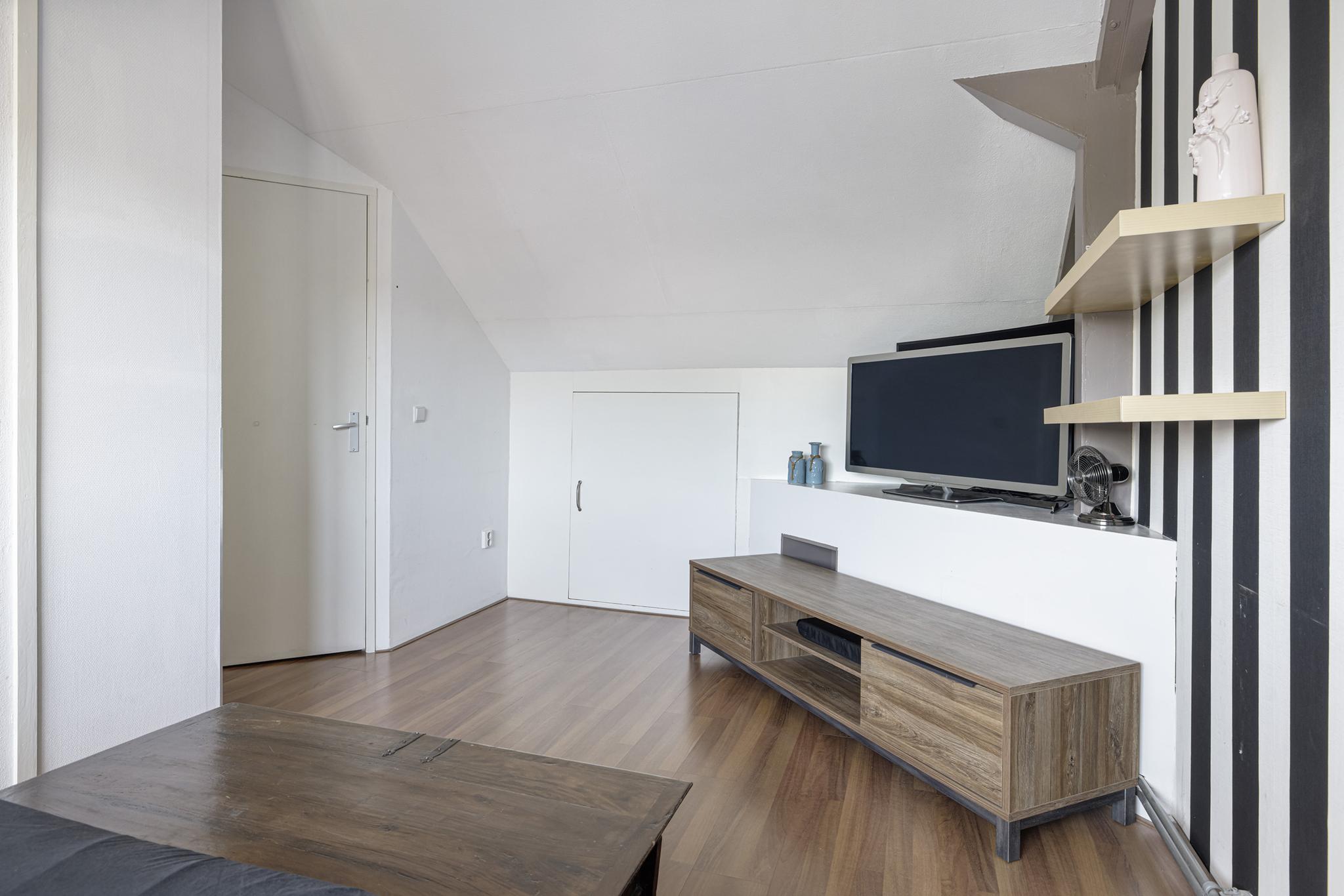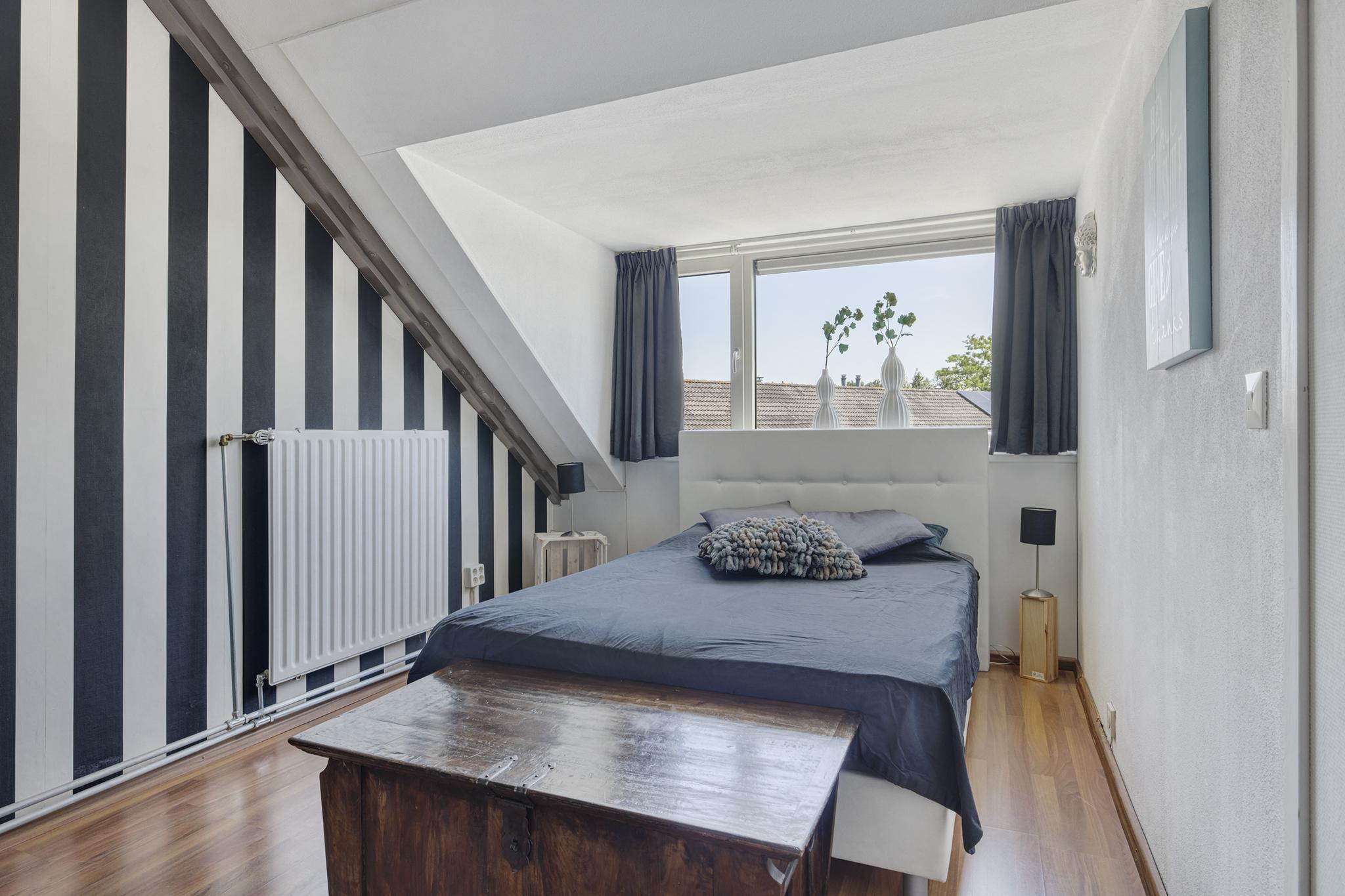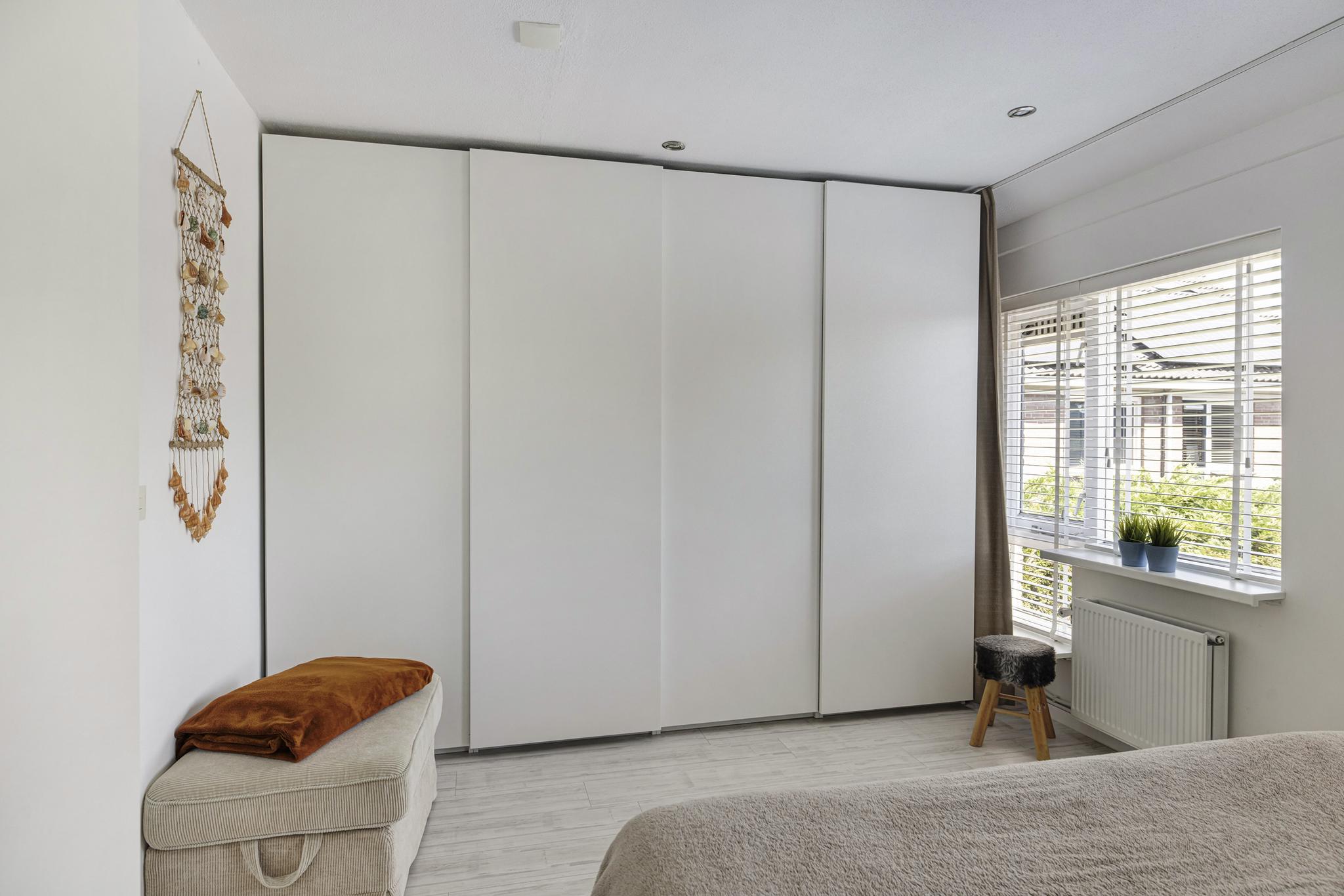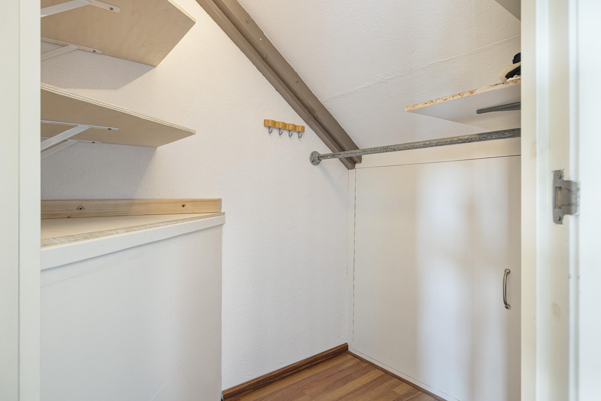 Slaapkamer met inloopkast, voorzien van laminaatvloer, behang wandafwerking, knieschotten over gehele breedte aan beide zijden. De woning is aan achterzijde voorzien van een brede dakkapel met kunststof kozijnen.