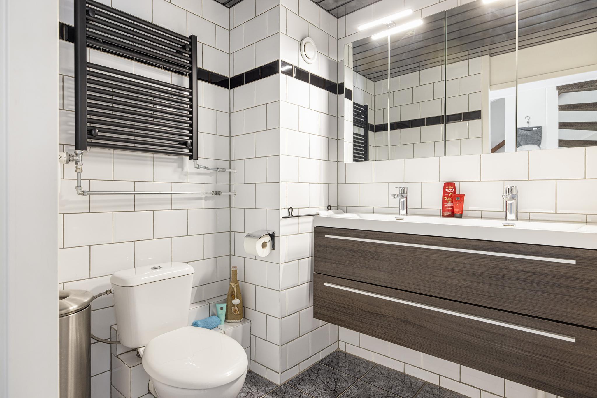 Badkamer (volledig betegeld) met ligbad met thermostaatkraan, dubbele wastafel met meubel, spiegelkast, toilet en mechanische ventilatie.