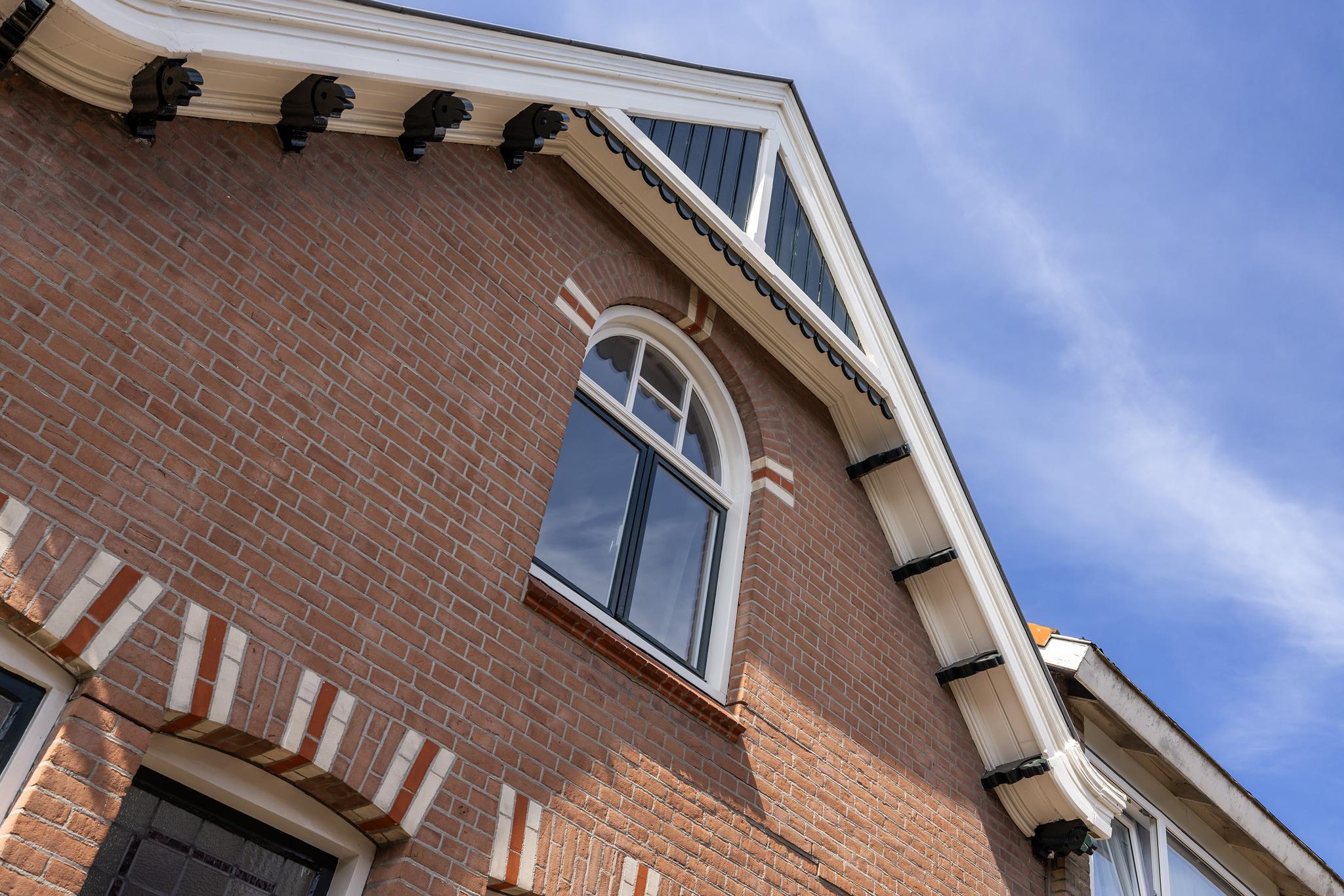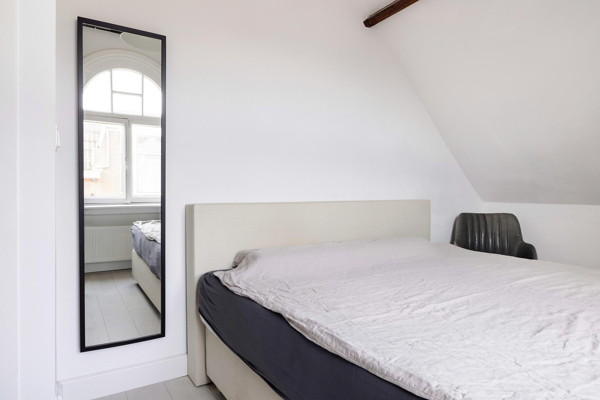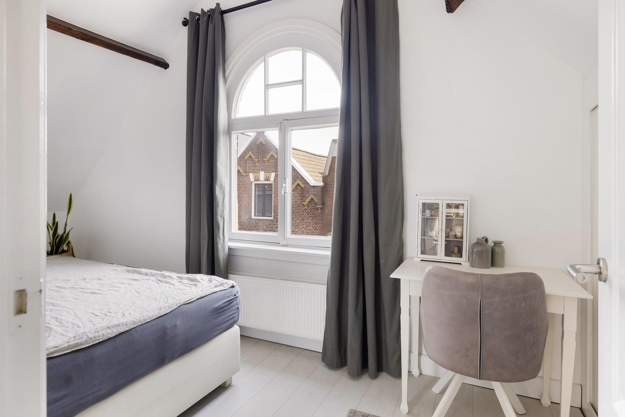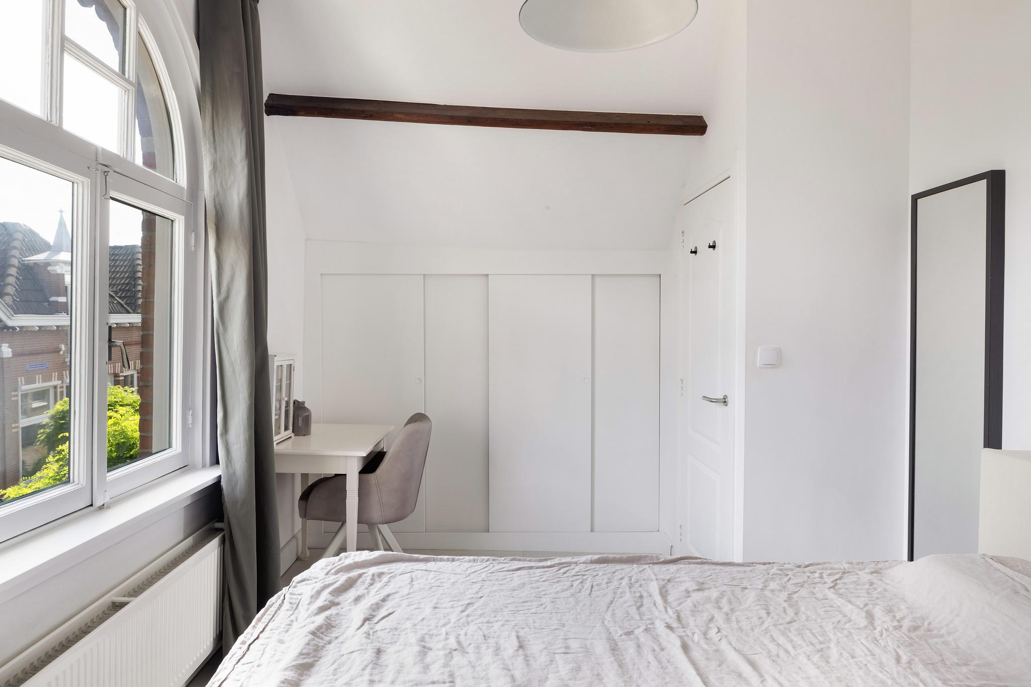 Slaapkamer aan voorzijde met kenmerkend boograam en schuifkastenwand.