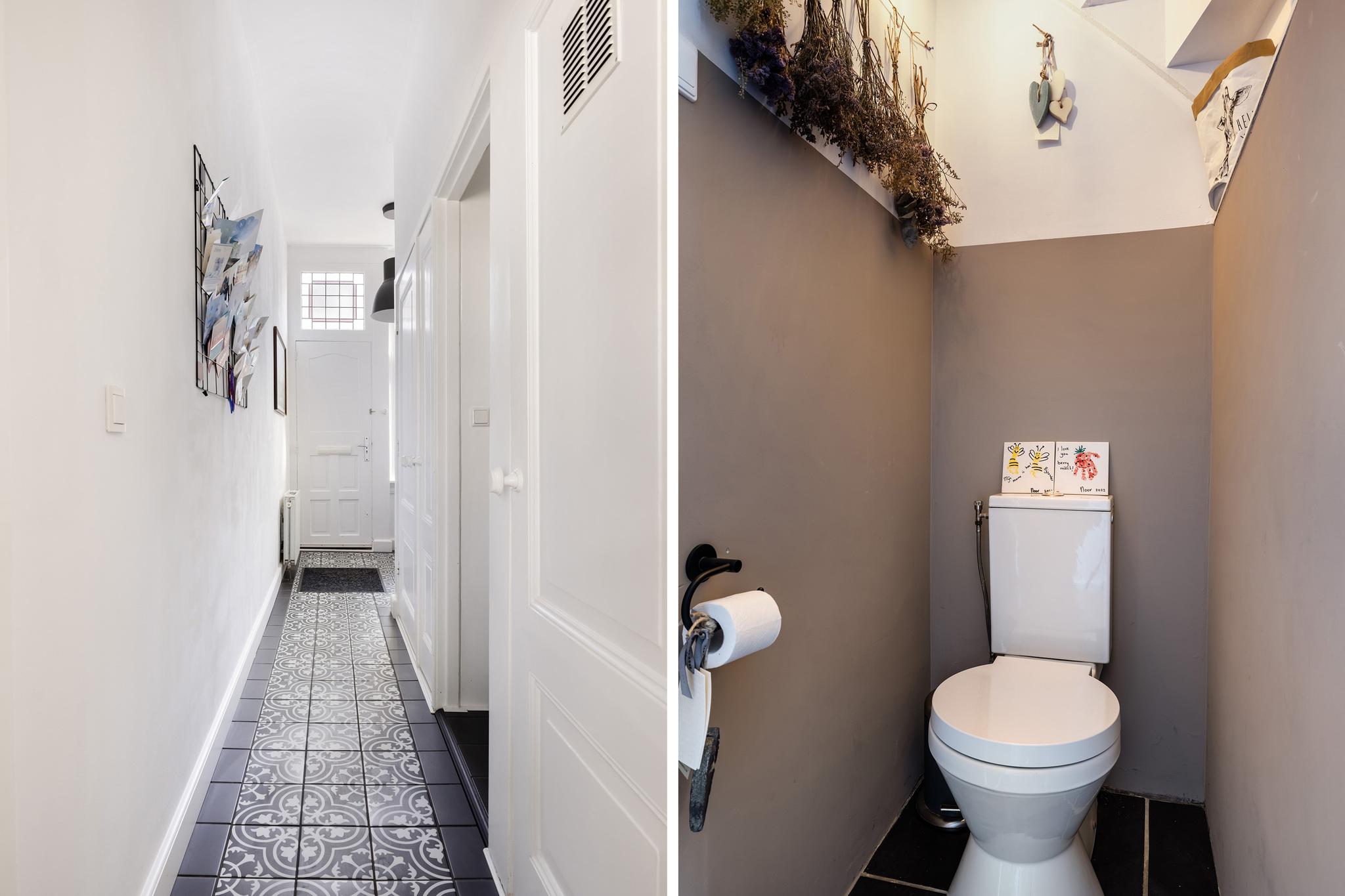 Hal met tegelvloer, toilet, meterkast (6 groepen, 2 aardlekschakelaars, slimme meters, glasvezel) en ruimte voor een garderobe.
