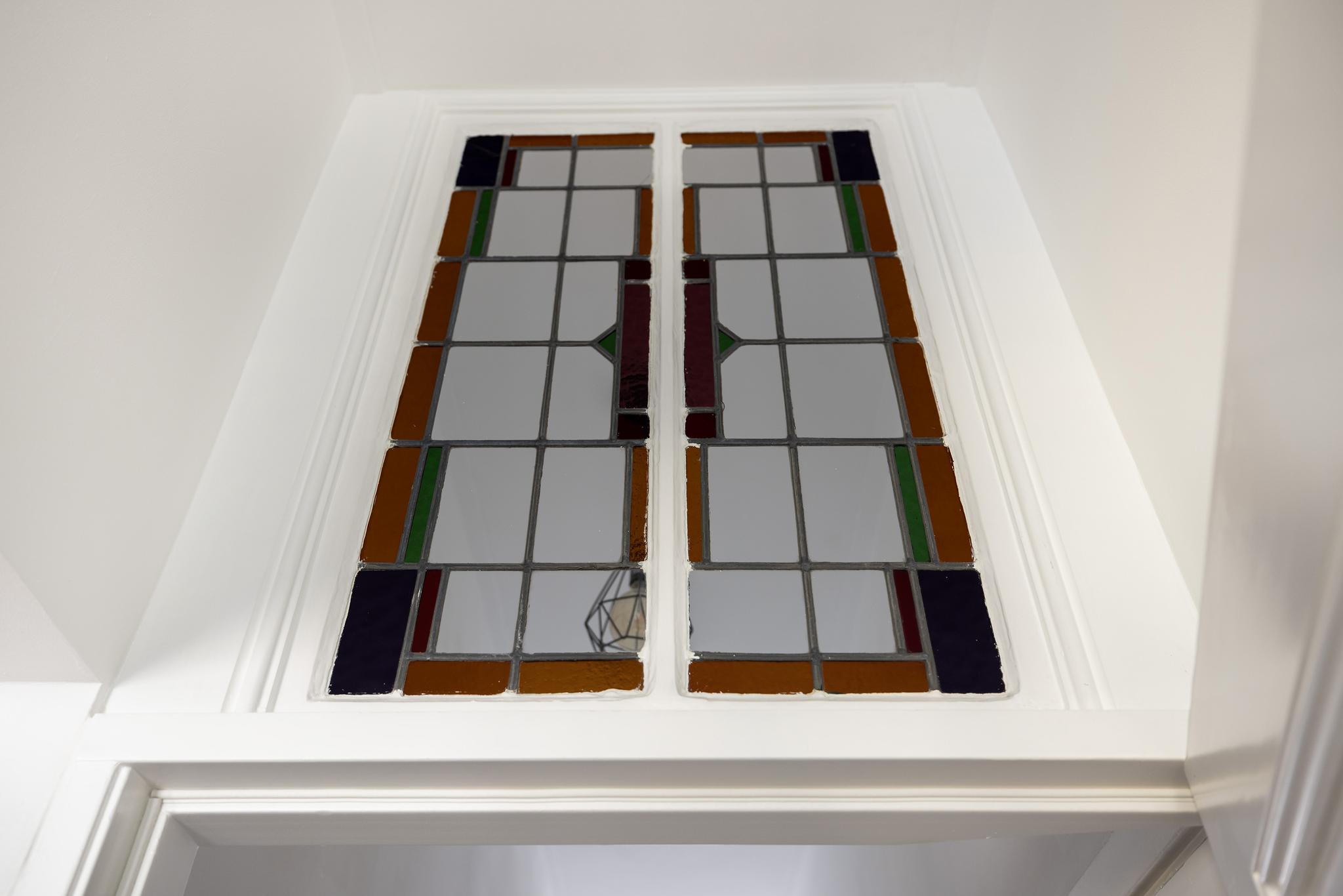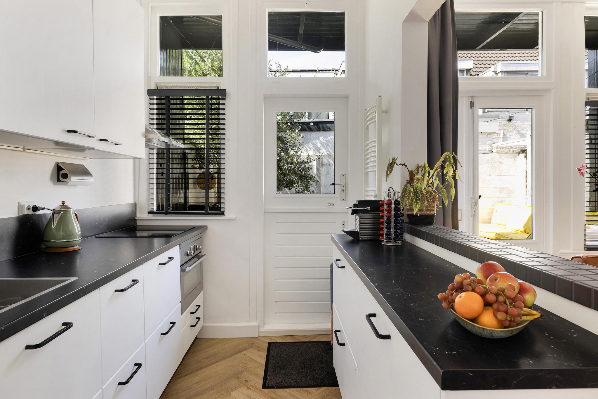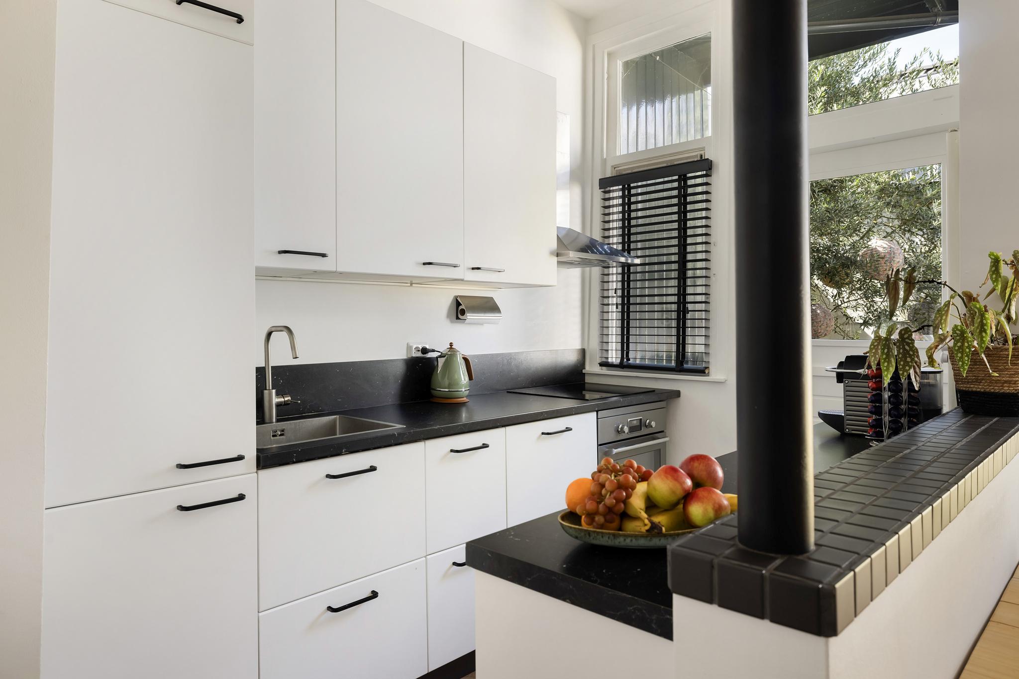 De keuken in wandopstelling is voorzien van een 4 pit inductie kookplaat, combi-oven, vaatwasser, koelkast, vriezer, kunststof werkblad met een apart kastendeel aan de andere kant van de keuken. Ook hier is glas-in-lood terug te vinden, heel leuk! Vanuit de keuken is eveneens de achtertuin bereikbaar.