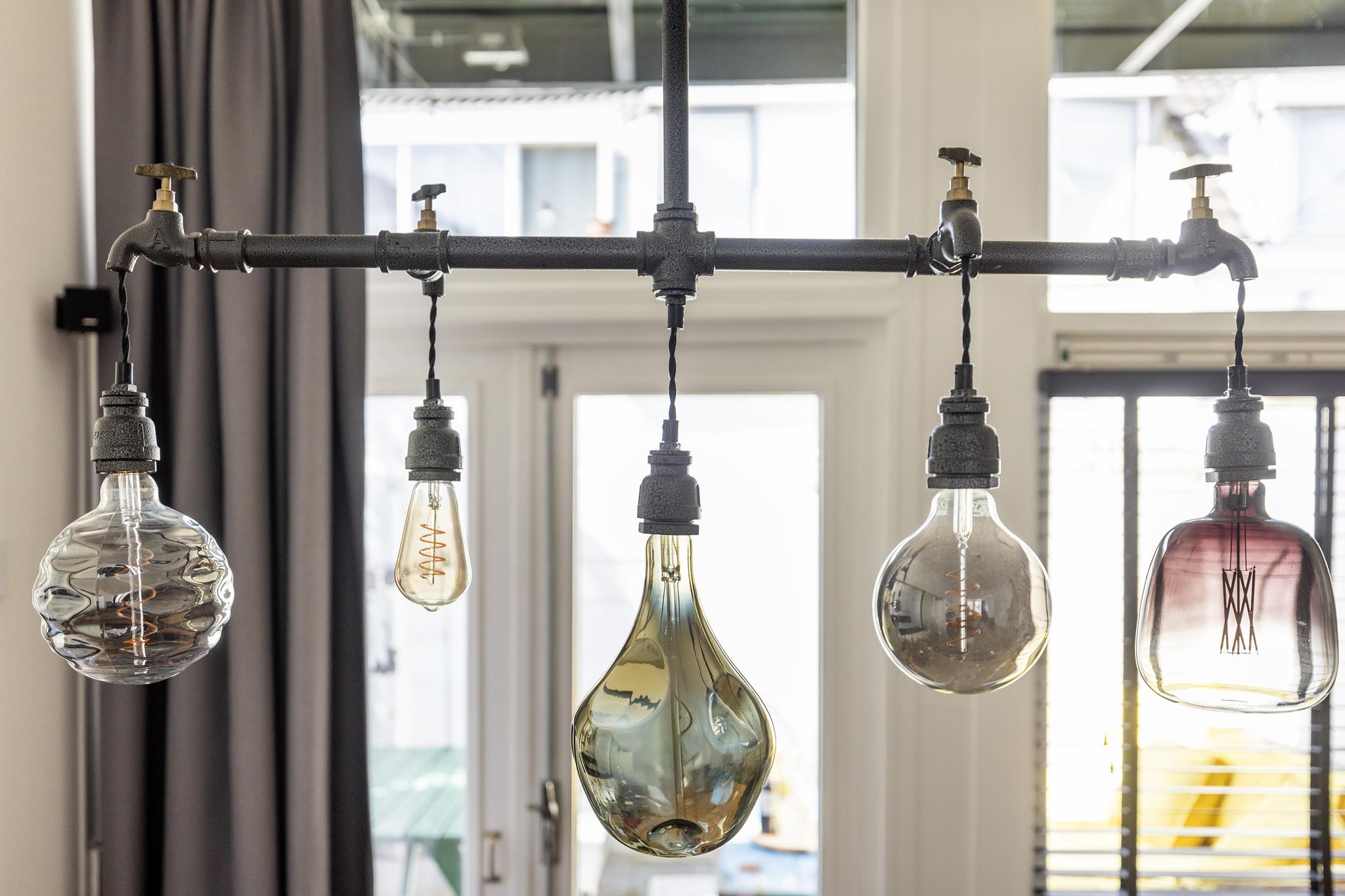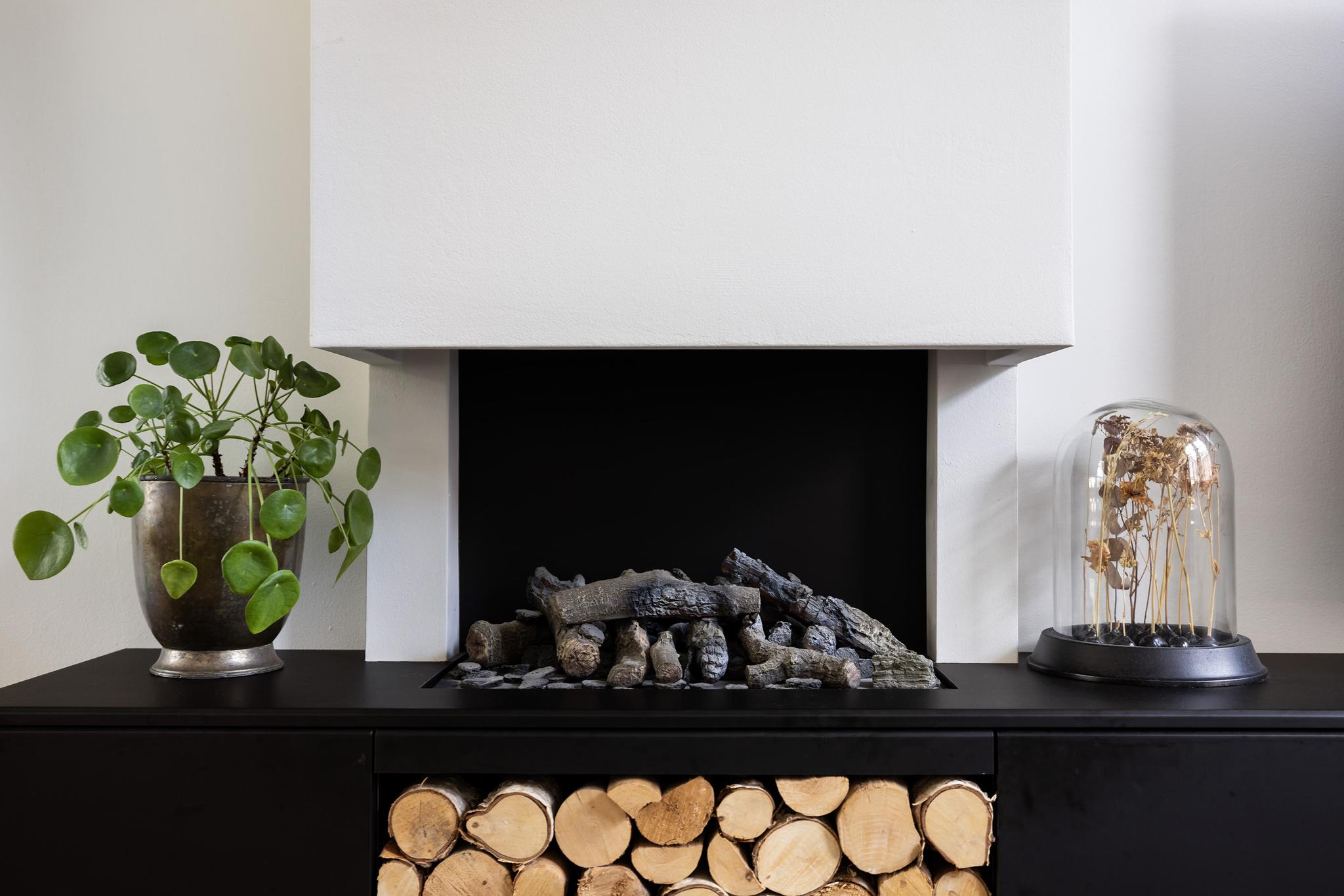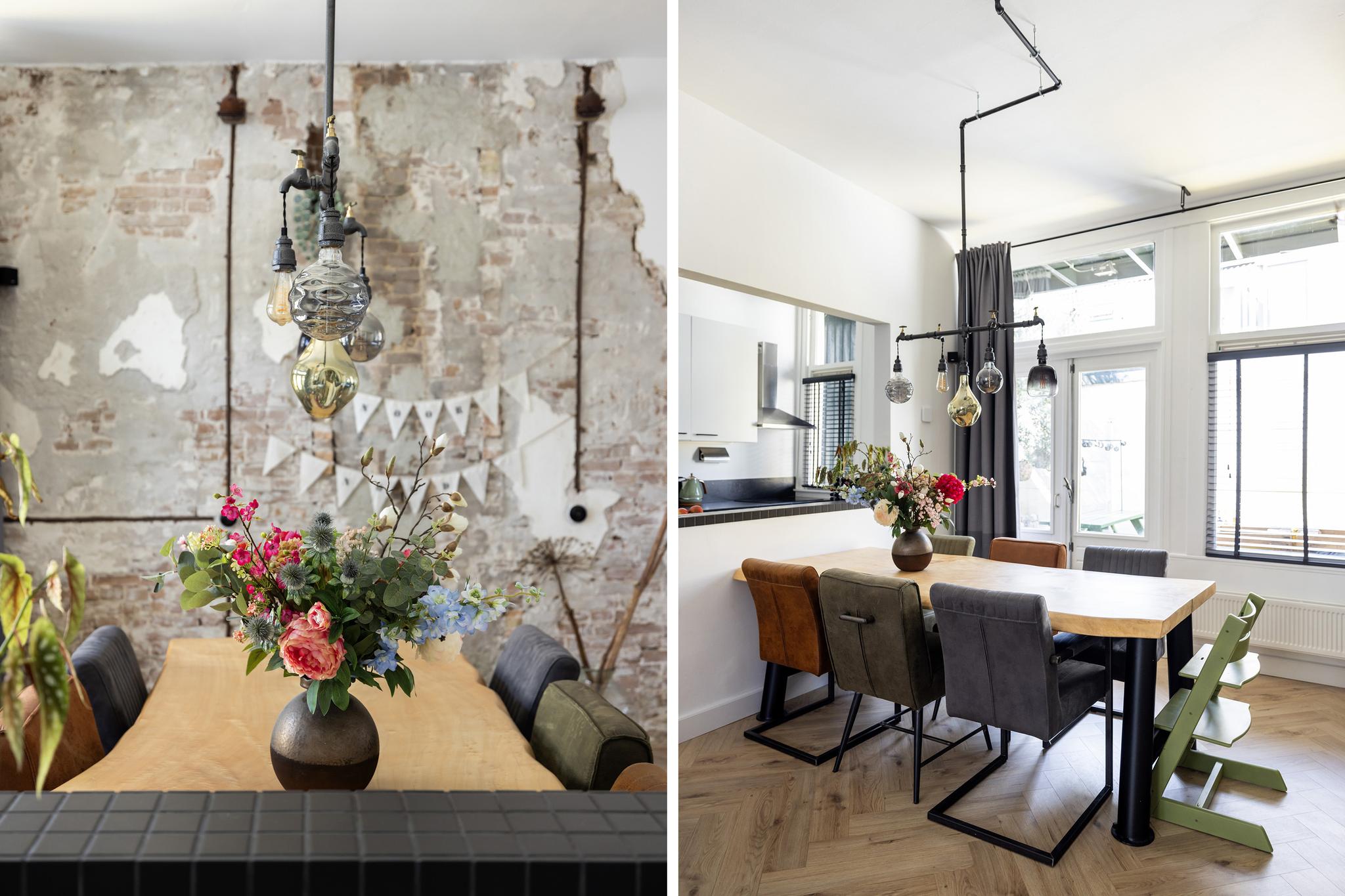 Bij de zithoek aan de voorzijde van de kamer hebben eigenaren een waterdamphaard geïnstalleerd, wat samen met de glas-in-lood ramen zorgt voor een gezellige sfeer. Achterin de kamer bevindt zich de eethoek naast de open keuken. De brickwall met stoere lampen zorgt hier voor een moderne en industriële look.