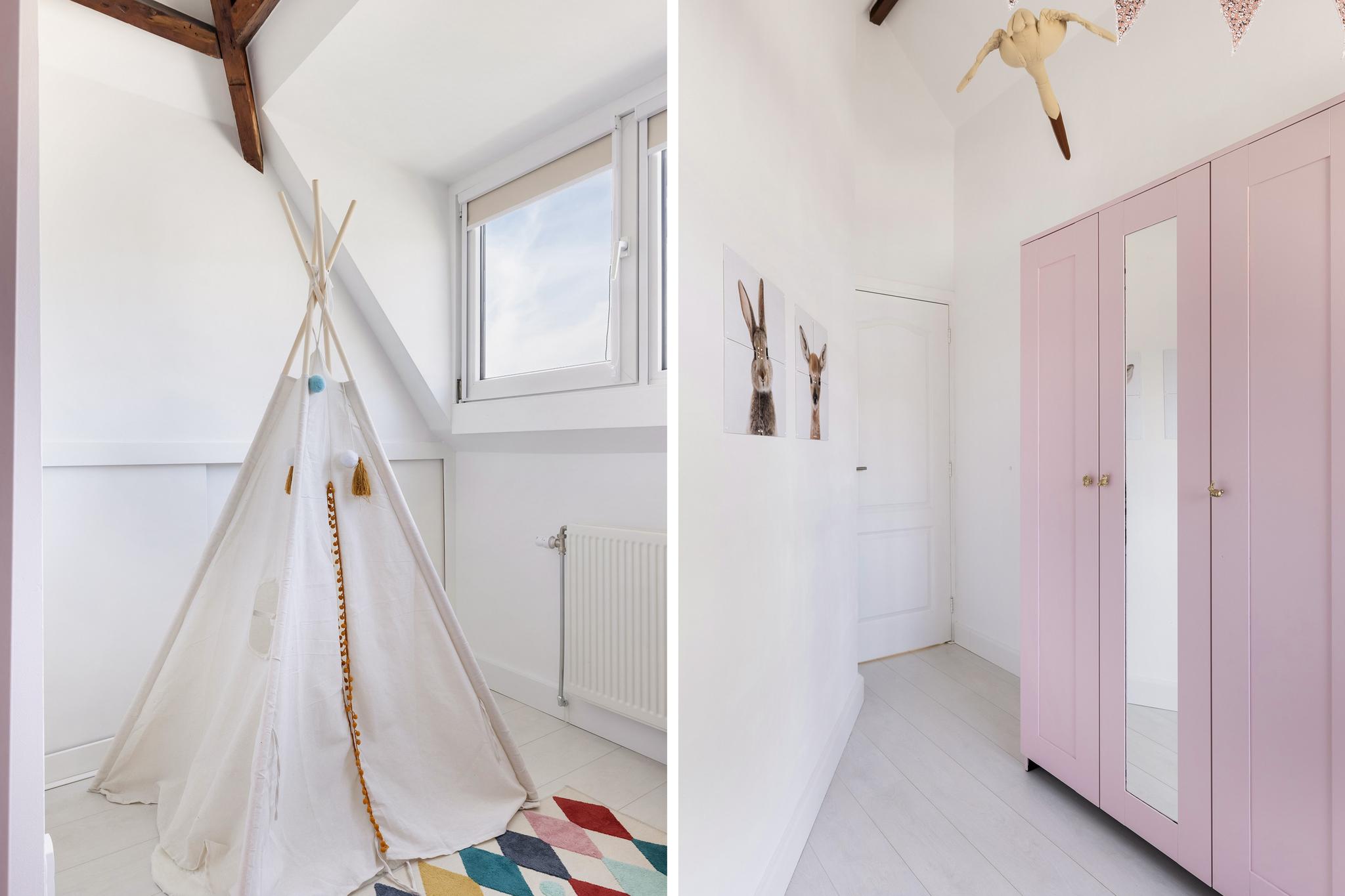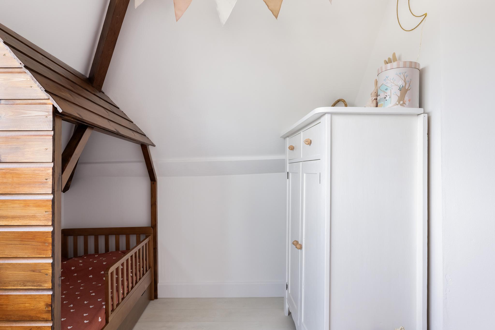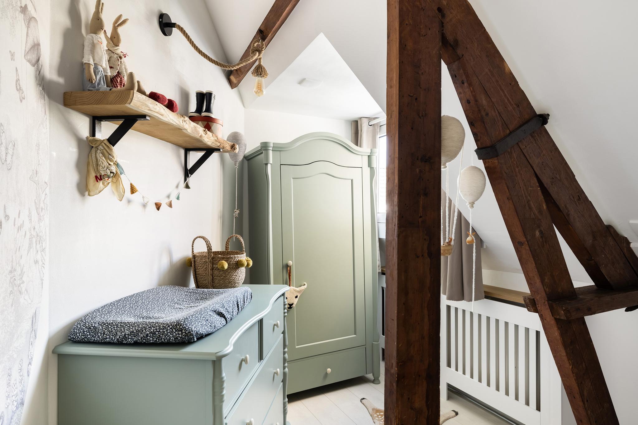 Boven is het minstens zo mooi! De 2 kinderkamers zijn supersmaalvol ingericht, ook hier raak je niet uitgekeken… De balken zijn mooi zichtbaar, er is gewerkt met warme kleuren en puur praktisch; er is nog opbergruimte achter de knieschotten! Vergaten we bijna te melden, beneden is nog een kelder waar je eveneens een hoop spullen kwijt kunt. Geen harde eis, wél een lekkere bijkomstigheid.