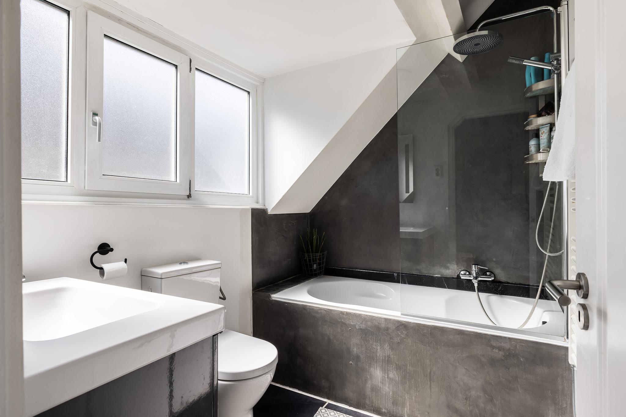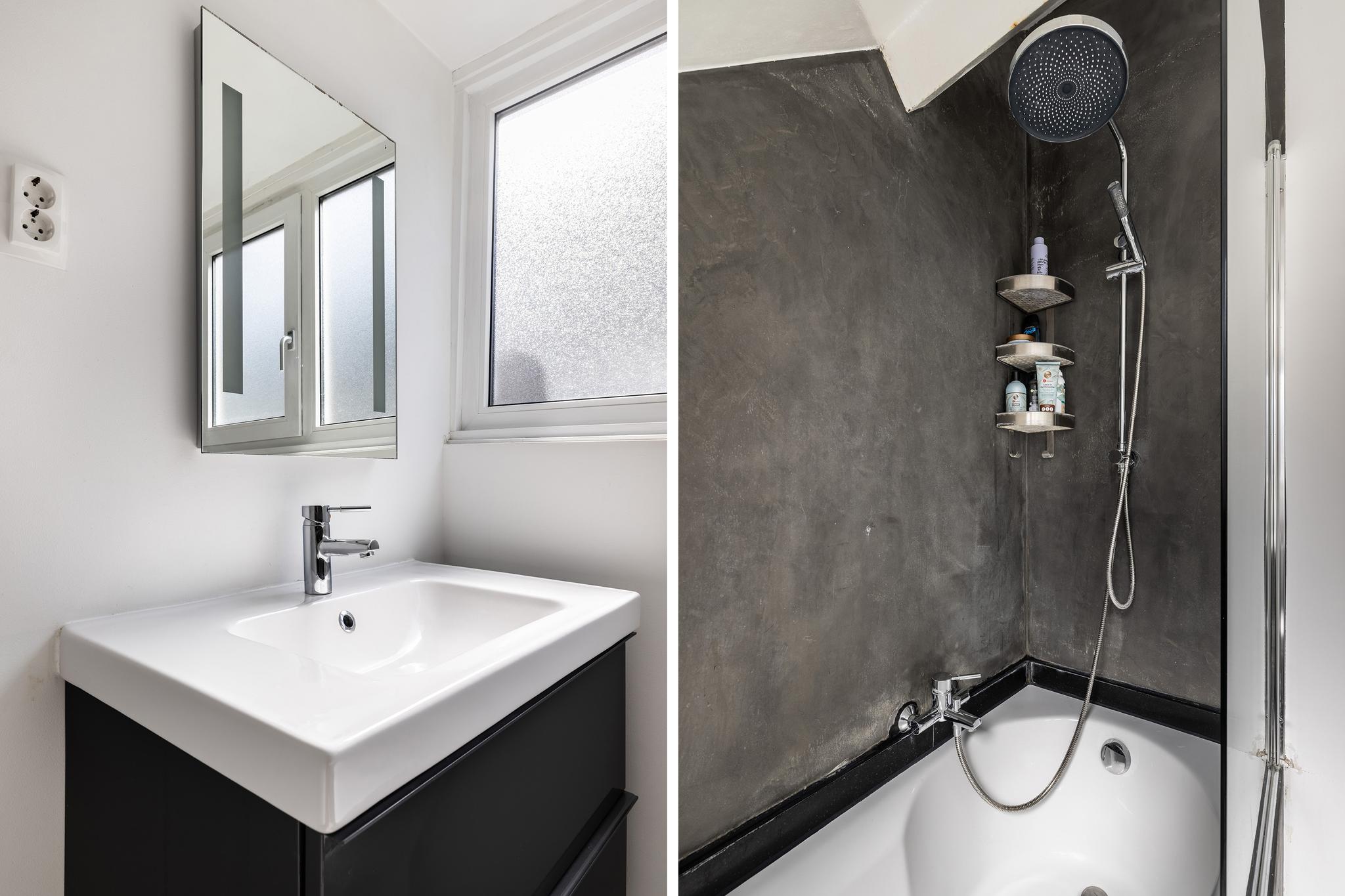 Badkamer (deels betegeld), ligbad, douche, toilet, wastafelmeubel, spiegel met verlichting, designradiator, dakkapel met een kunststof draaikiep raam.
