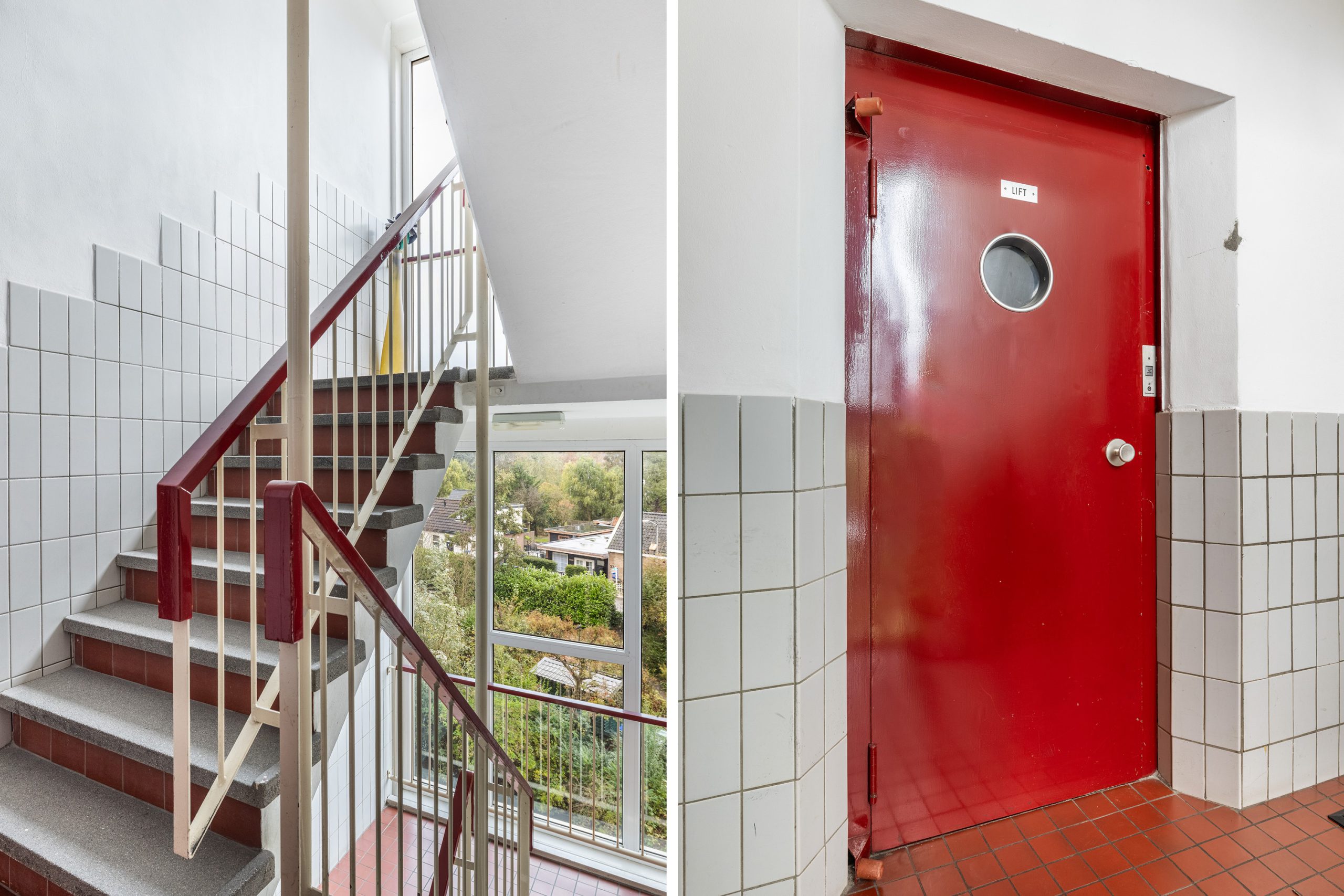 Entree via de afgesloten centrale hal met brievenbussen, bellentableau en toegang tot de lift, het trappenhuis en de bergingen van de woningen.