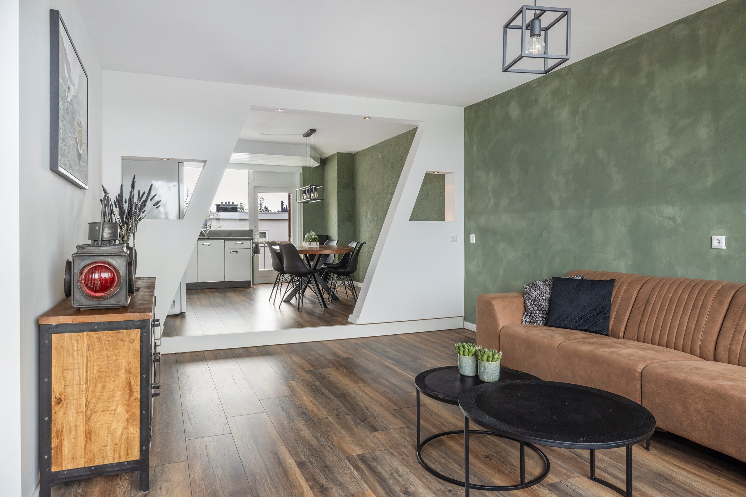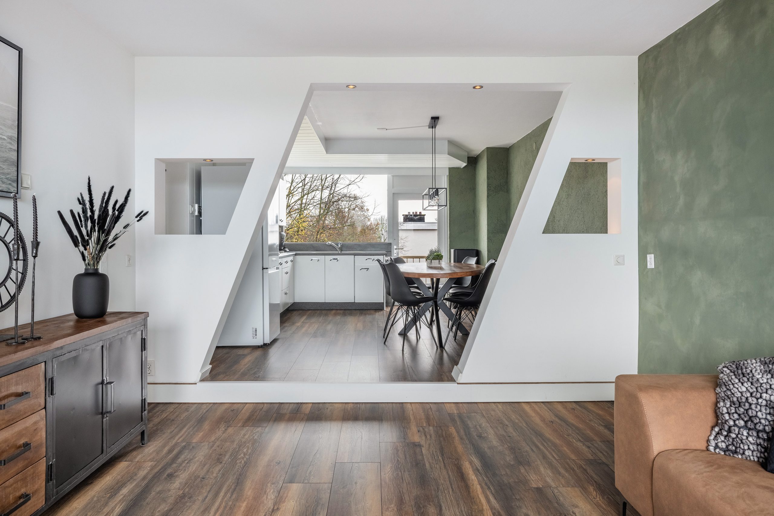 De woonkamer en 1 slaapkamer aan de voorzijde zijn samengevoegd waardoor je een enorme doorzon kamer hebt gekregen met aan de achterzijde waanzinnig vrij uitzicht en aan de voorzijde toegang tot de open keuken.