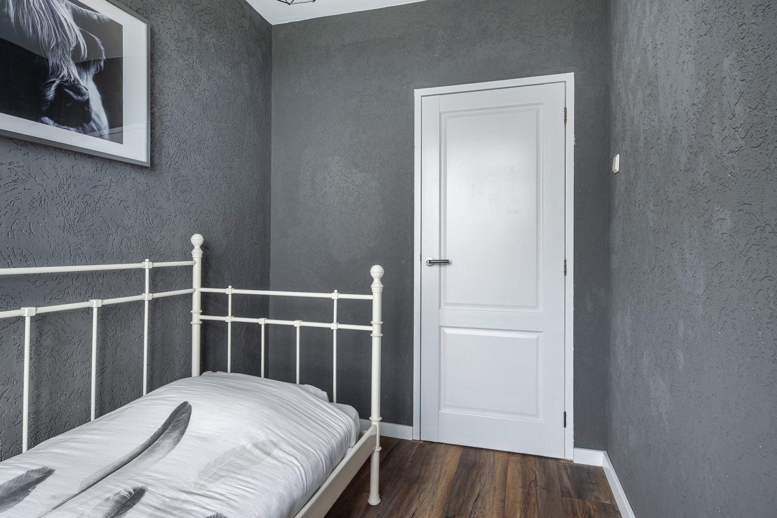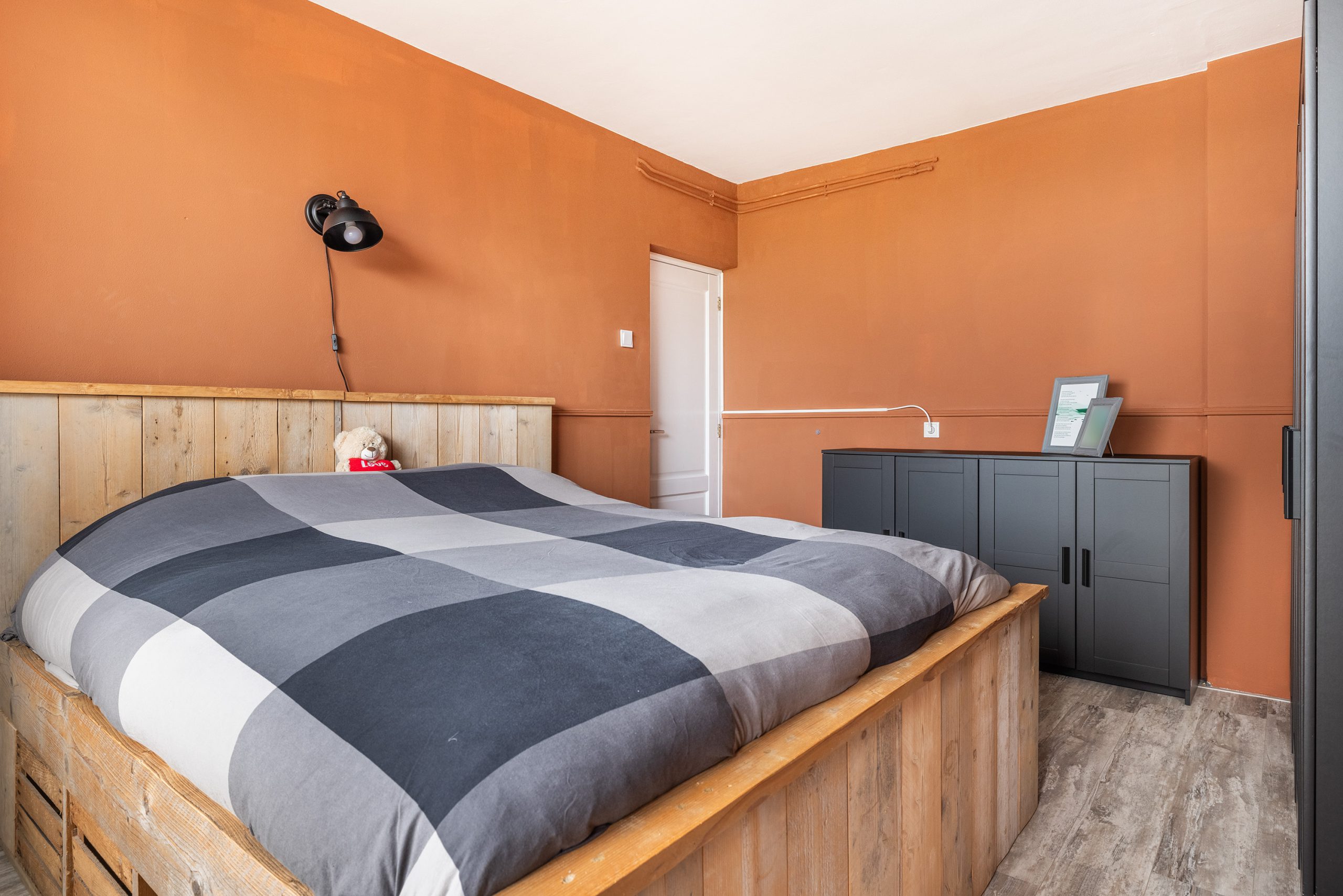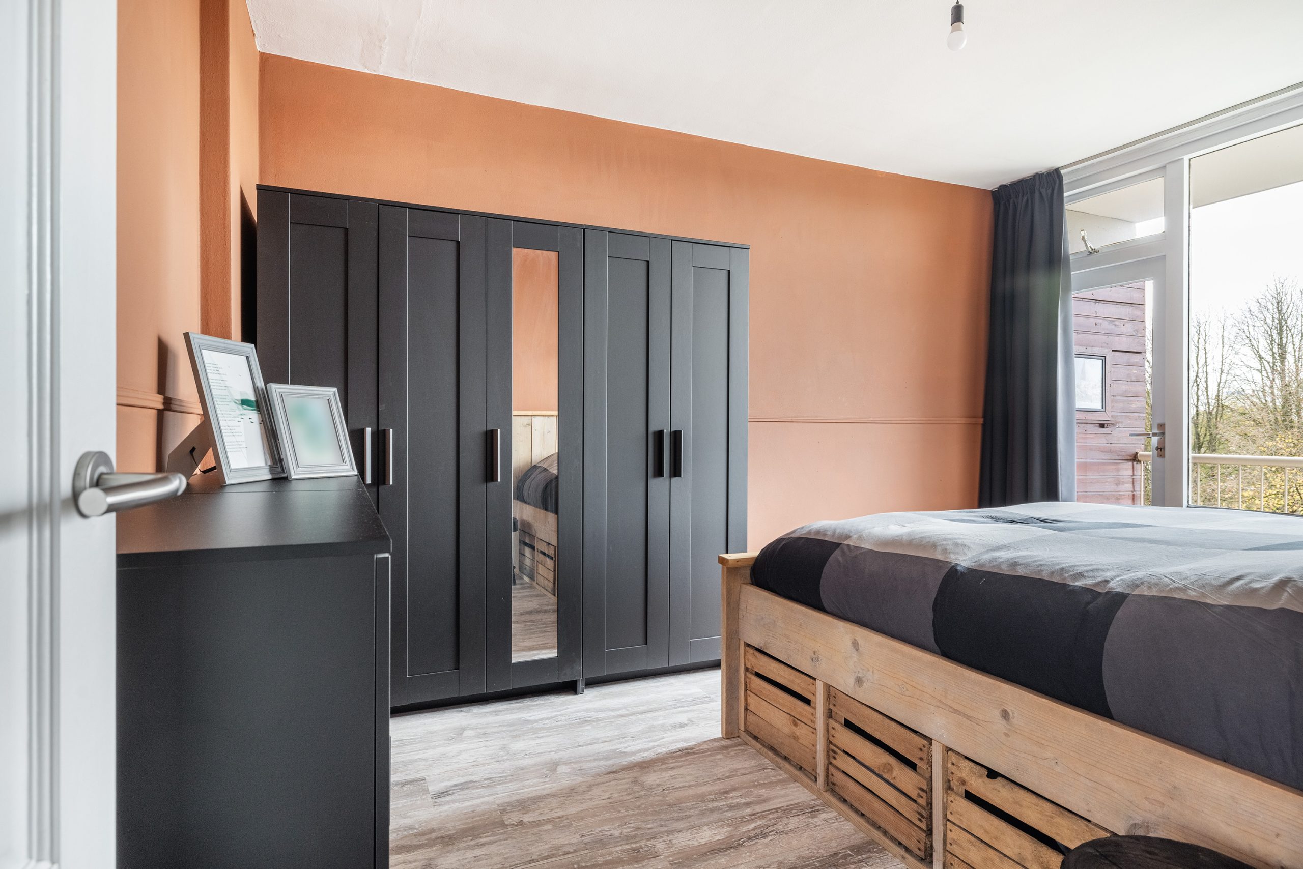 Slaapkamer 2 gelegen aan de voorzijde met stuc wanden en deur naar het pandbrede balkon aan de voorzijde. Op dit balkon is een vaste balkonkast aanwezig.