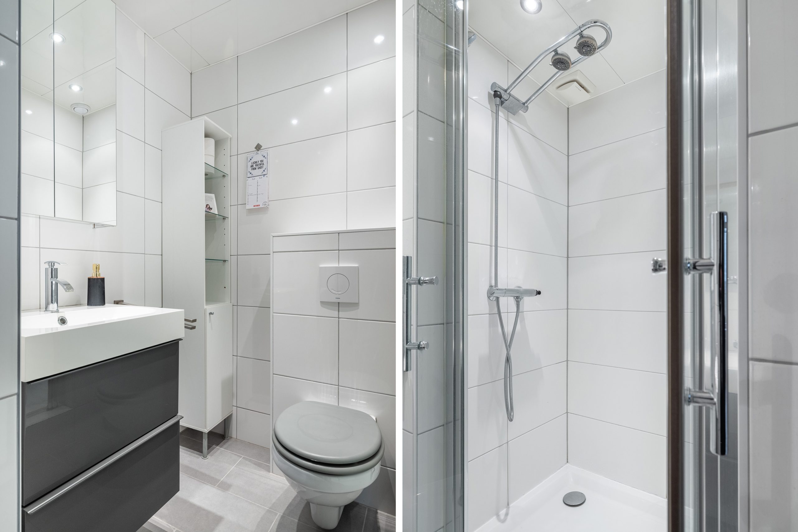 In deze woning zijn de badkamer en het toilet samengevoegd wat zorgt voor een royale badkamer met vrijhangend toilet, wastafel met meubel, douche met thermostaatkraan en schuifdeur. Geheel betegelde wanden. Verlaagd plafond met spot.