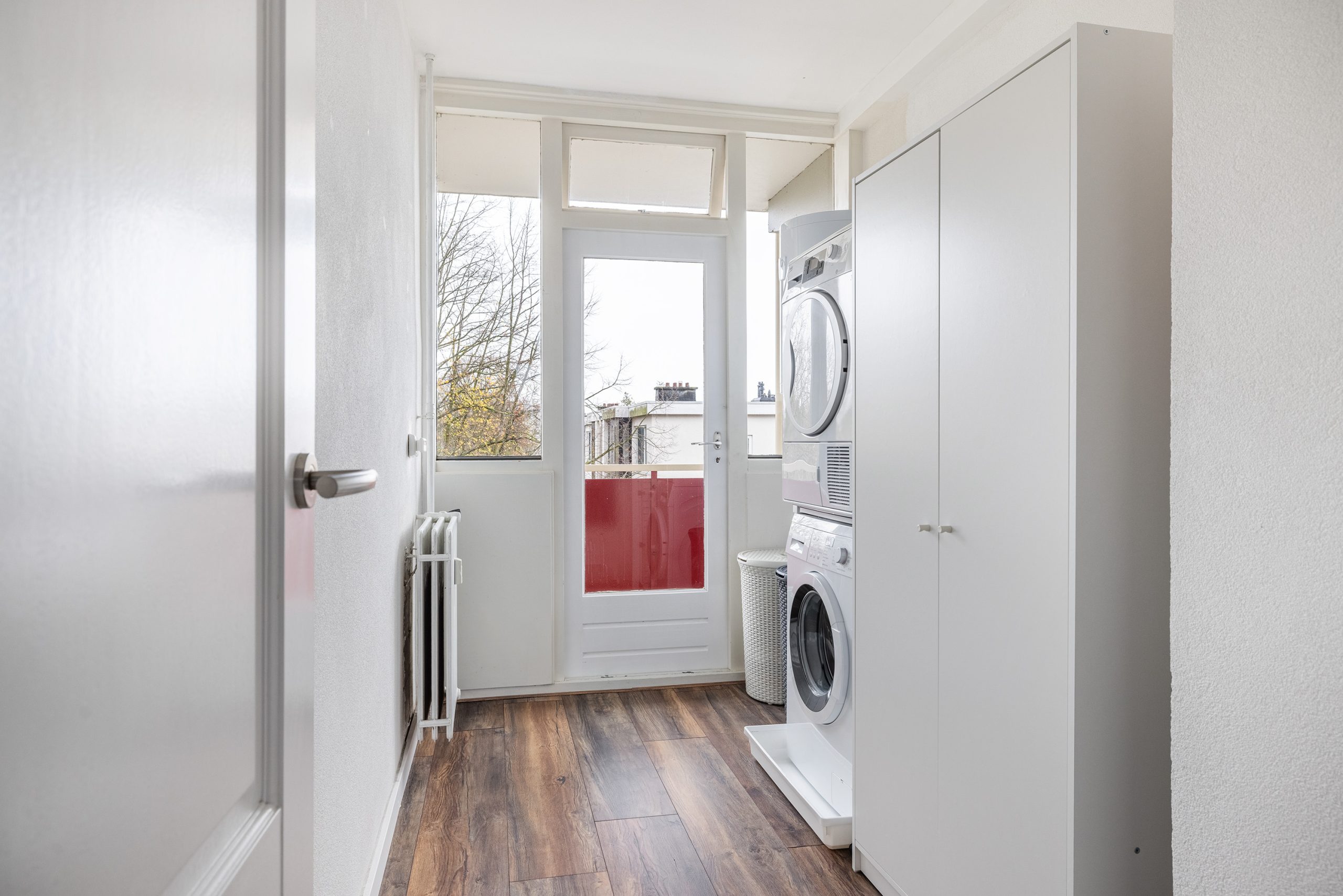 De voormalige keukenruimte is nu een bijkeuken geworden met opstelling was apparatuur en de Bosch boiler (geplaatst 2024), hier is een deur naar het balkon aanwezig.