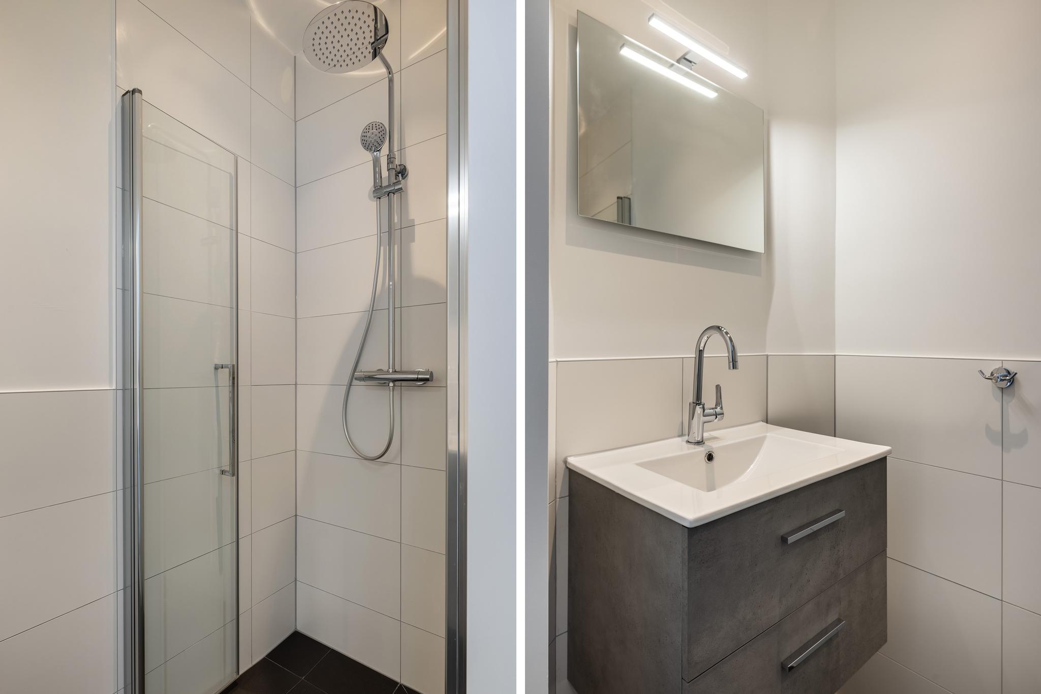 Inpandige badkamer met wastafel en meubel, grote inloop douche met thermostaat kraan en regen douche, verlaag de vond met spots.