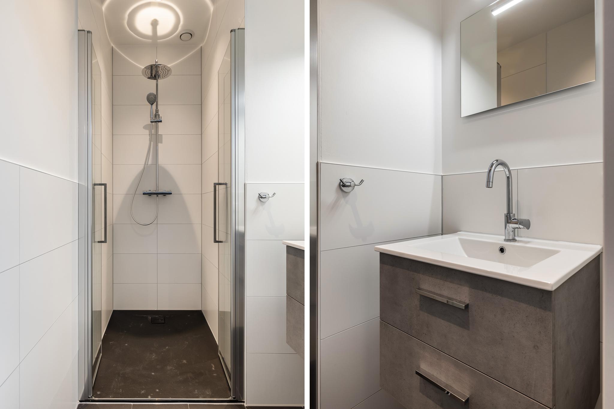 Inpandige badkamer met wastafel en meubel, grote inloop douche met thermostaat kraan en regen douche, verlaag de vond met spots.