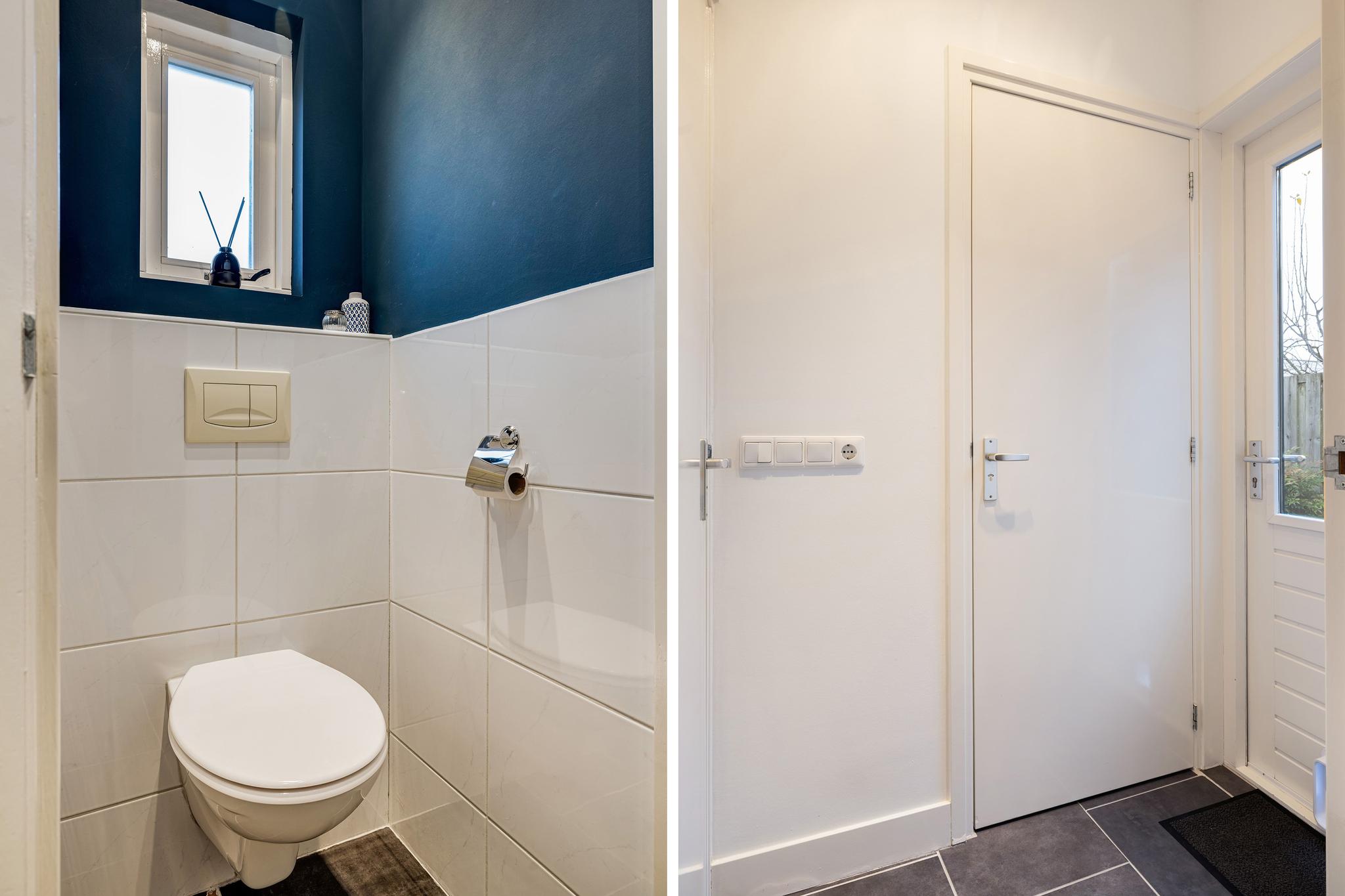 Vanuit het halletje achter de keuken is het toilet (half betegeld), de badkamer en de achtertuin bereikbaar.