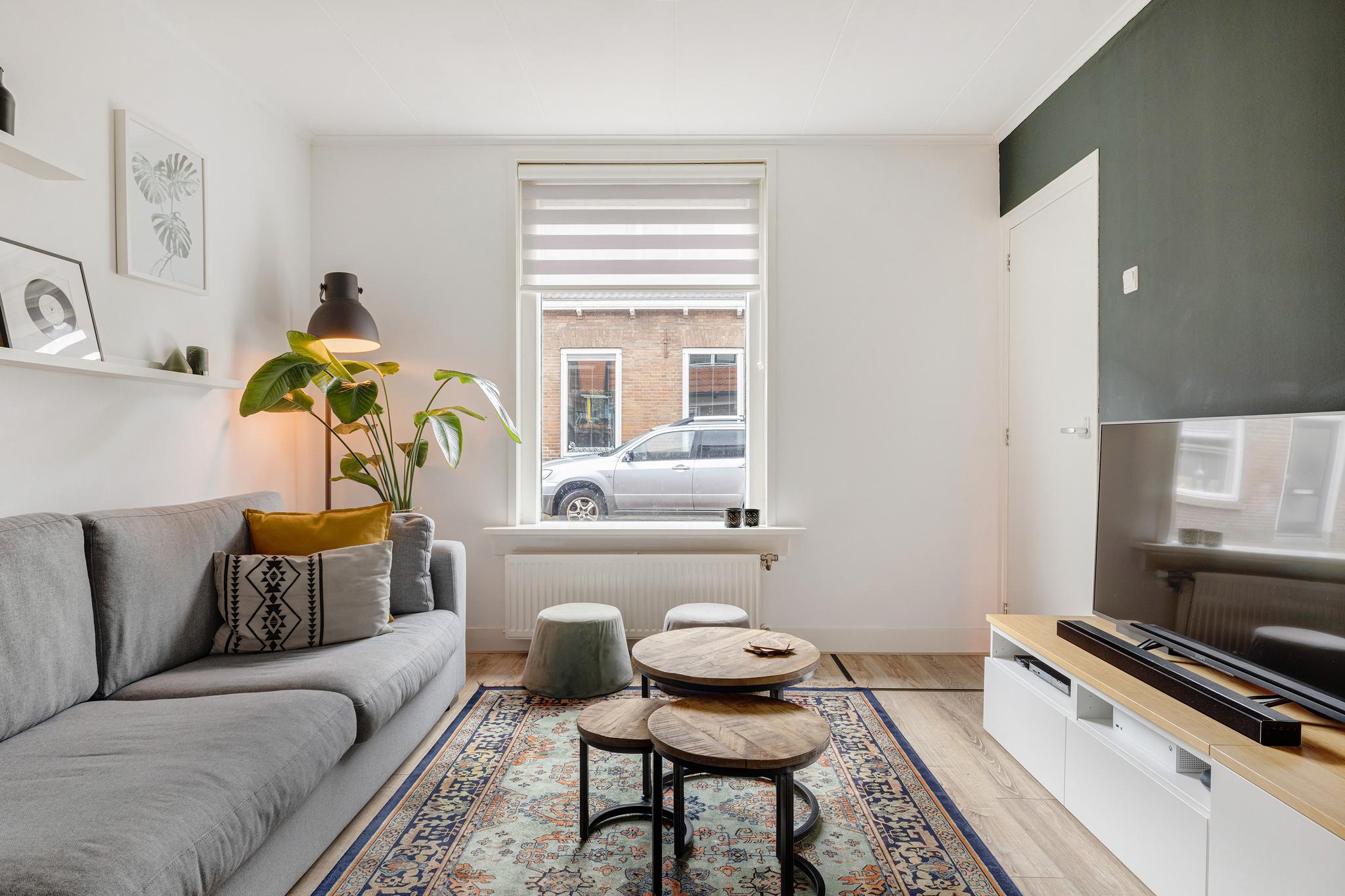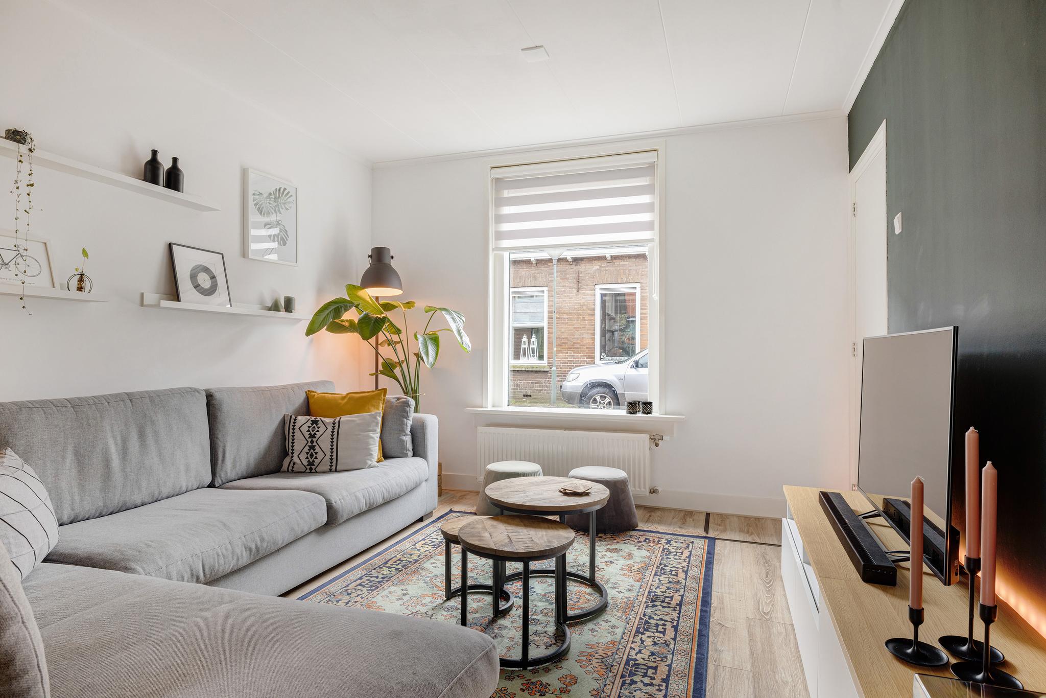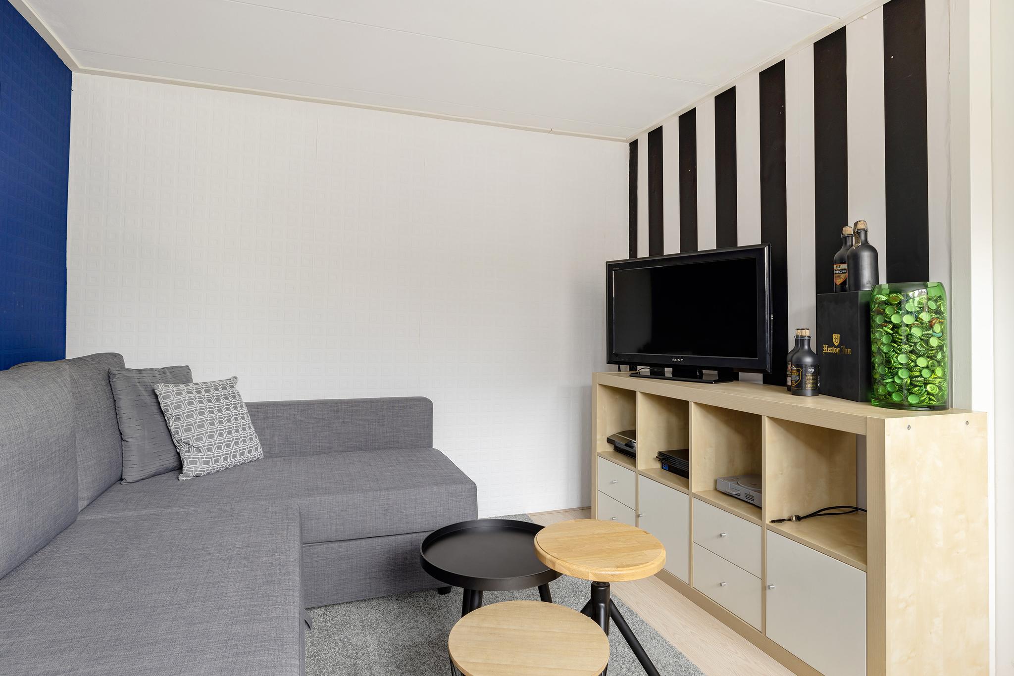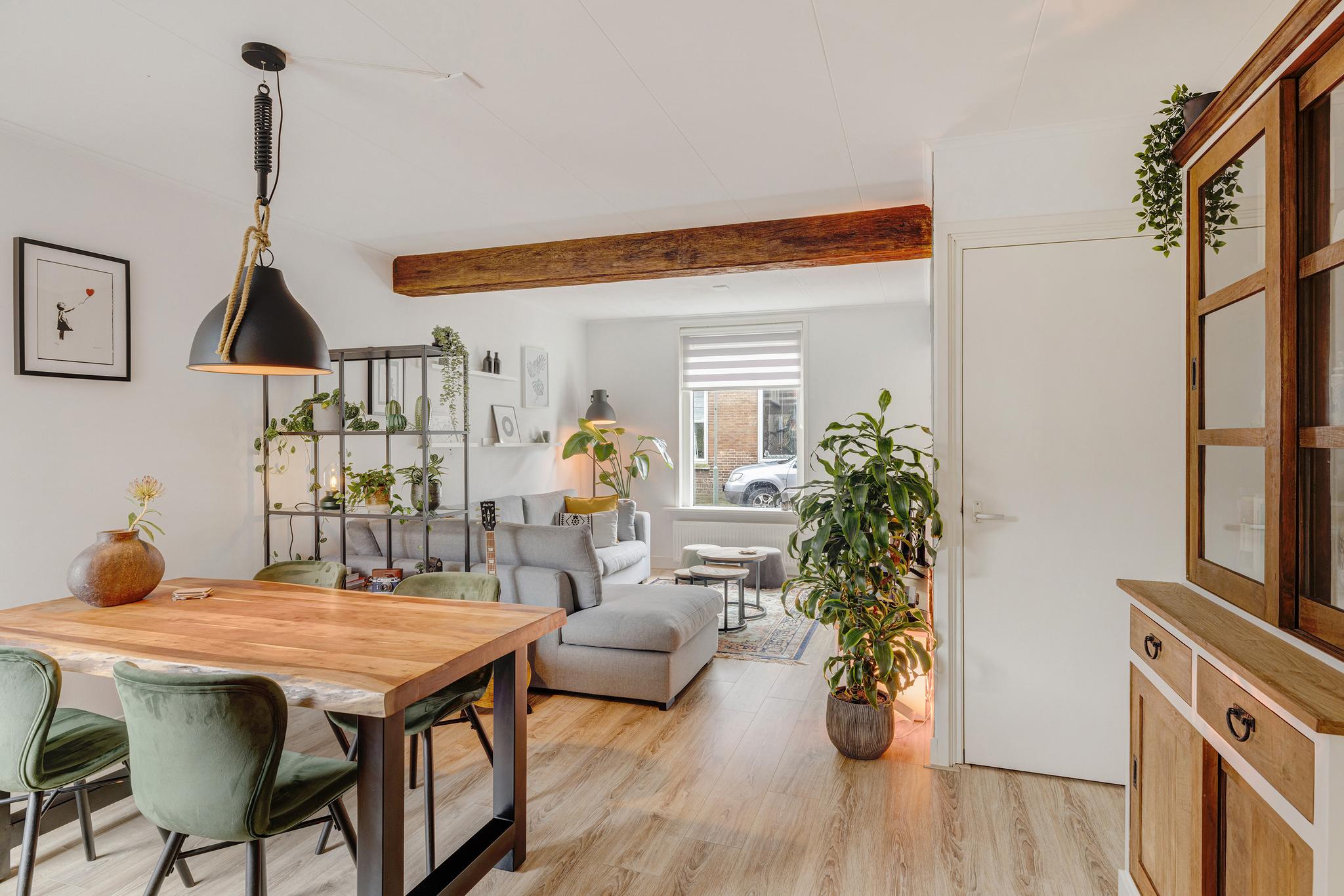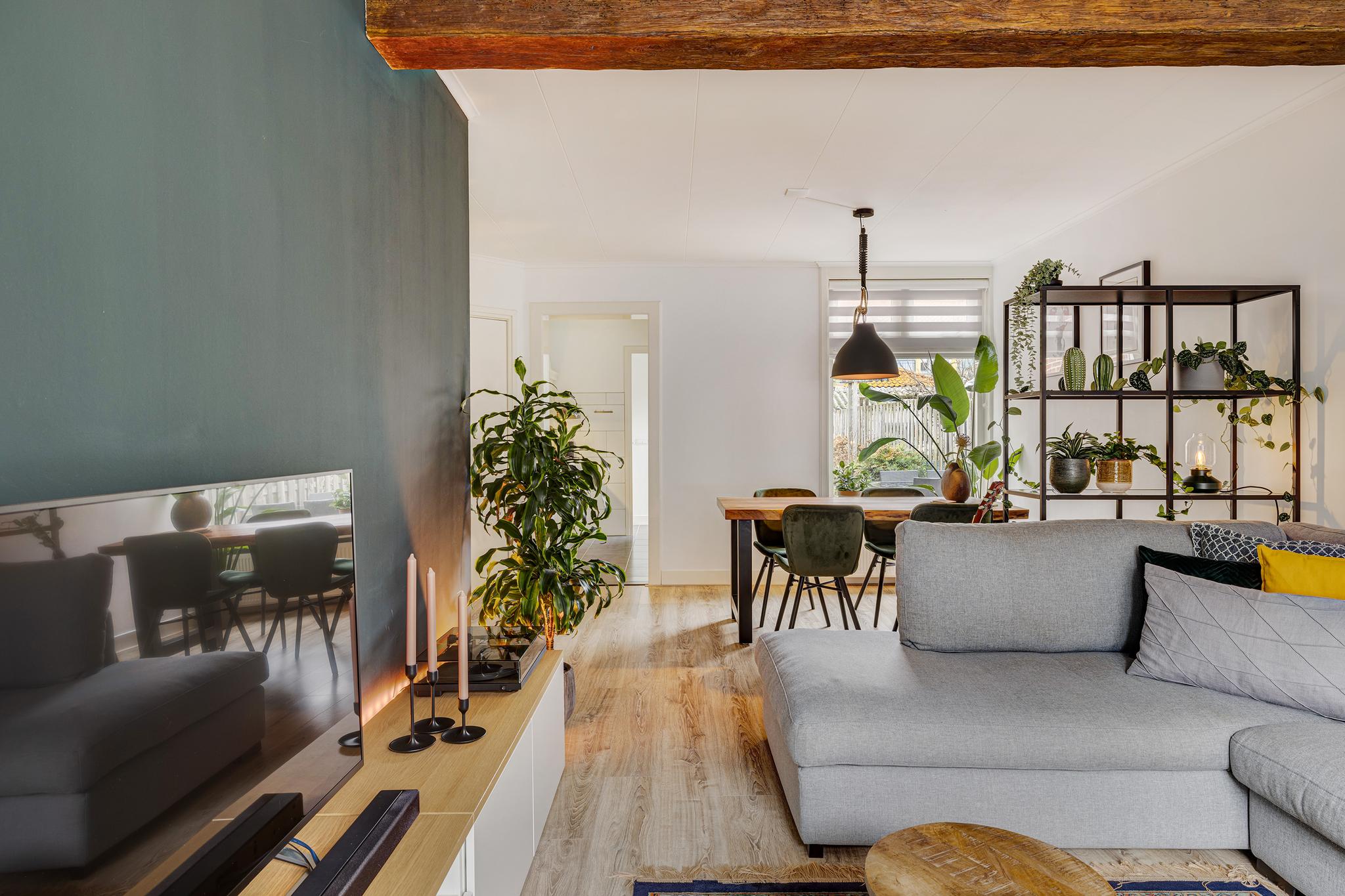 Ruime woonkamer met trapkast, extra bergkast, laminaatvloer, stucwerk, behang afwerking en toegang tot de aanbouw.