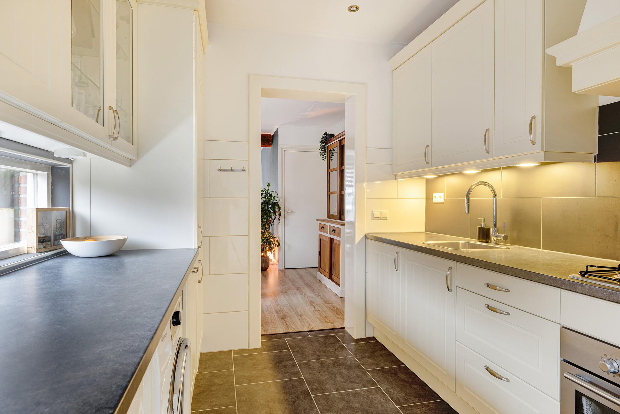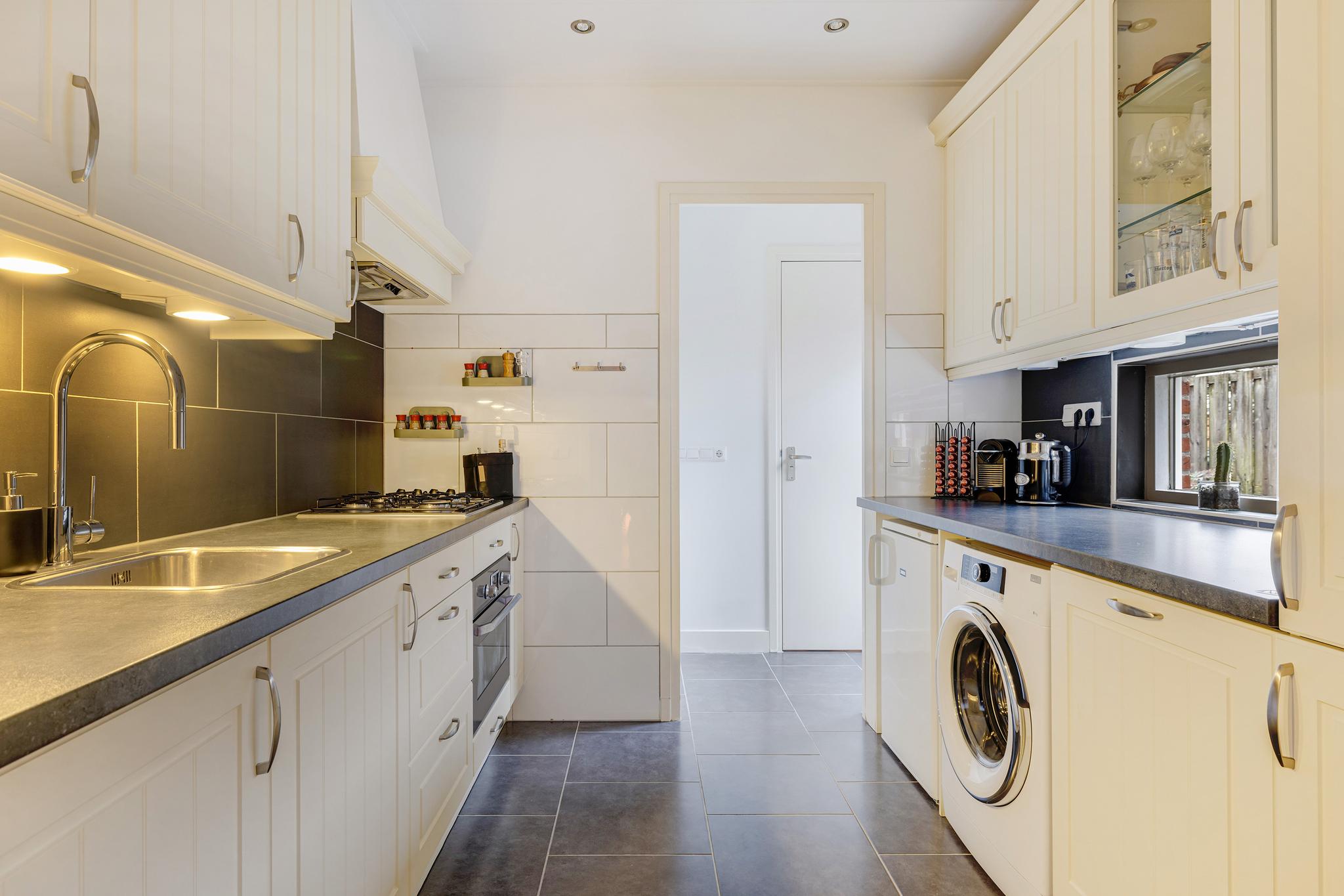 Aanbouw met keuken, betonvloer met vloerverwarming, gang met deur naar tuin. De keuken is uitgevoerd in dubbele wandopstelling en beschikt over een 4 pit gaskookplaat met afzuiging (naar buiten), koelkast, vaatwasser (2018), combi-oven (2018), losse vriezer (ter overname), wasaansluiting, fraai tegelwerk en inbouwspots.