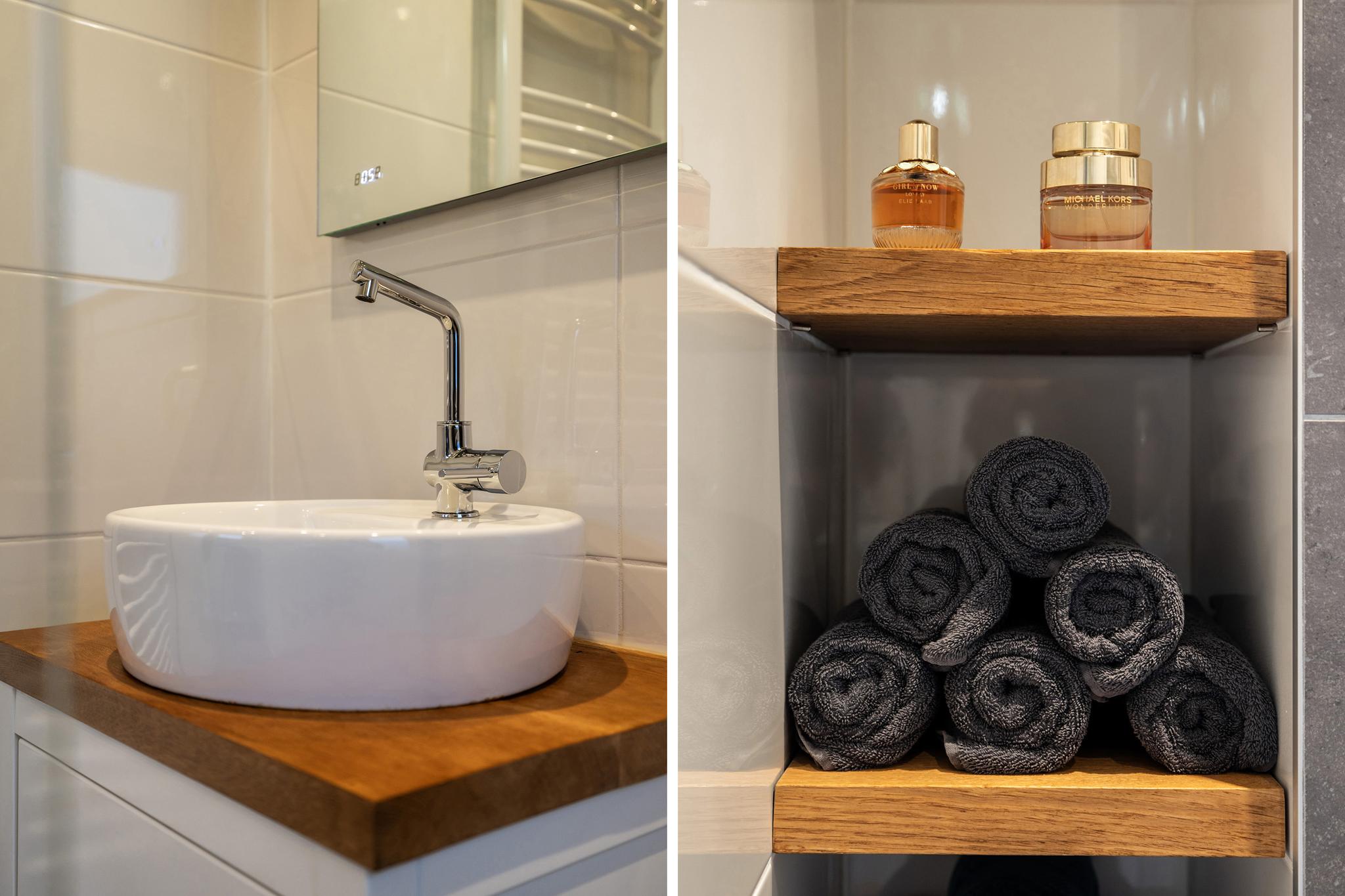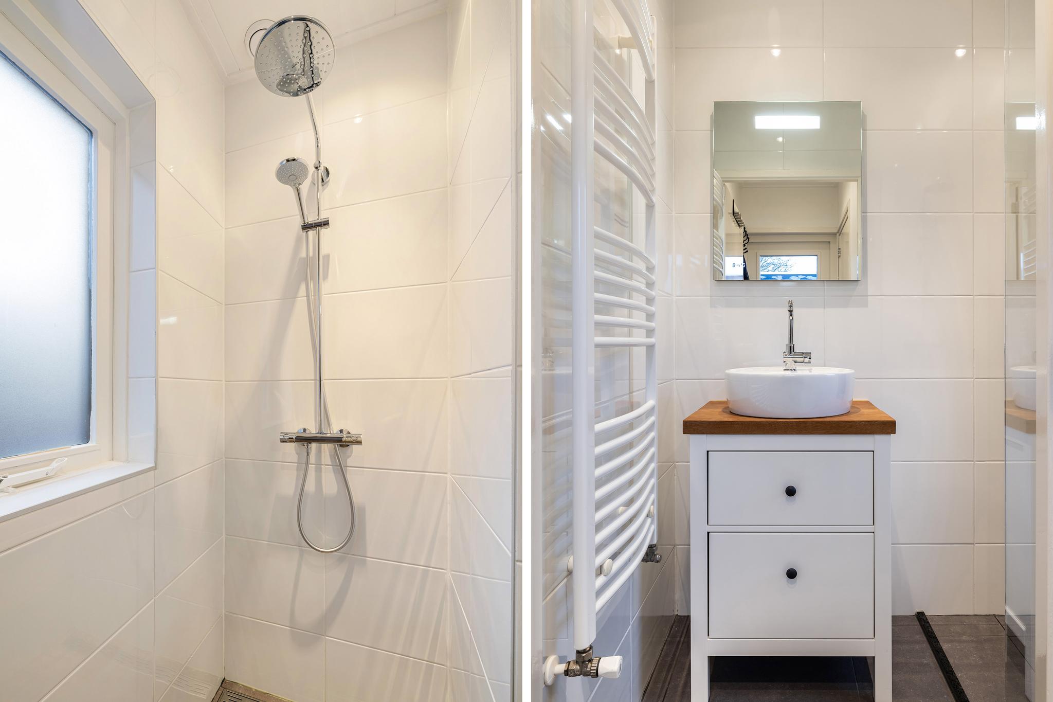 Badkamer met inloopdouche (met regendouche, thermostaatkraan), waskom op meubel, verlichte spiegel, designradiator en mechanische ventilatie.