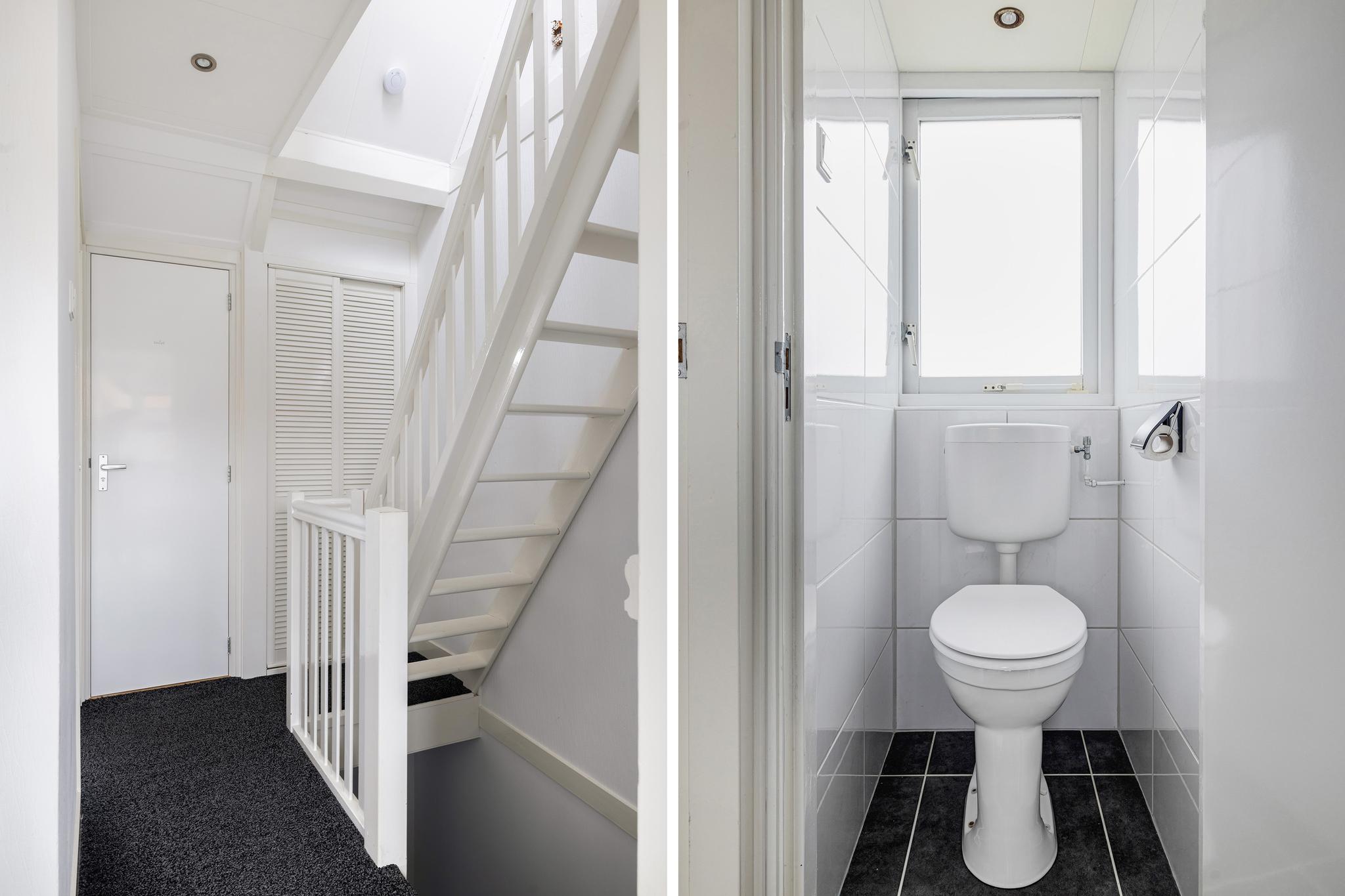 Overloop, vloerbedekking, bergkast met opstelplaats CV-ketel (Remeha avanta, 2016), toilet (volledig betegeld) en toegang tot de slaapkamers.
