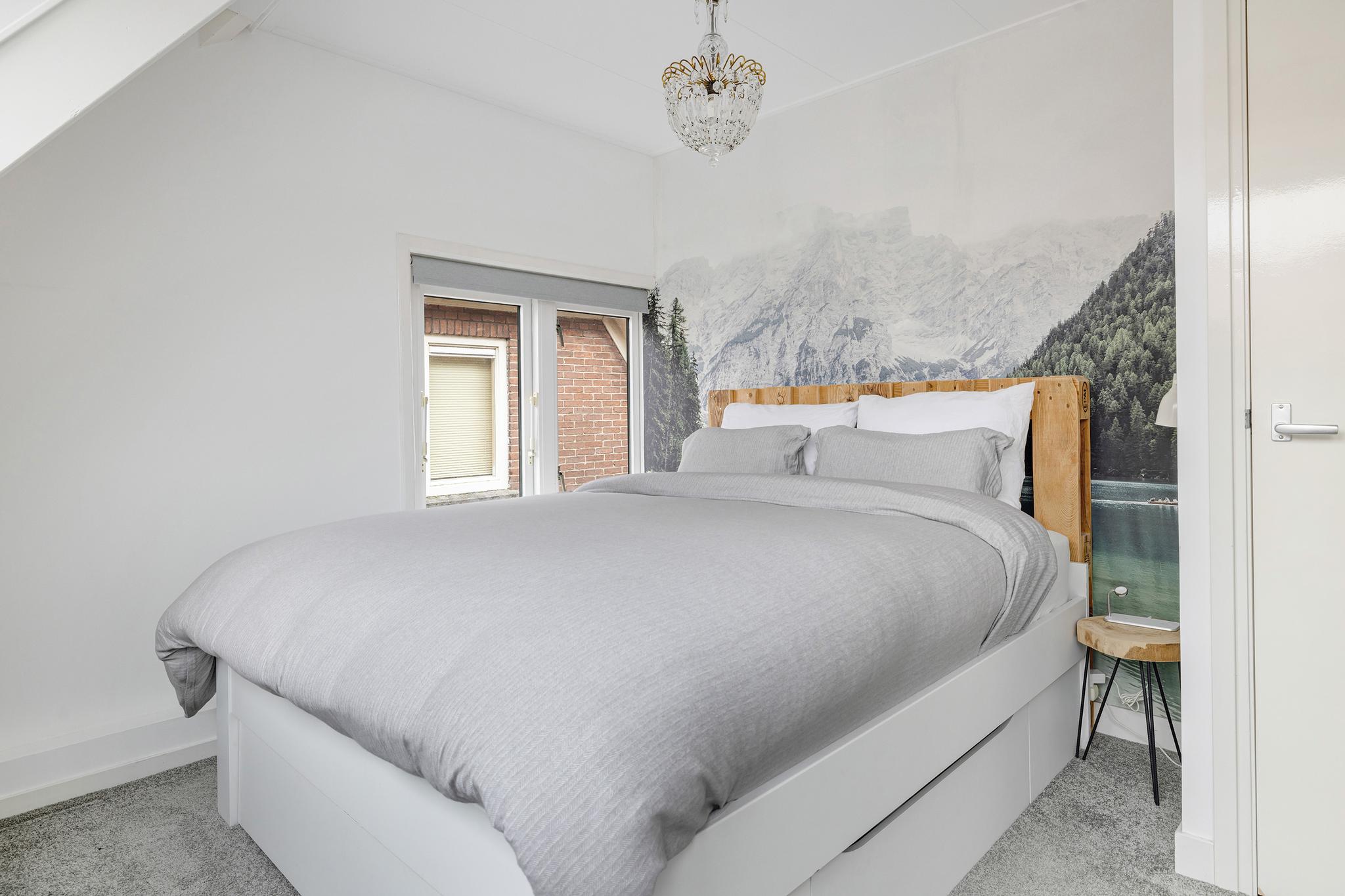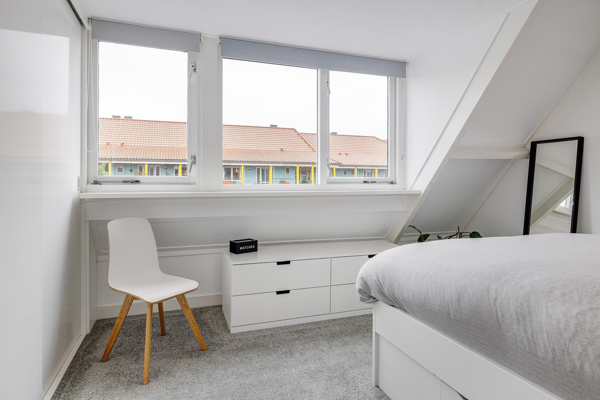 Slaapkamer aan voorzijde, eveneens met vloerbedekking en een dakkapel.