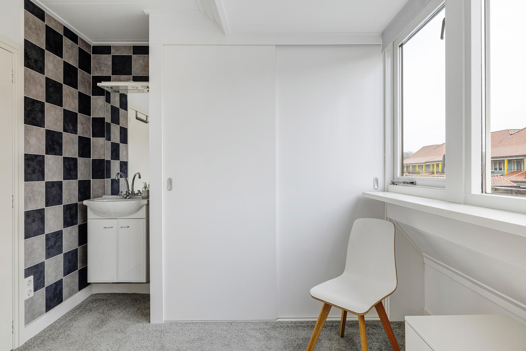 Grote slaapkamer aan achterzijde met dakkapel, wastafel met meubel, schuifkastenwand en vloerbedekking.
