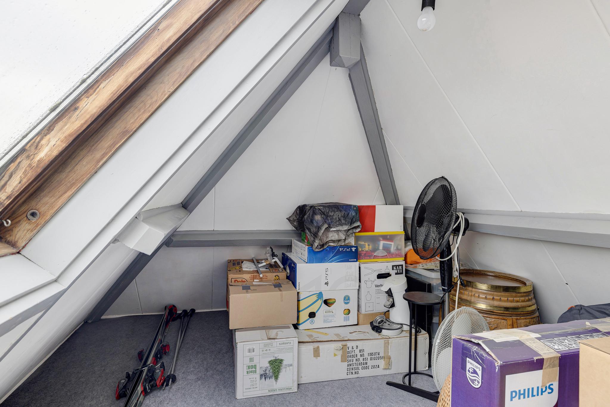 Zolderverdieping met vloerbedekking en dakraam. Deze ruimte wordt in verband met afmetingen niet tot de woonruimte gerekend, maar is goed te gebruikten als bergruimte of bijvoorbeeld als speelruimte voor de kinderen.