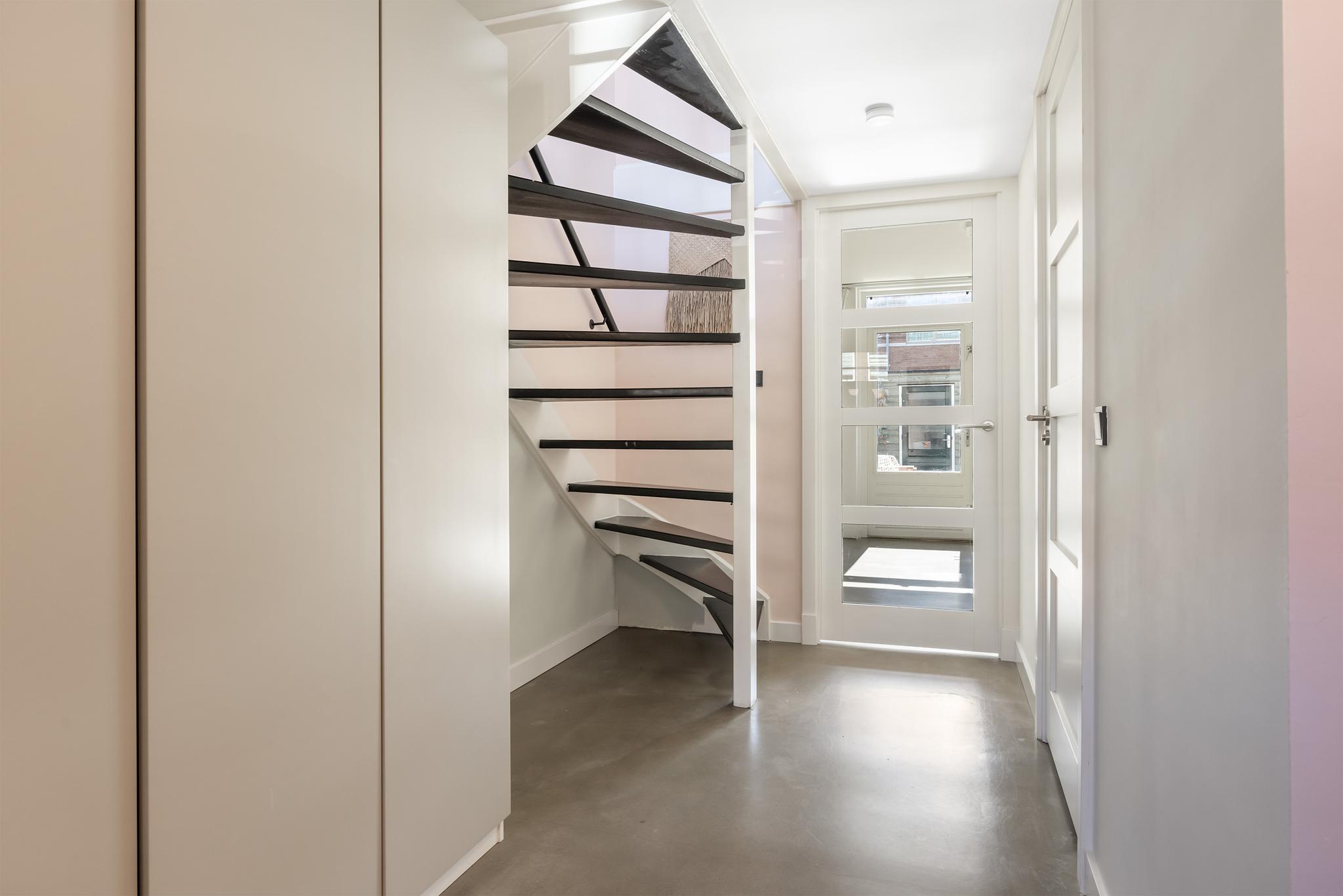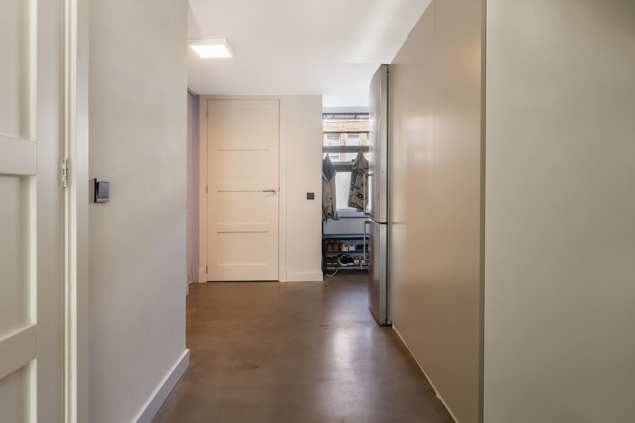 Ruime hal met toegang tot alle vertrekken en trap naar woonverdieping. Aan de voorzijde is een was- en bergruimte gecreëerd, deze is middels een gordijn af te sluiten. De betonvloer is op deze verdieping afgewerkt met egaline, wat zorgt voor een strakke en moderne look. Verder is de gehele verdieping voorzien van vloerverwarming.