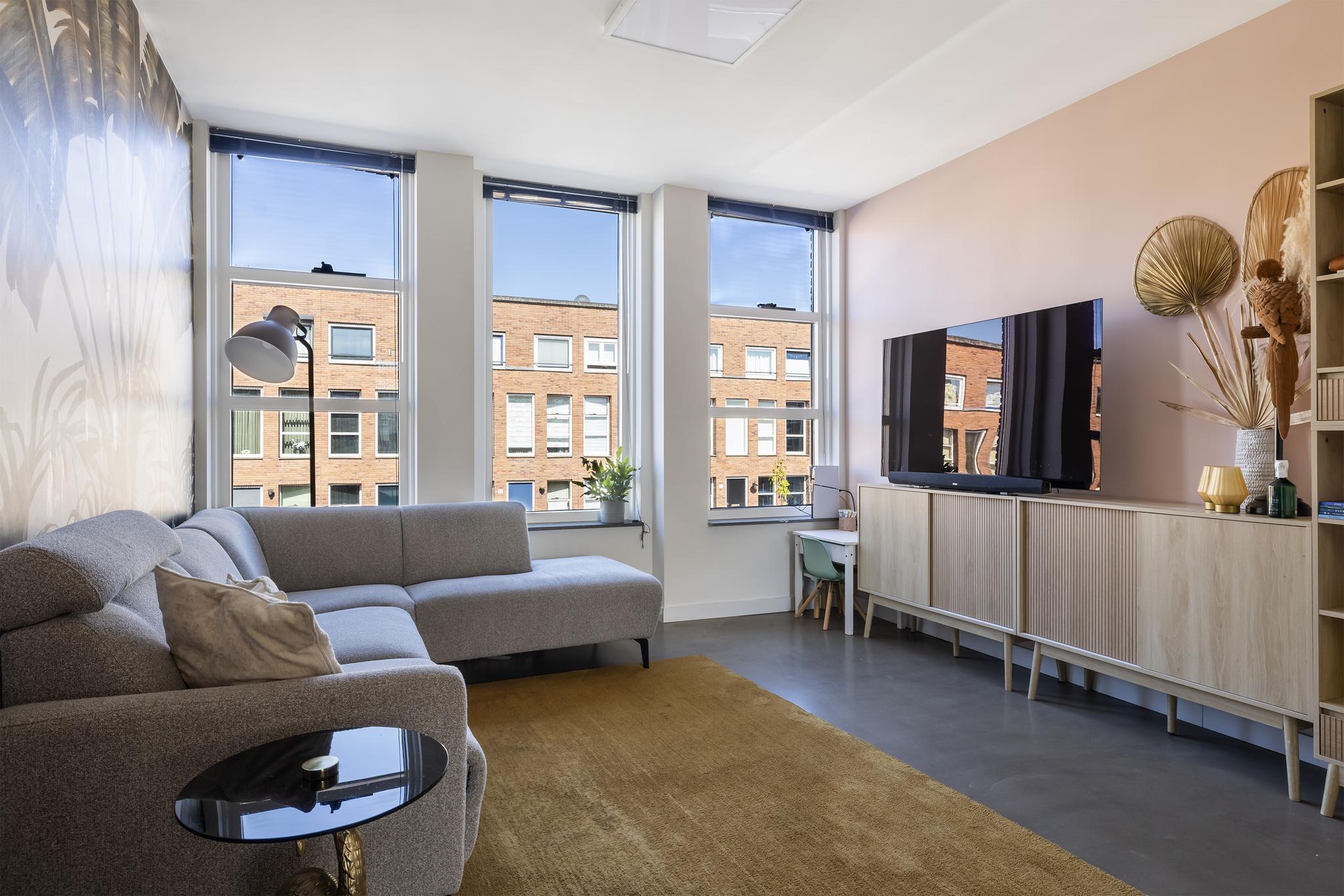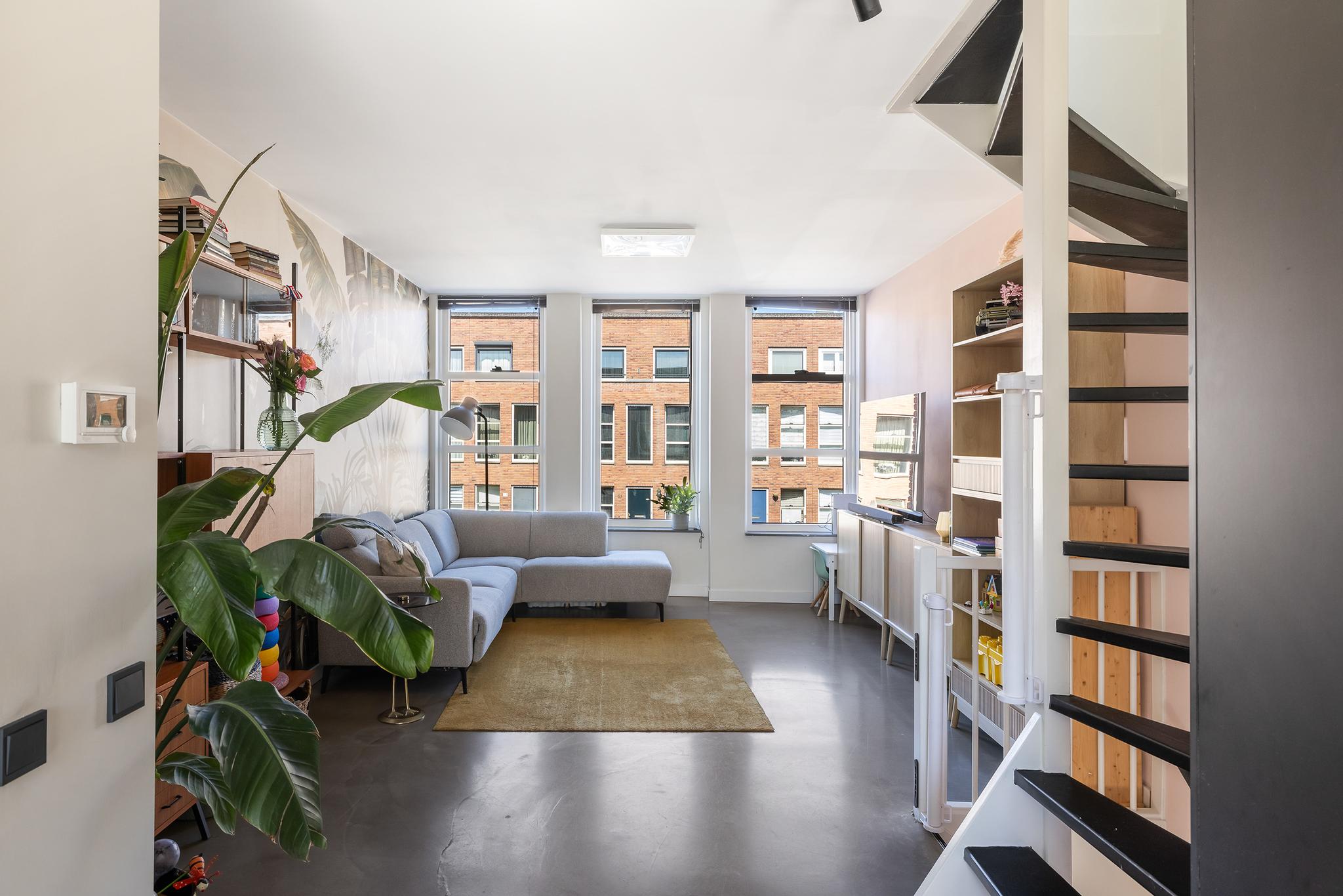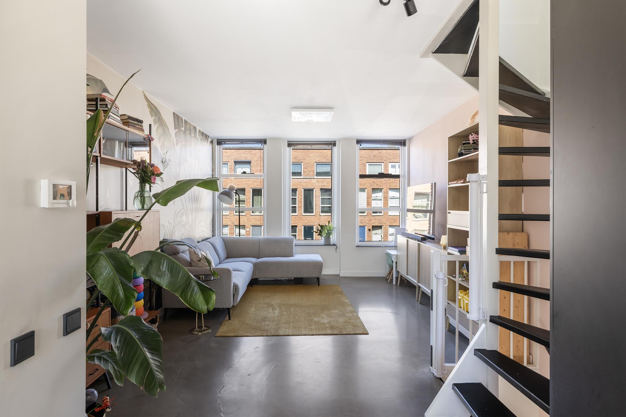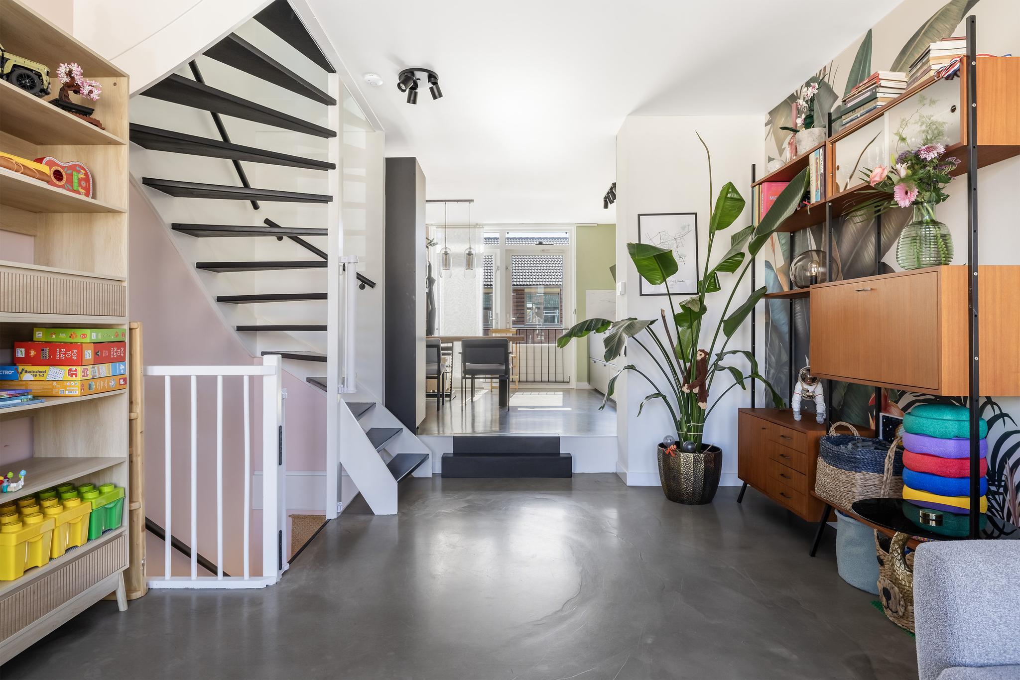 De gehele 1e verdieping is in gebruik als woonverdieping, met aan de voorzijde een ruime en lichte woonkamer en aan de achterzijde een fijne leefkeuken. De woonkamer wordt gekenmerkt door de grote raampartijen en de erker aan de voorzijde, dit brengt veel sfeer in deze ruimte. Ook op deze verdieping is de betonvloer afgewerkt met een egaline-laag, waardoor een strakke en industriële vloer is ontstaan, geheel voorzien van vloerverwarming. De wanden van de woonkamer zijn glad afgewerkt en deels behangen. Het plafond is eveneens glad afgewerkt.