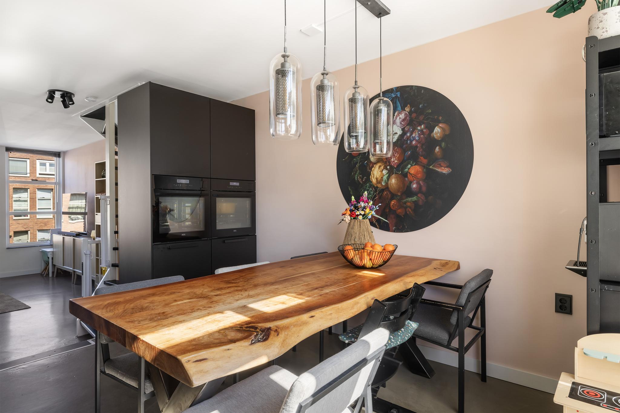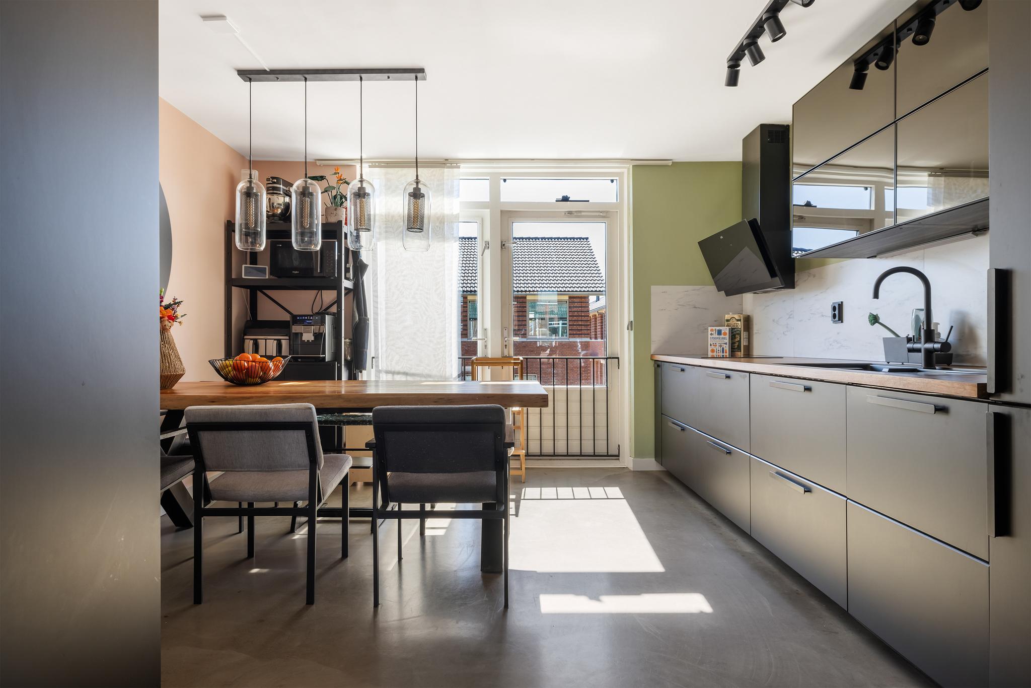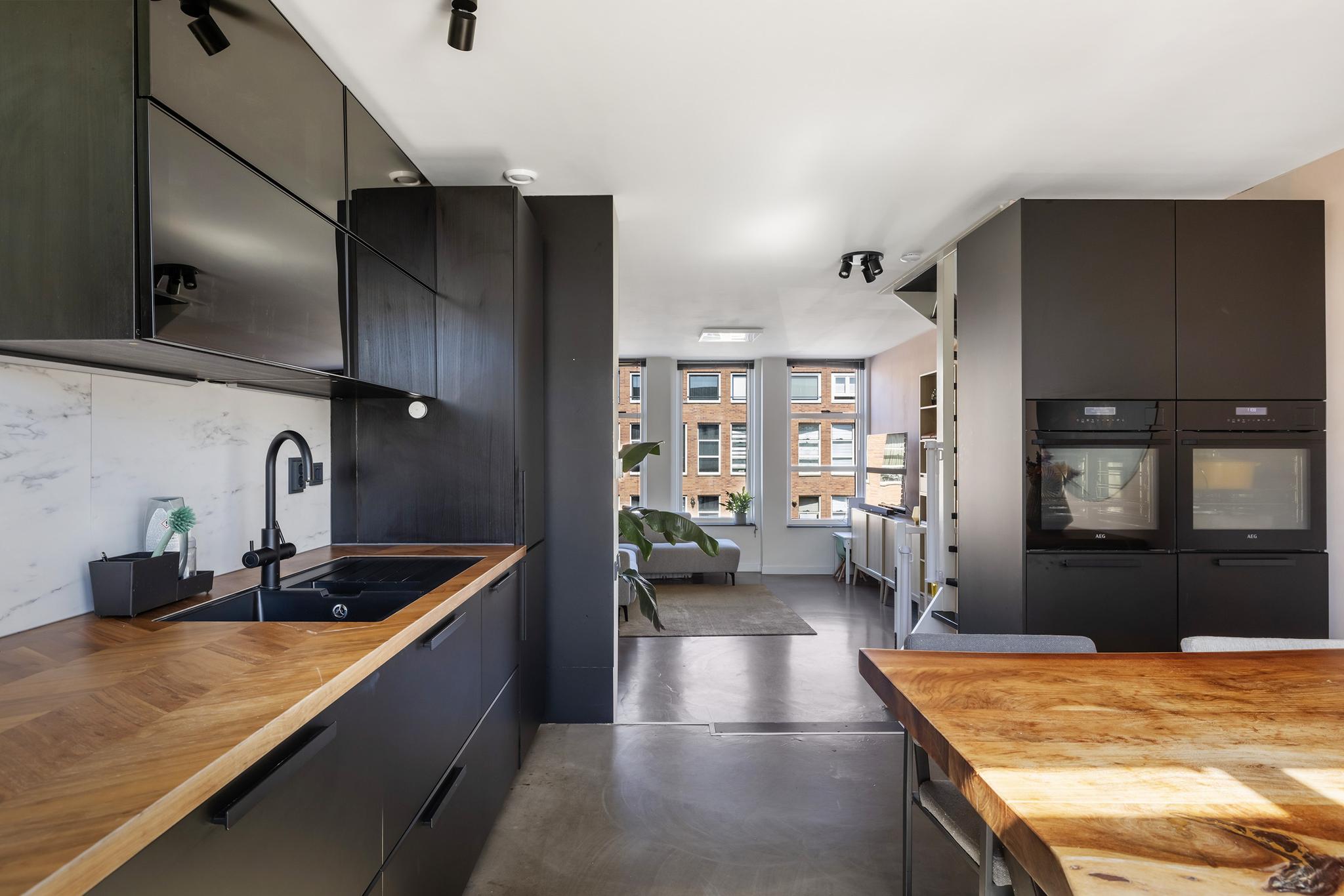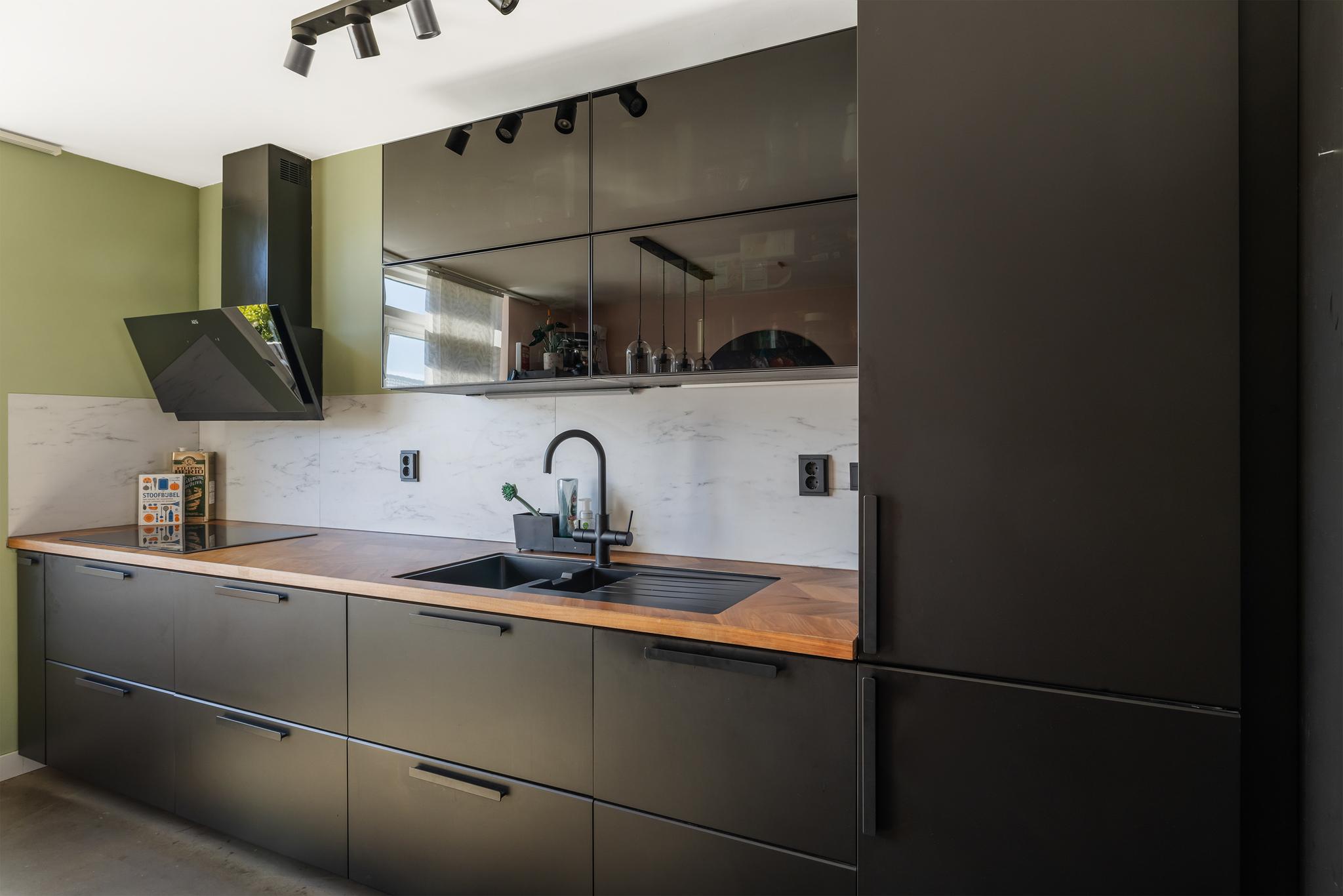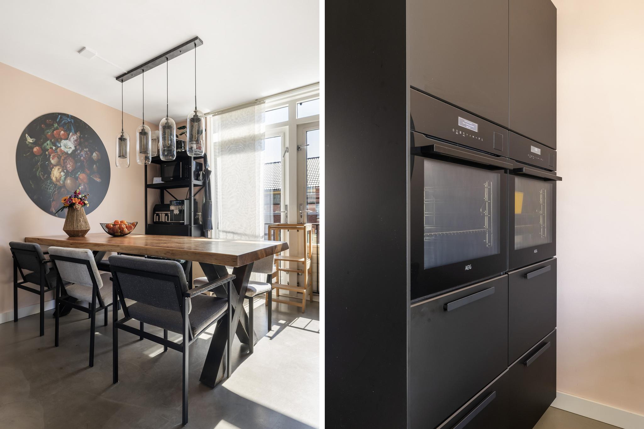 De lichte leefkeuken aan achterzijde ligt iets hoger dan de woonkamer. In 2019 is de keuken geheel vernieuwd, deze omvat een wandopstelling voorzien van inductie kookplaat met afzuigkap, koel-vriescombinatie, vaatwasser, kokend-waterkraan en veel bergruimte. In een apart kastendeel zijn twee stoomovens ingebouwd en is wederom veel bergruimte aanwezig. Alle inbouwapparatuur is van het merk AEG.