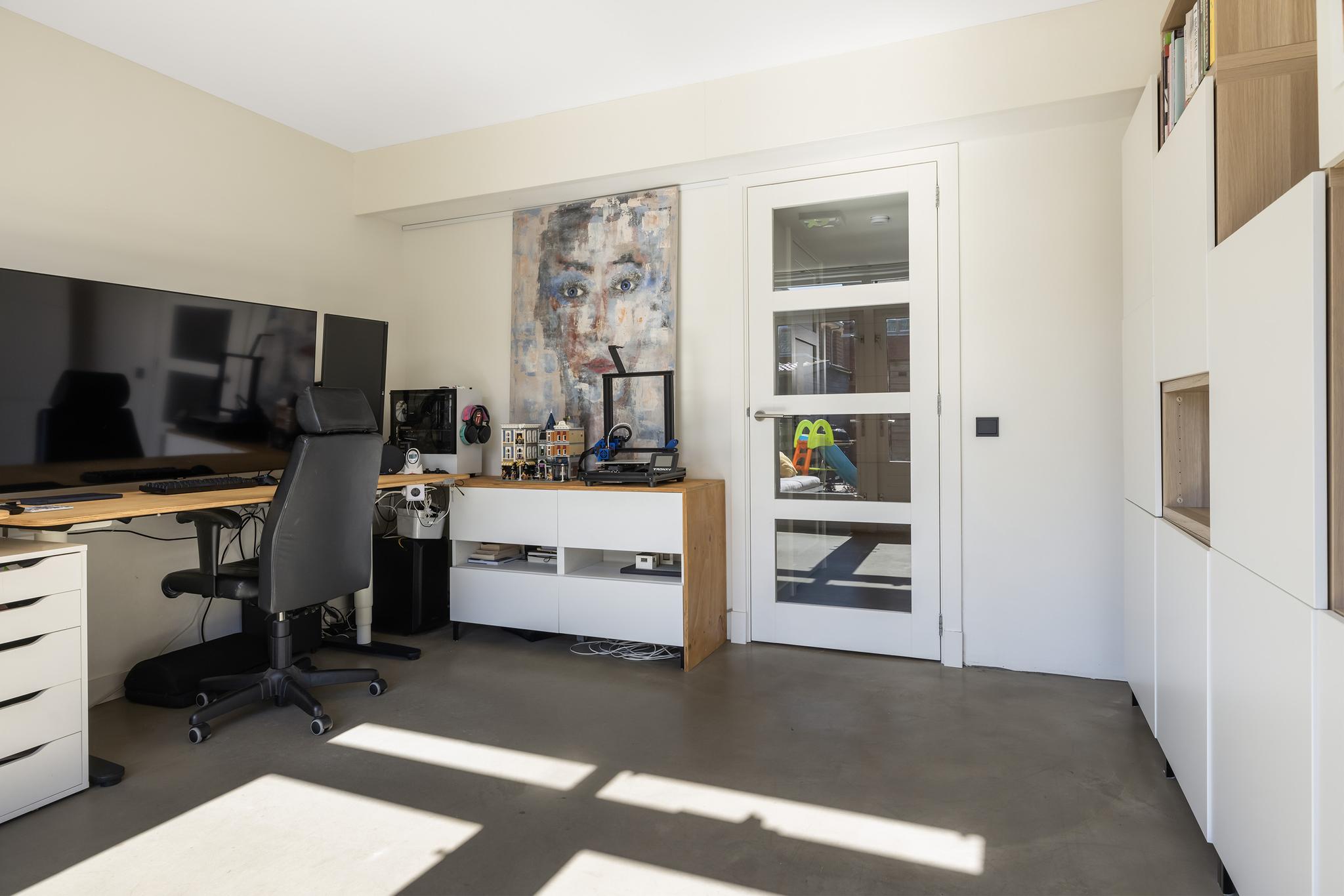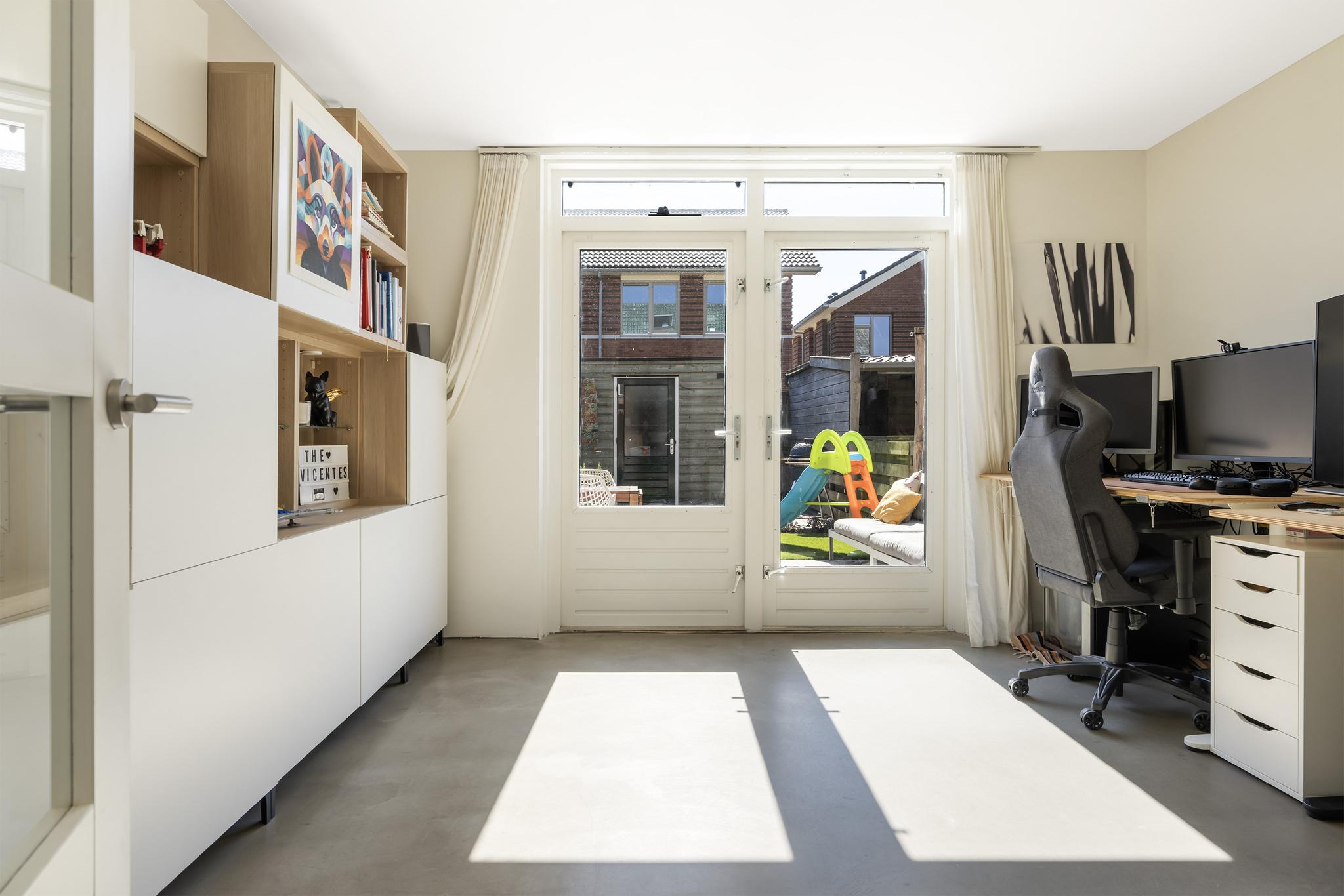Ruime tuinkamer aan achterzijde, deze wordt momenteel als werkruimte gebruikt maar zou ook goed kunnen dienen als slaapkamer. Via dubbele deuren heb je vanuit deze kamer toegang tot de achtertuin. Verder zijn de wanden glad afgewerkt.