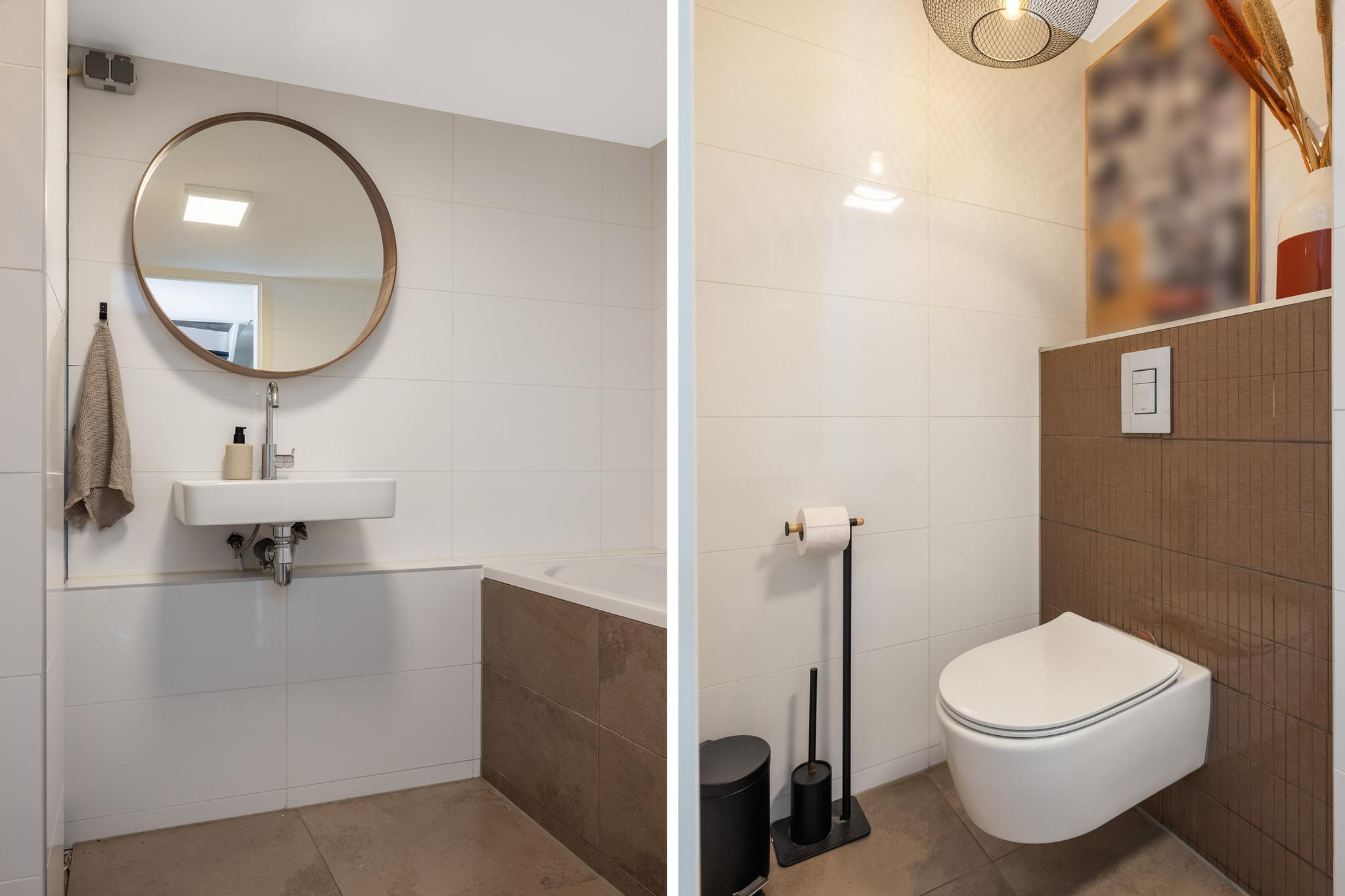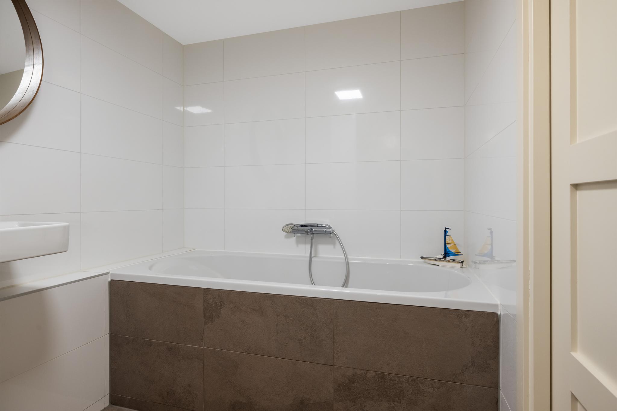 De badkamer op de begane grond beschikt over een ligbad met thermostaatkraan, wastafel met spiegel, toilet en de opstelplaats CV-ketel (Remeha Avanta, 2012). De badkamer is volledig betegeld, waarbij gebruik is gemaakt van een neutrale kleurstelling.