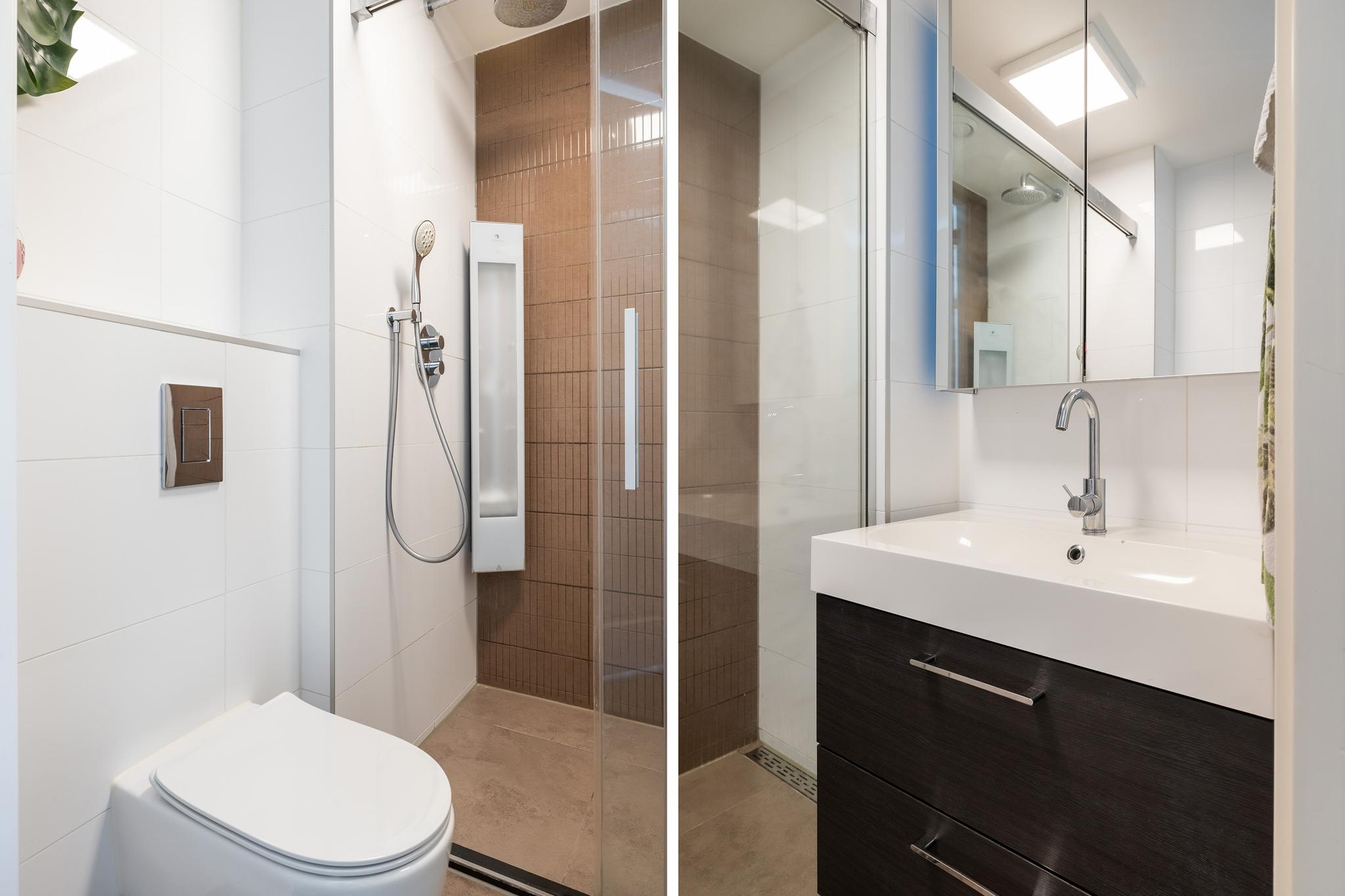 De inpandige badkamer is volledig betegeld en voorzien van een ruime douche met schuifdeur en thermostaatkraan, toilet, wastafelmeubel en een spiegelkast. Het Sunshower systeem in de douche is ter overname.